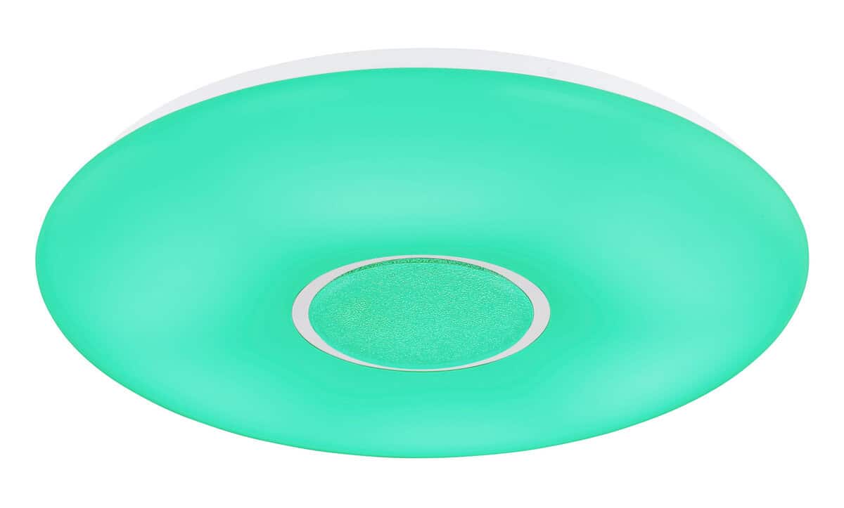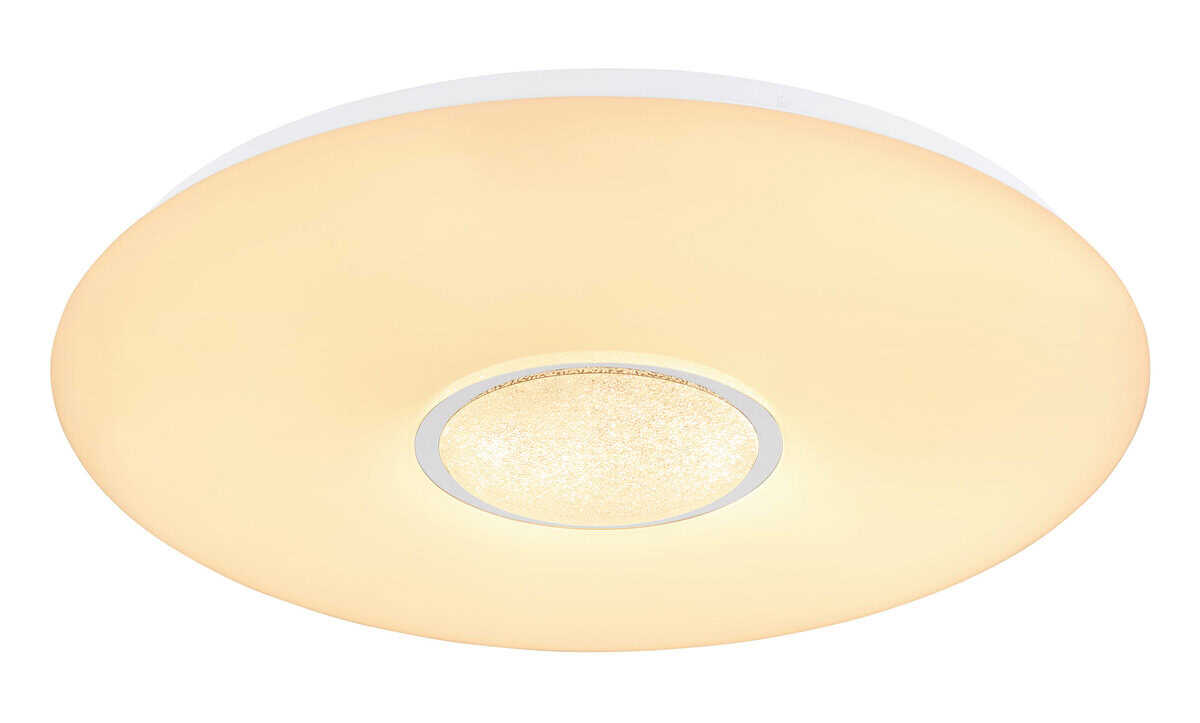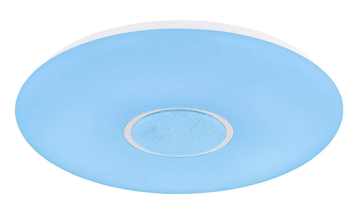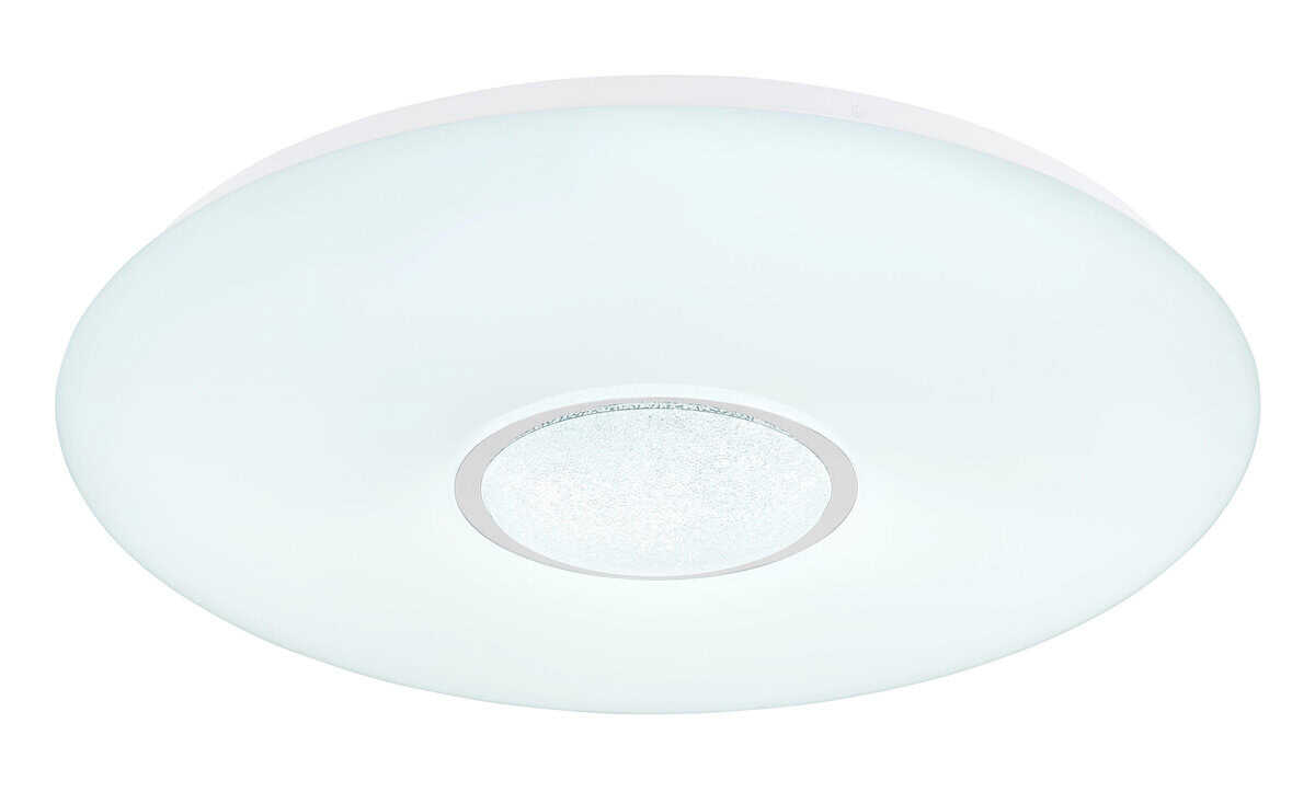 Ova okrugla plafonska lampa iz serije Sully (ø 49 cm) odlična je za vaš enterijer. Sastoji se od opal plastičnog prstena, koji je metalnim prstenom odvojen od unutrašnje površine prekrasnih staklenih kristala. Ovo pokriva uključene LED sijalice, koje pružaju 2500 lumena jakog svjetla. Osim toga, ne samo da možete prigušiti stropno svjetlo pomoću priloženog daljinskog upravljača, već i individualno podesiti boju svjetla u nekoliko nivoa između tople bijele (3000 Kelvina) i hladno bijele (6500 Kelvina), a također imate RGB i noćno svjetlo funkcija. Funkcija efekta duge pruža jedinstvenu atmosferu u kojoj lampa u duginim bojama osvjetljava prostoriju. Funkcija tajmera omogućava vam da uključite i isključite svjetlo na kontroliran način.