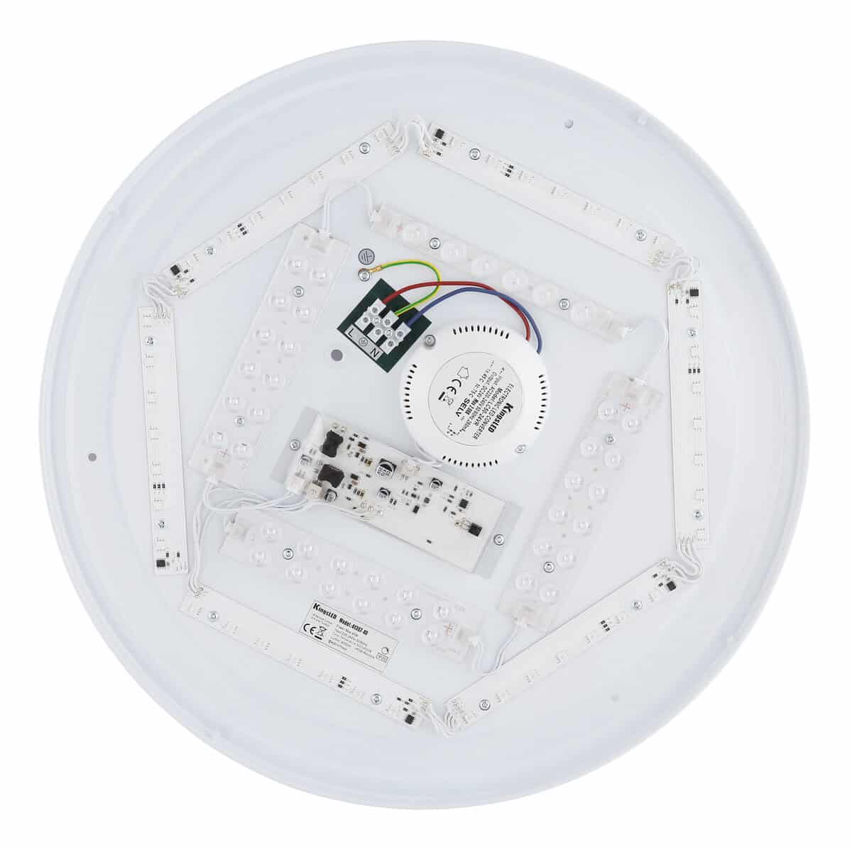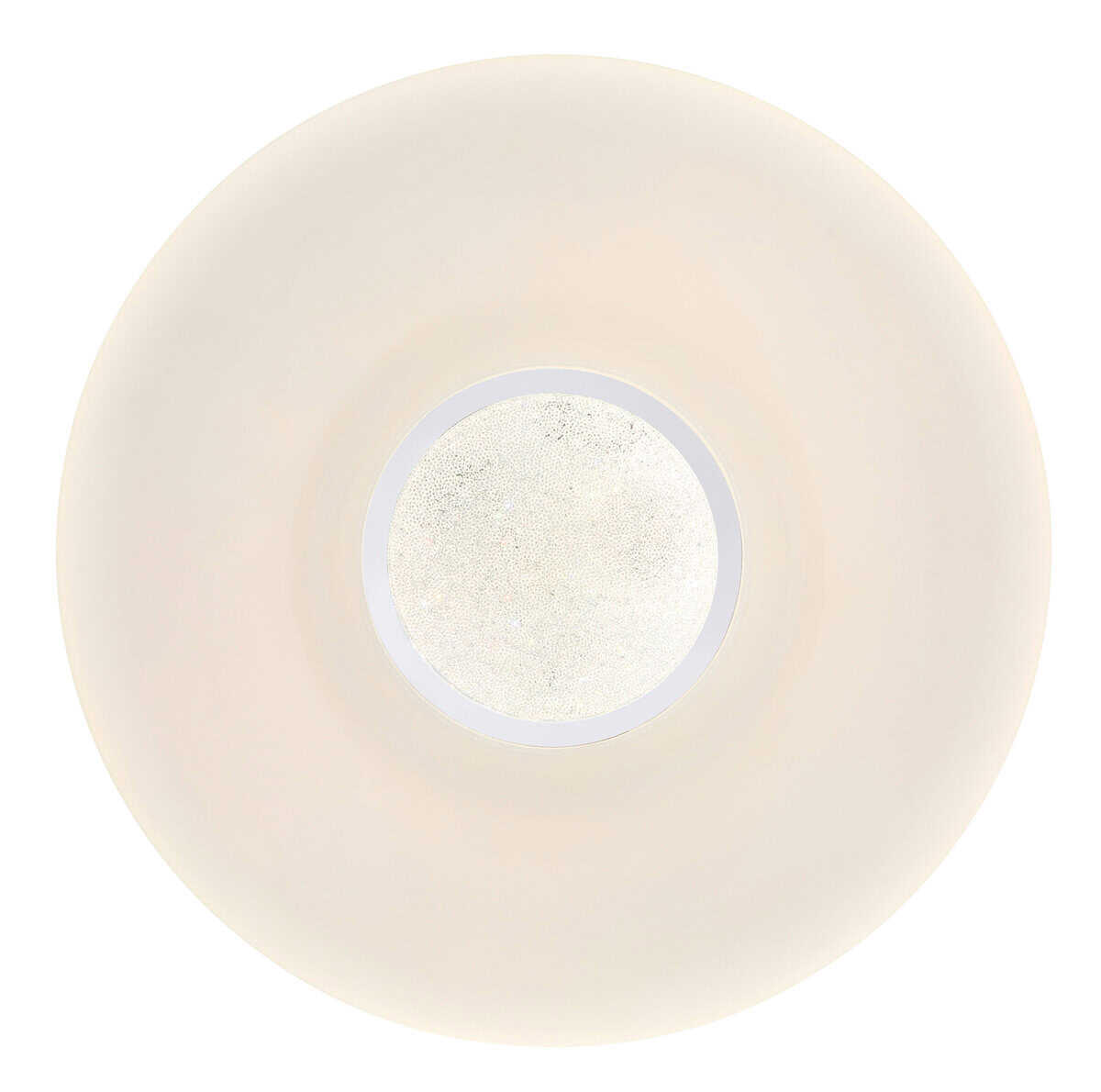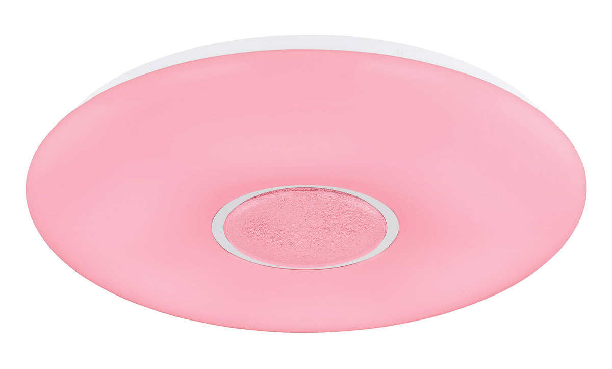 Ova okrugla plafonska lampa iz serije Sully (ø 49 cm) odlična je za vaš enterijer. Sastoji se od opal plastičnog prstena, koji je metalnim prstenom odvojen od unutrašnje površine prekrasnih staklenih kristala. Ovo pokriva uključene LED sijalice, koje pružaju 2500 lumena jakog svjetla. Osim toga, ne samo da možete prigušiti stropno svjetlo pomoću priloženog daljinskog upravljača, već i individualno podesiti boju svjetla u nekoliko nivoa između tople bijele (3000 Kelvina) i hladno bijele (6500 Kelvina), a također imate RGB i noćno svjetlo funkcija. Funkcija efekta duge pruža jedinstvenu atmosferu u kojoj lampa u duginim bojama osvjetljava prostoriju. Funkcija tajmera omogućava vam da uključite i isključite svjetlo na kontroliran način.
