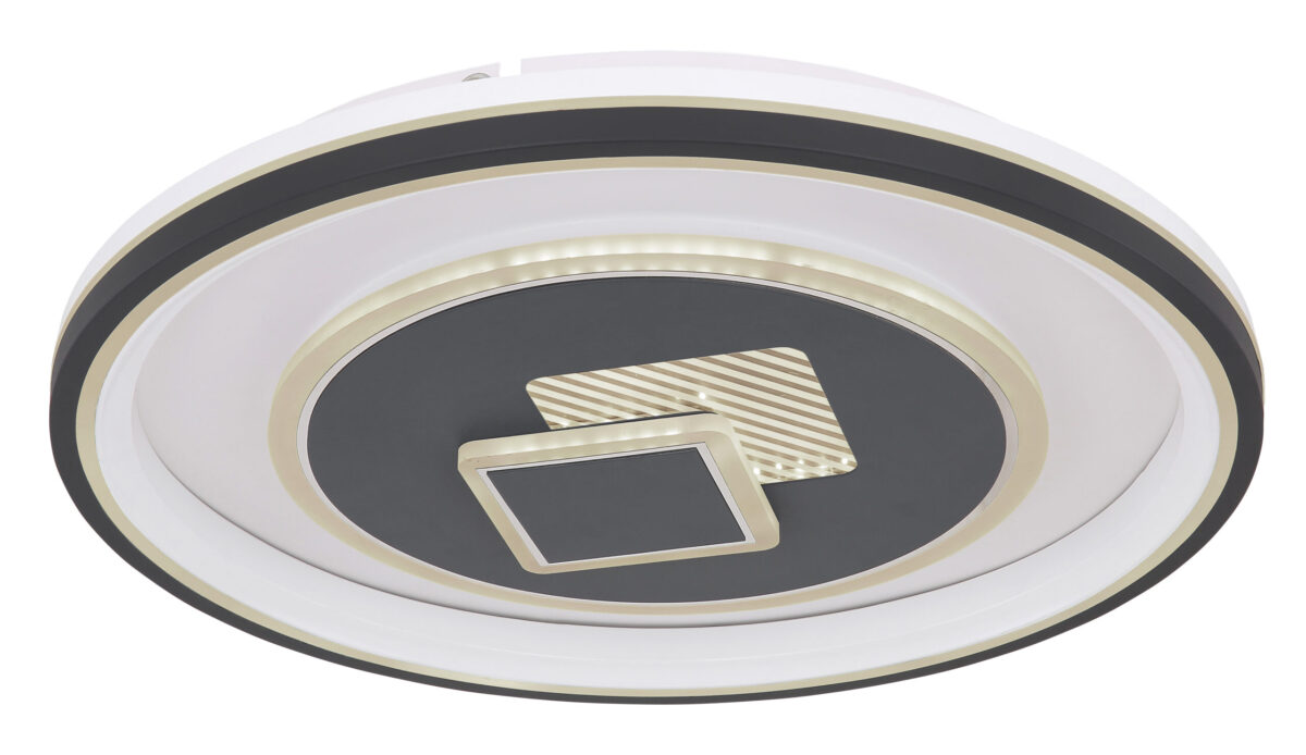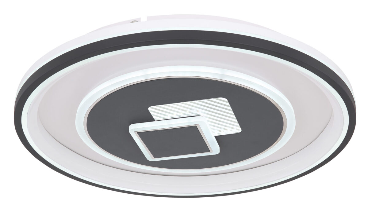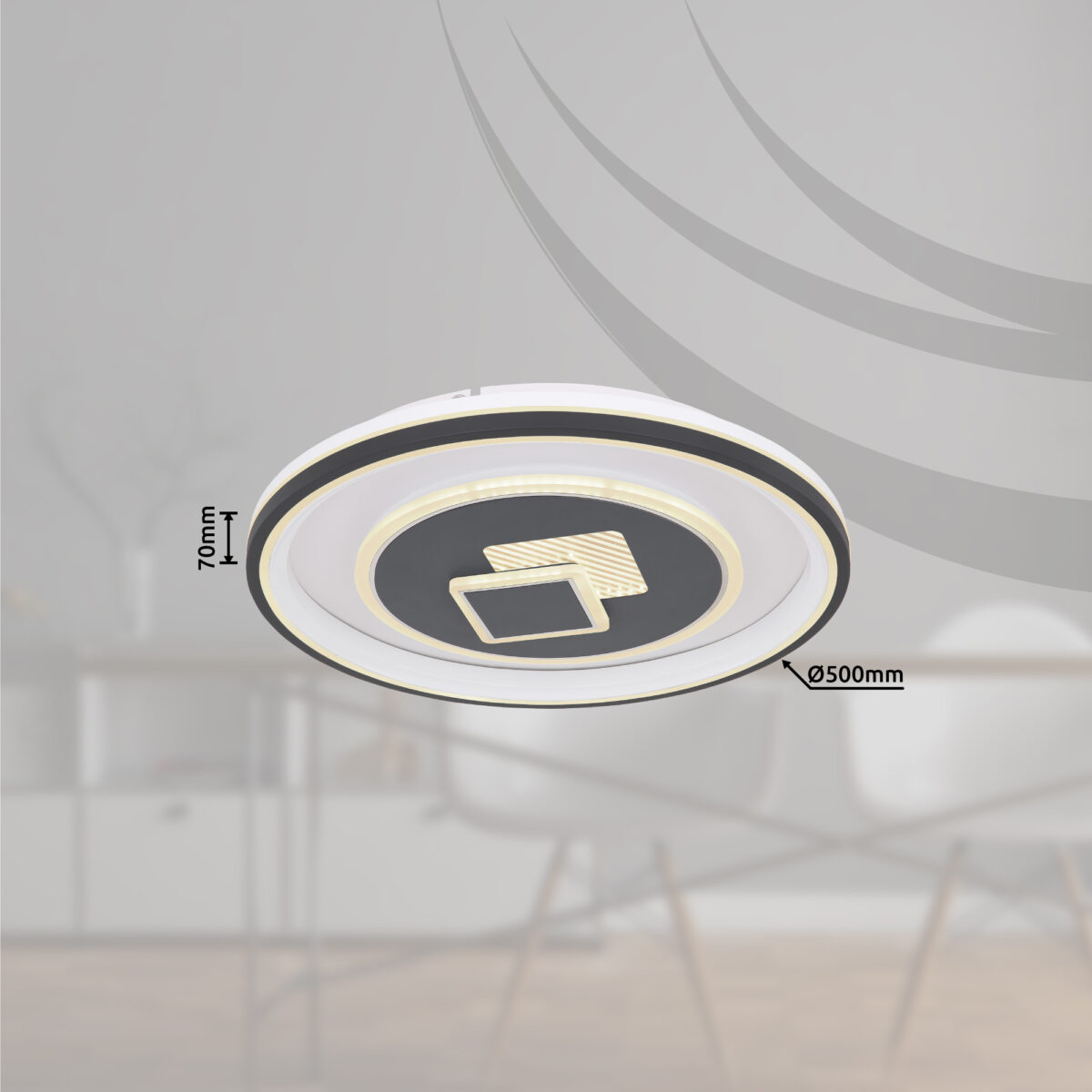 Ova izuzetno moderna plafonska lampa serije Sundi inspiriše svojim izgledom. Ova okrugla plafonska lampa sa crnim okvirom (Ø50cm) sastoji se od LED panela sa crnim pričvršćenim krugom i još dva mala pravougaonika u crnoj i beloj boji. Funkcija noćnog svjetla osigurava ugodno svjetlo, a memorijska funkcija čuva postavke nakon isključivanja svjetla. Uz pomoć priloženog daljinskog upravljača, možete popraviti i prigušiti boju svjetla od 2700 Kelvina toplo bijele, do 6000 Kelvina hladno bijele, stvarajući tako ugodniju životnu atmosferu. Toplo svjetlo u ulaznom dijelu ili jako svjetlo u kancelariji.