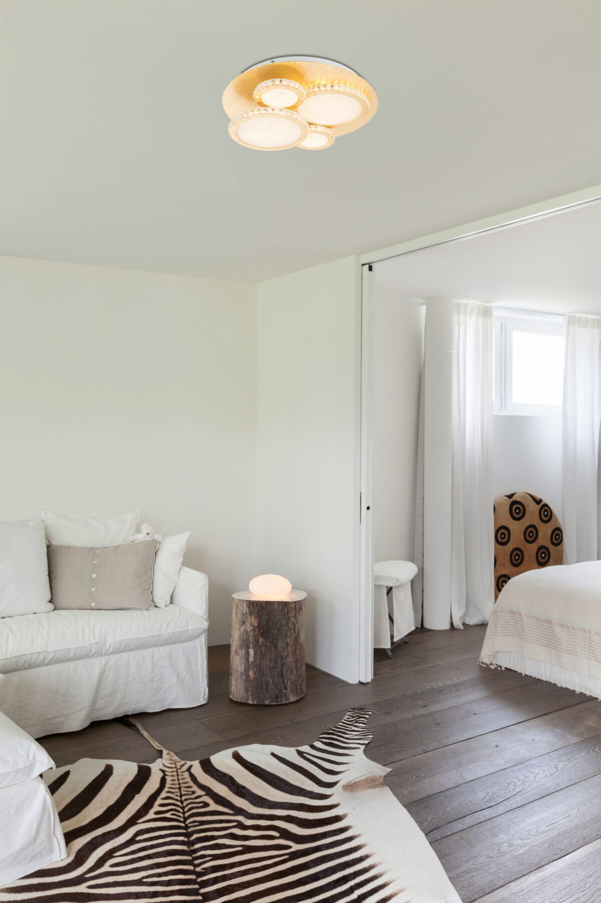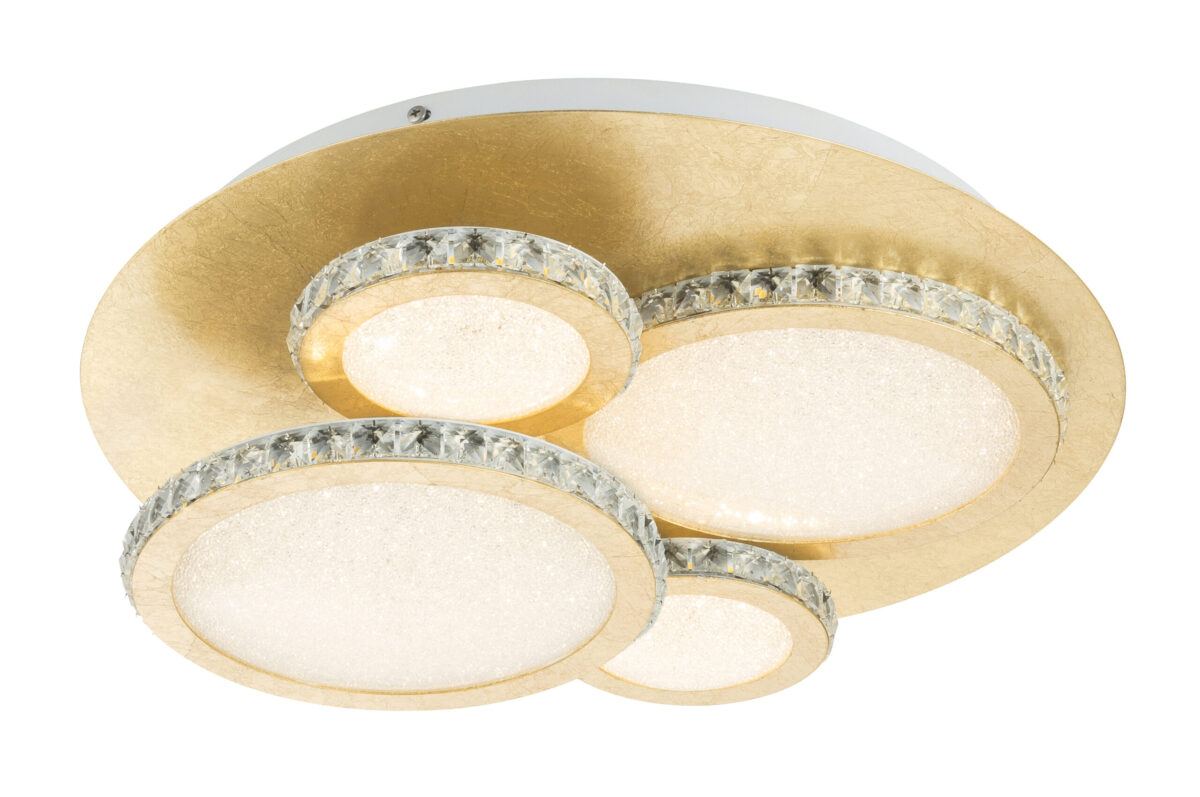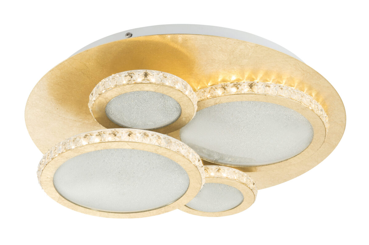 Ovo je vrlo elegantna i futuristička plafonska lampa, napravljena od metala u boji zlatnih listića i blistavih K5 kristala. Abažur se sastoji od četiri okrugla metalna prstena sa prozirnim K5 kristalima. Tilo se posebno uklapa u moderne sobe i tamo postaje inspirativan za oko zahvaljujući svom izvanrednom, inovativnom dizajnerskom jeziku. Prečnik ove zapanjujuće lampe je 45 cm. Zahvaljujući uključenim LED svjetlima od 36W, plafonska lampa daje 2700lumena jakog svjetla. Na temperaturi boje od 3000K, svetiljka emituje prijatno toplo belo svetlo.