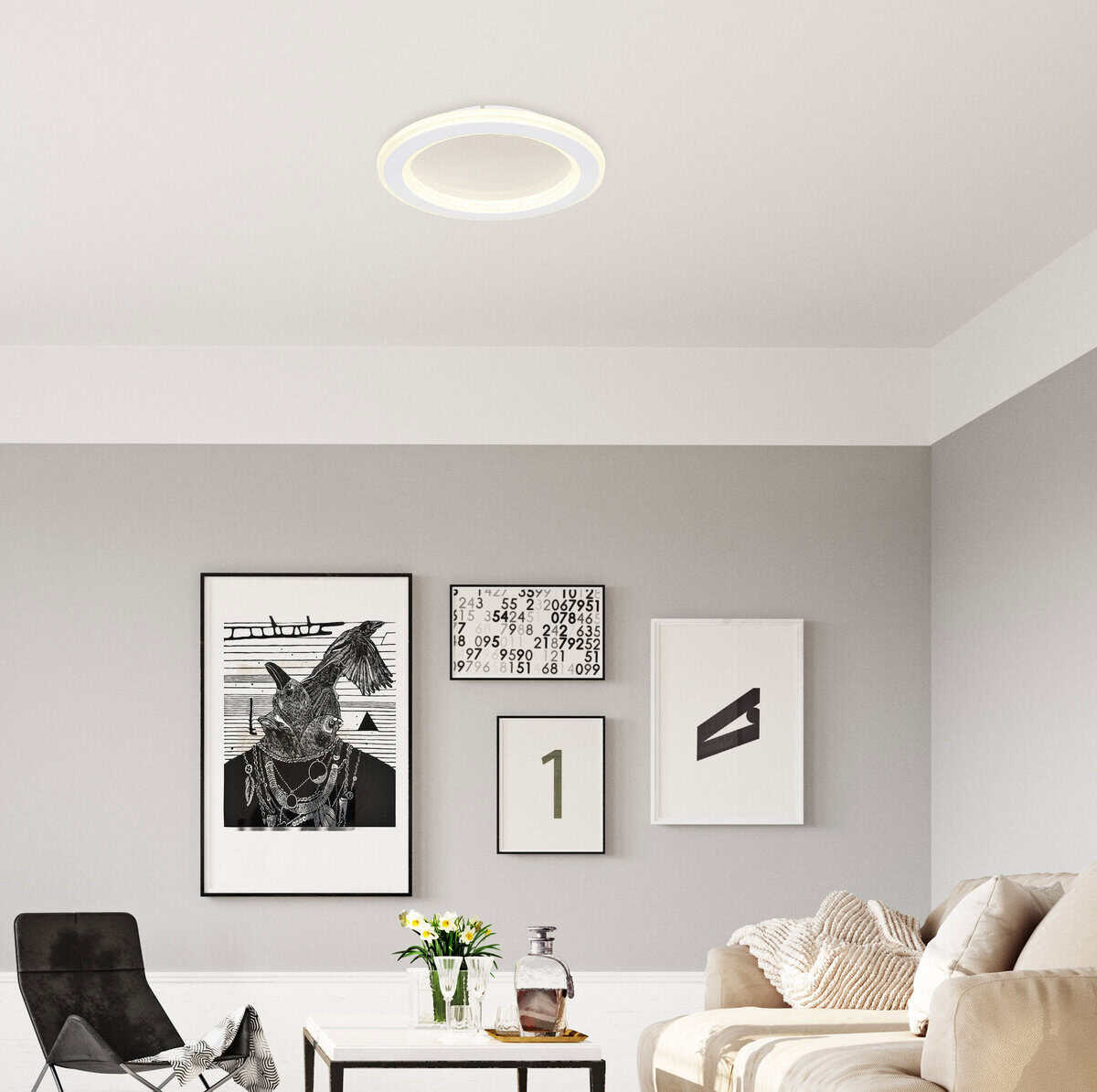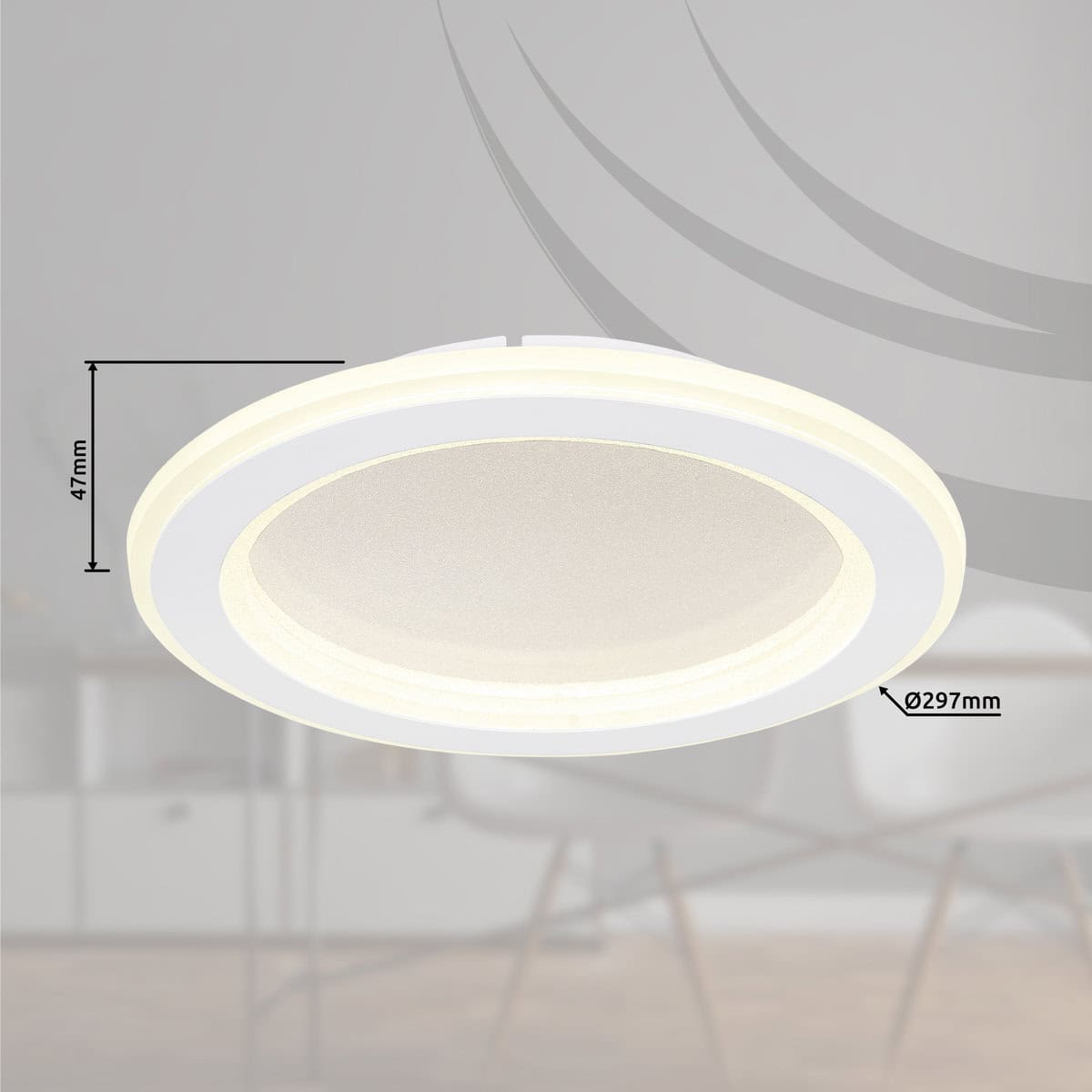 Ova prekrasna stropna lampa uvjerava sjajnim dizajnom. Okrugla plafonska lampa od belog metala (Ø 29,7 cm) obezbeđuje neutralno svetlo od 4000 Kelvina i pruža ugodnu atmosferu pomoću efekta kristalnog peska.