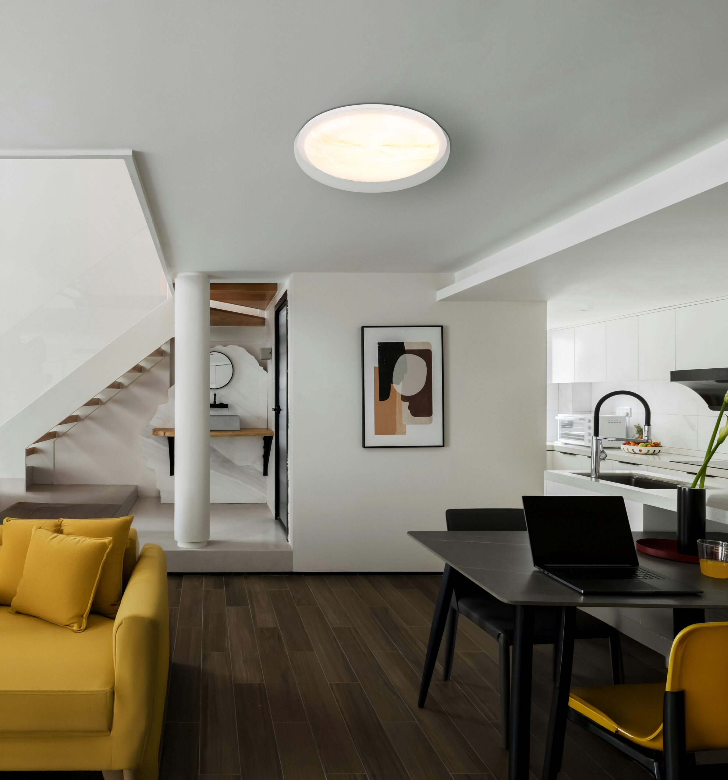 Otkrijte elegantnu plafonsku lampu TYRONE sa mermernom strukturom koja će svakoj prostoriji dodati luksuz. Sa prečnikom od 385 mm i elegantnim belim metalnim kućištem, ova lampa ne samo da je funkcionalna, već je i prava privlačna za oči. Inovativno sjenilo izrađeno od plastike u mramornom izgledu u kombinaciji s prozirnom i bijelom plastikom osigurava skladnu igru svjetla. Sa impresivnom svjetlosnom snagom od 1500 lumena i podesivom temperaturom boje (CCT) od 2700 K do 6000 K, možete stvoriti atmosferu svoje sobe po želji – od toplog, primamljivog svjetla do jakog, jasnog svjetla. Osim toga, plafonsko svjetlo ima praktičnu memorijsku funkciju koja čuva vaše željene postavke. Idealna za dnevne sobe, kancelarije ili hodnike, ova plafonska lampa kombinuje stil i svestranost na savršen način!