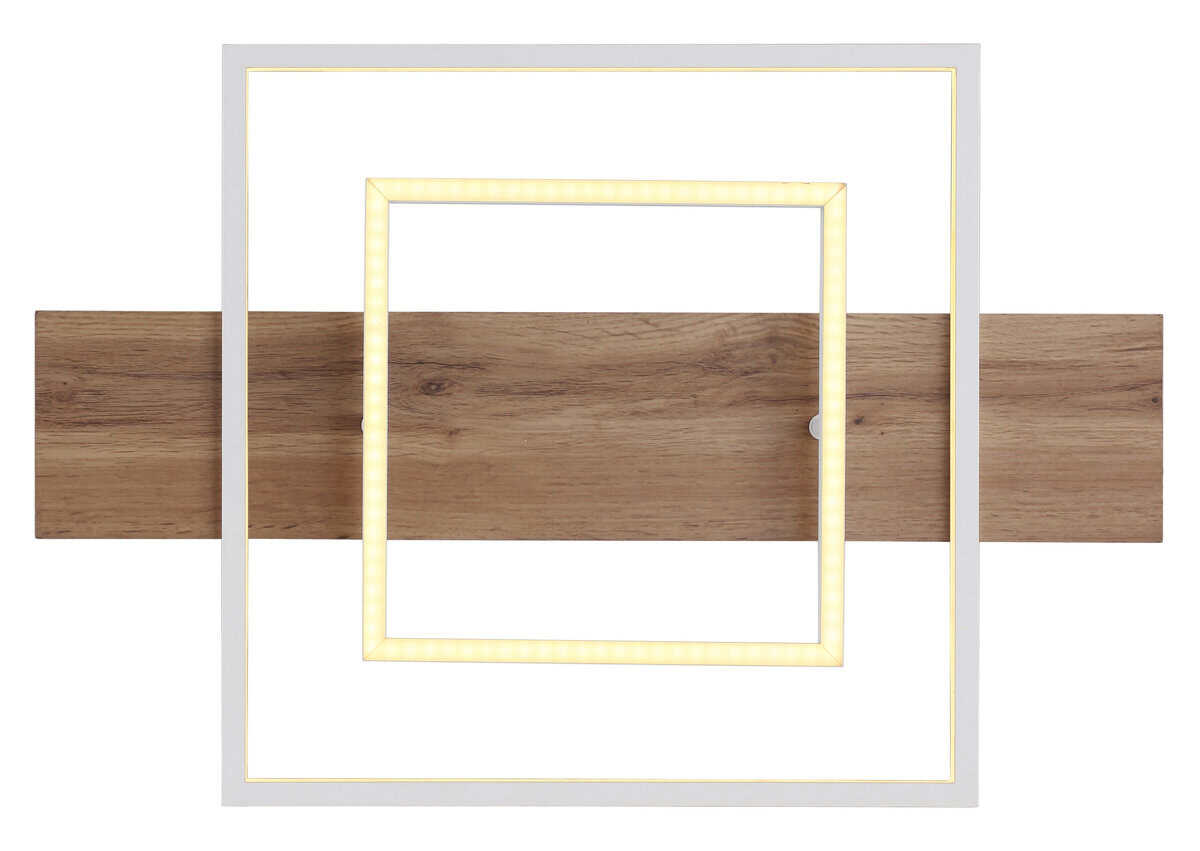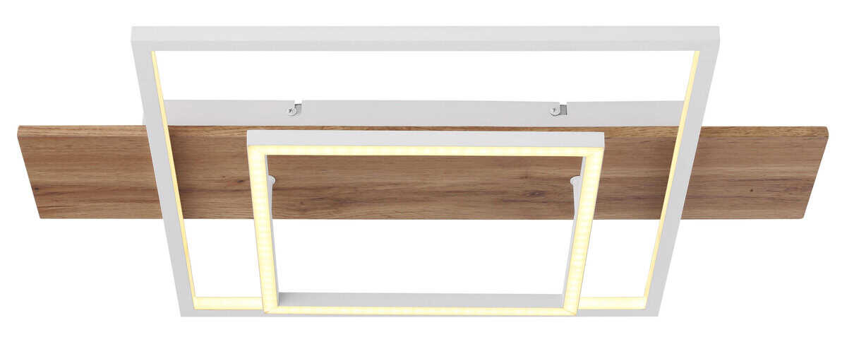 Ova moderna plafonska lampa serije VANNI u mat beloj boji dizajnirana je sa MDF-om u izgledu drveta, aluminijumom u mat beloj boji i plastikom u opalu i stvara harmoničnu atmosferu. Ima nekoliko nivoa svjetline koji se mogu kontrolisati preko zidnog prekidača. Funkcija memorije vam omogućava da vratite posljednji postavljeni nivo svjetline. Svetiljka ima tri nivoa osvetljenosti: 100%, 40% i 10%. Plafonska lampa je dimenzija DxŠxV: 600x400x100mm i sastoji se od velikog kvadrata dimenzija 40x40cm i manjeg kvadrata dimenzija 25x25cm. Uključuje LED 24W 230V, 2800lm izvor i 1500lm izlaz, 3000K, tako da dobijate jako i prijatno osvetljenje.