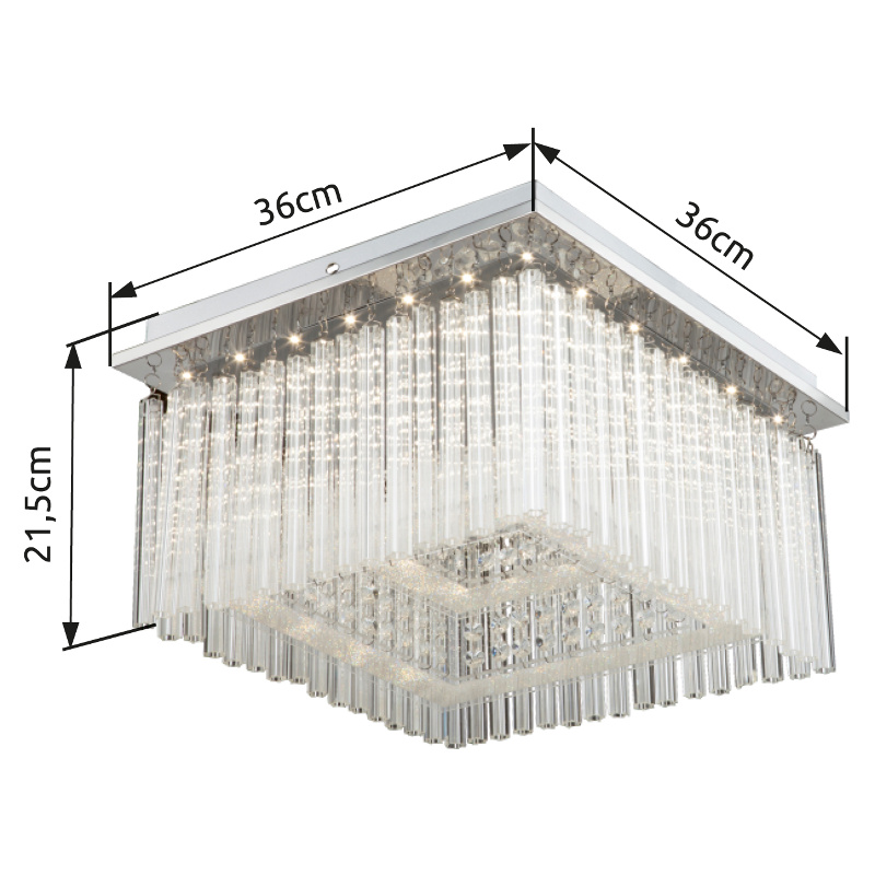 Ova privlačna, kvadratna plafonska lampa iz serije Joyce odlikuje se svojim stilskim dizajnom, kao i visokokvalitetnom izradom. Ova lampa je prekrivena hromom i ima prozirne staklene šipke, kao i prozirne staklene kristale koji daju glamurozan akcenat. Nadalje, ima veličinu od 36 cm, jaku LED sijalicu od 1860 lumena i svijetli u svijetloj boji od 4000 Kelvina.