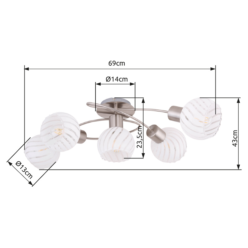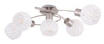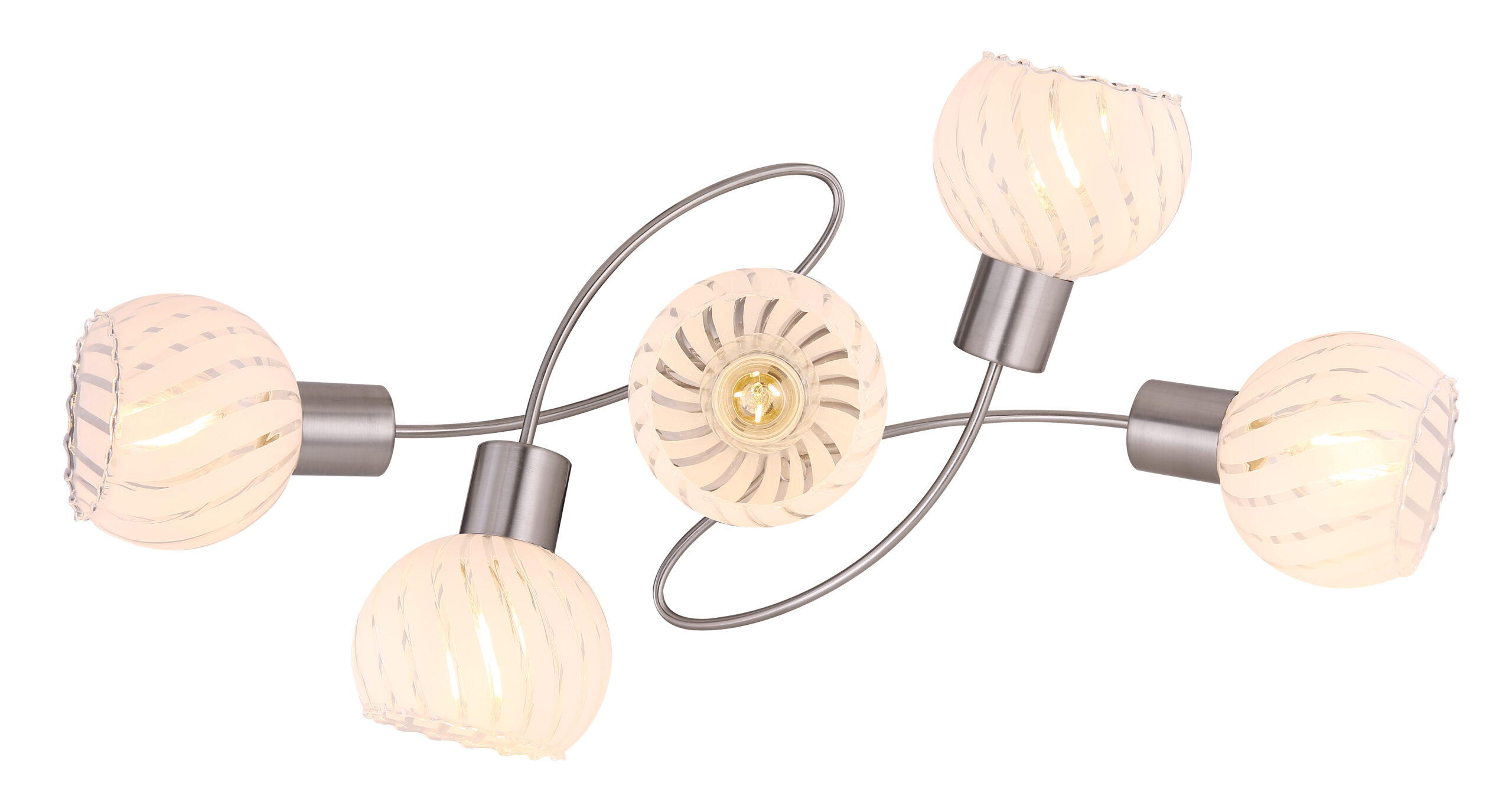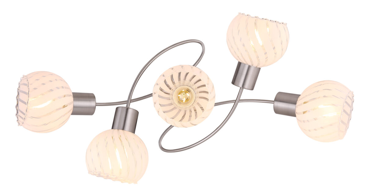 Stropna lampa WILLY ove serije proizvoda uvjerava kombinacijom dizajna i izrade. Kombinacija materijala nikl-mat metala i sfernih, užljebljenih i prugastih prozirno bijelih naočala pruža odličan izgled. Spojnice pričvršćene za ruke su opremljene sa pet E27 grla, što vam omogućava da sami odredite sijalicu (5 x max.40W) kako biste odlučili o intenzitetu svjetla i boji svjetla. Sa drugim reflektorima iste serije proizvoda možete upotpuniti sliku u svojim sobama.