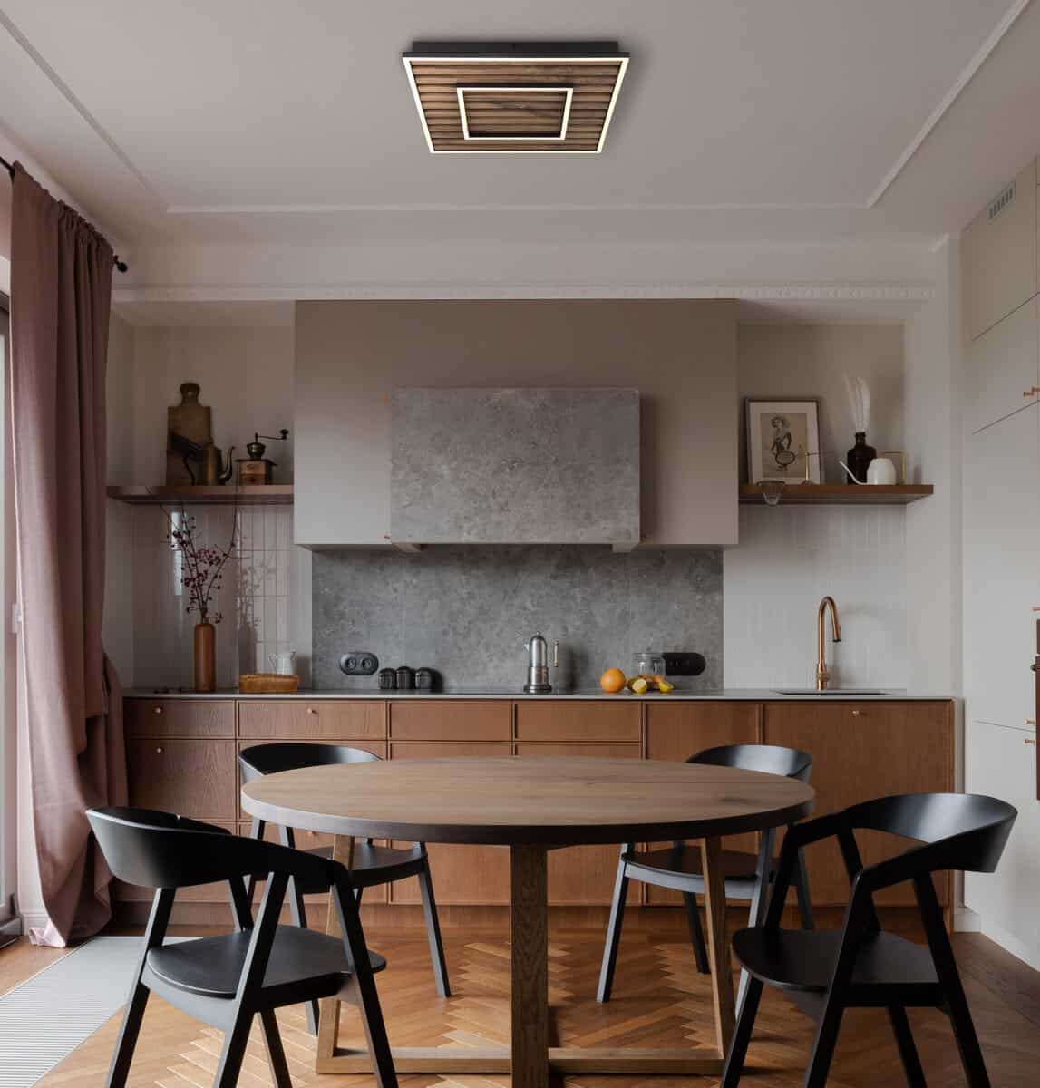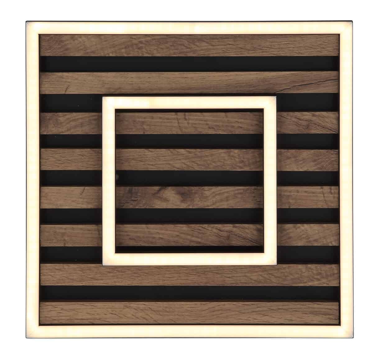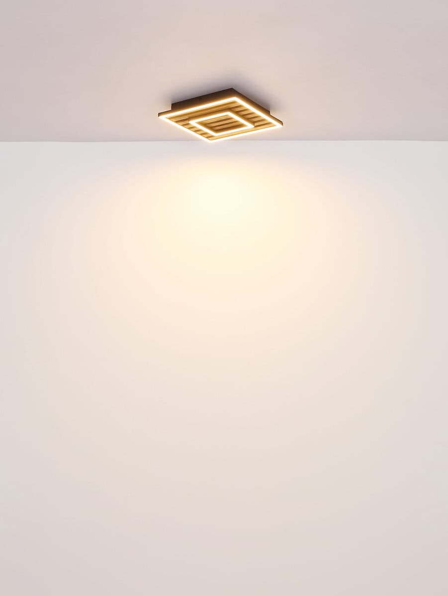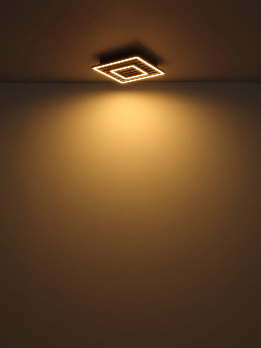 Ova WOODY plafonska lampa u modernom izgledu akustičnog panela kombinuje stilske materijale i inovativne funkcije. Tijelo je izrađeno od mat crnog metala, dok ploča od MDF-a u izgledu tamnog drveta daje topao, prirodan dodir. Sjenilo od mat aluminija i opal plastike osigurava ravnomjernu distribuciju svjetlosti. Svetiljkom se može upravljati u nekoliko faza preko zidnog prekidača, koji nudi tri različite opcije osvjetljenja: vanjski okvir, unutrašnji okvir ili oboje zajedno. Integrirana memorijska funkcija čuva željene postavke. Opremljen LED modulom, svetiljka isporučuje izvor svetlosti od 1850 lm pri izlazu od 1000 lm i prijatnu temperaturu boje od 3000 K u toploj beloj boji.