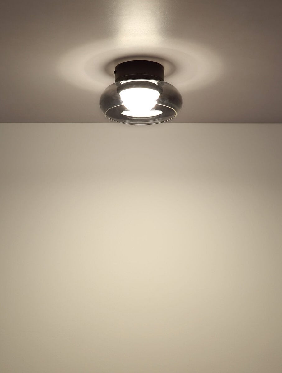 Okrugla plafonska lampa CEILING LIGHT METAL BLACK MATT impresionira svojim modernim, elegantnim dizajnom i funkcionalnom LED tehnologijom. Ravno sjenilo od stakla boje dima upotpunjeno je iznutra opalnim akrilnim sjenilom, koji osigurava ravnomjernu raspodjelu svjetla bez odsjaja. Tijelo izrađeno od mat crnog metala naglašava elegantan karakter svjetiljke i čini je elegantnom privlačnom za oči na svakom plafonu. Sa svjetlosnim izlazom od 595 lumena, integrirano LED svjetlo nudi ugodnu svjetlinu, čija se temperatura boje može fleksibilno podesiti od 3000 K (topla bela) do 6000 K (hladna bela) u zavisnosti od vašeg raspoloženja. Zahvaljujući fiksaciji boja i memorijskoj funkciji, vaša željena postavka svjetla se trajno čuva. Lampa je idealna za dnevne sobe, hodnike ili spavaće sobe i kombinuje dekorativni izgled s praktičnom tehnologijom rasvjete – savršena za sve koji cijene moderan ambijent i udobnost. Incl. LED.