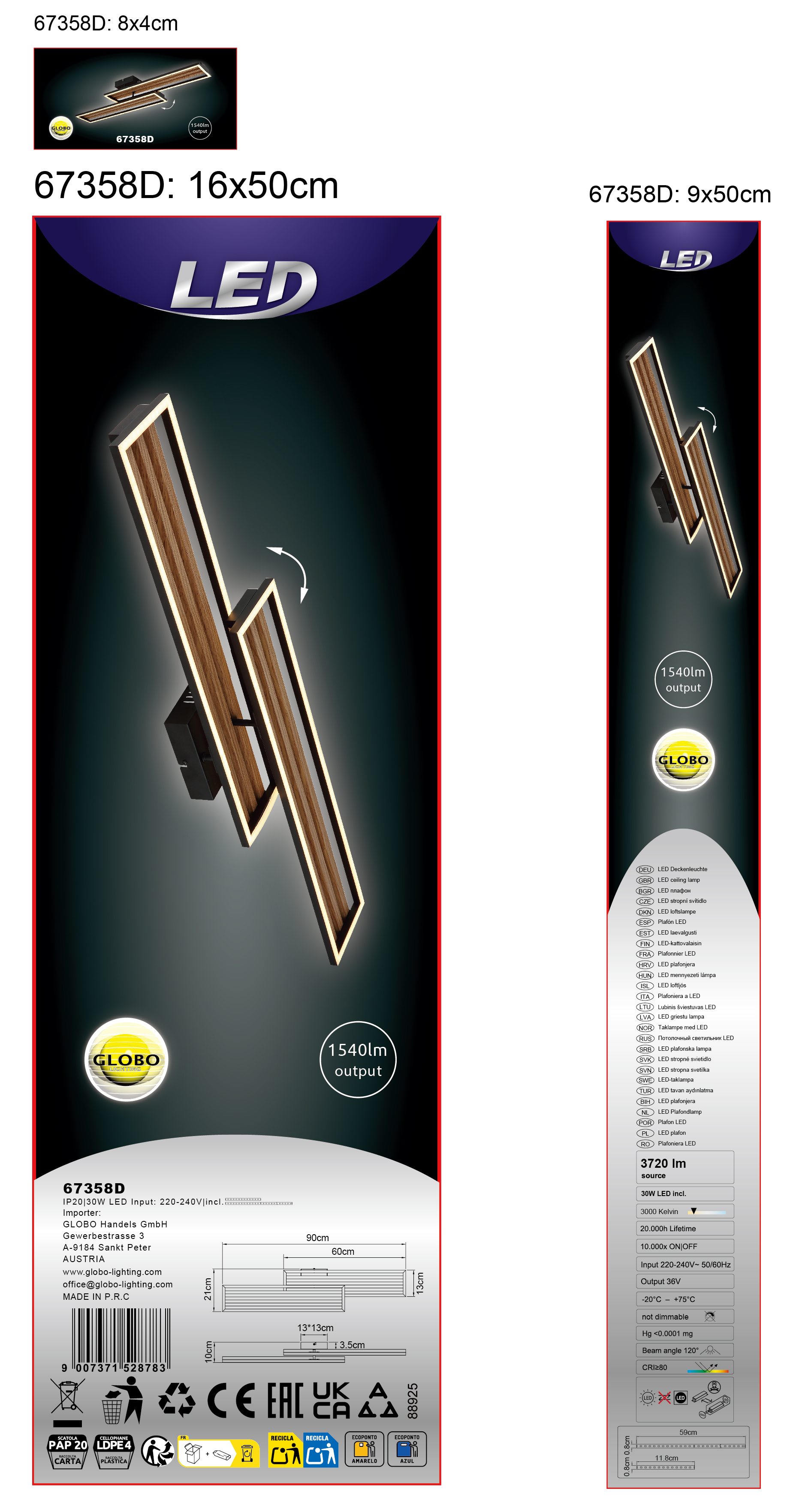 Pravokutna stropna svjetiljka DAKARI I svojim inovativnim dizajnom postavlja moderan akcenat u svakoj prostoriji. Sastoji se od dva pravougaonika raspoređena jedan iznad drugog, koji se mogu pojedinačno poravnati zahvaljujući svojoj rotirajućoj funkciji. Tijelo izrađeno od mat crnog metala i elegantnog tamnog aluminija sa izgledom drveta daju svjetiljci elegantan, prirodan izgled. Sjenilo od crne, mat ABS i opalno bijele plastike osigurava ravnomjernu raspodjelu svjetla i ugodan ambijent. Sa LED rasvjetom i temperaturom boje od 3000K, svjetlo daje toplo, privlačno svjetlo koje je idealno za dnevne sobe, hodnike ili spavaće sobe. DAKARI I kombinuje funkcionalnost sa estetikom i savršeno se uklapa u moderne enterijere koji zahtevaju i stilizovana i praktična rešenja. Savršen izbor da svoj dom obogatite jedinstvenim izvorom svjetlosti.