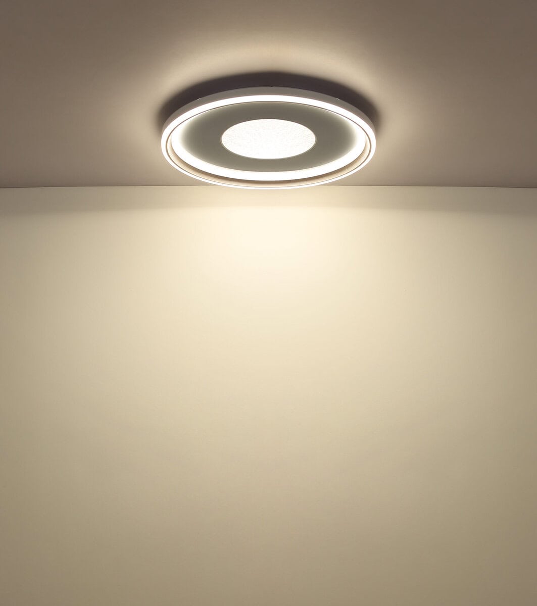 Elegantna žarišna tačka za moderne životne prostore – okrugla plafonska lampa EILA impresionira svojim elegantnim dizajnom sa centralnim elementom ogledala koji, u kombinaciji sa 3D efektom, stvara zadivljujuće svetlosne akcente. Sa prečnikom od 600 mm, idealan je za veće prostorije kao što su dnevni i trpezarijski prostori ili spavaće sobe. Mat bijelo metalno kućište daje mu bezvremenski, savremeni izgled. Mat plastična nijansa boje šampanjca, u kombinaciji s opalom i zrcaljenim akrilom, pruža meku, atmosfersku distribuciju svjetla. Integrirana LED tehnologija isporučuje 5000 lumena i omogućava beskonačno podešavanje temperature boje od 2700 K do 6000 K putem daljinskog upravljača. Dodatno, EILA nudi praktične funkcije kao što su prigušivanje, zaključavanje boja, memorijska funkcija i nježno noćno svjetlo. Plafonska lampa EILA kombinuje tehničku sofisticiranost sa dekorativnim dizajnom, što je čini savršenim rešenjem za elegantan, fleksibilan ambijent osvetljenja.