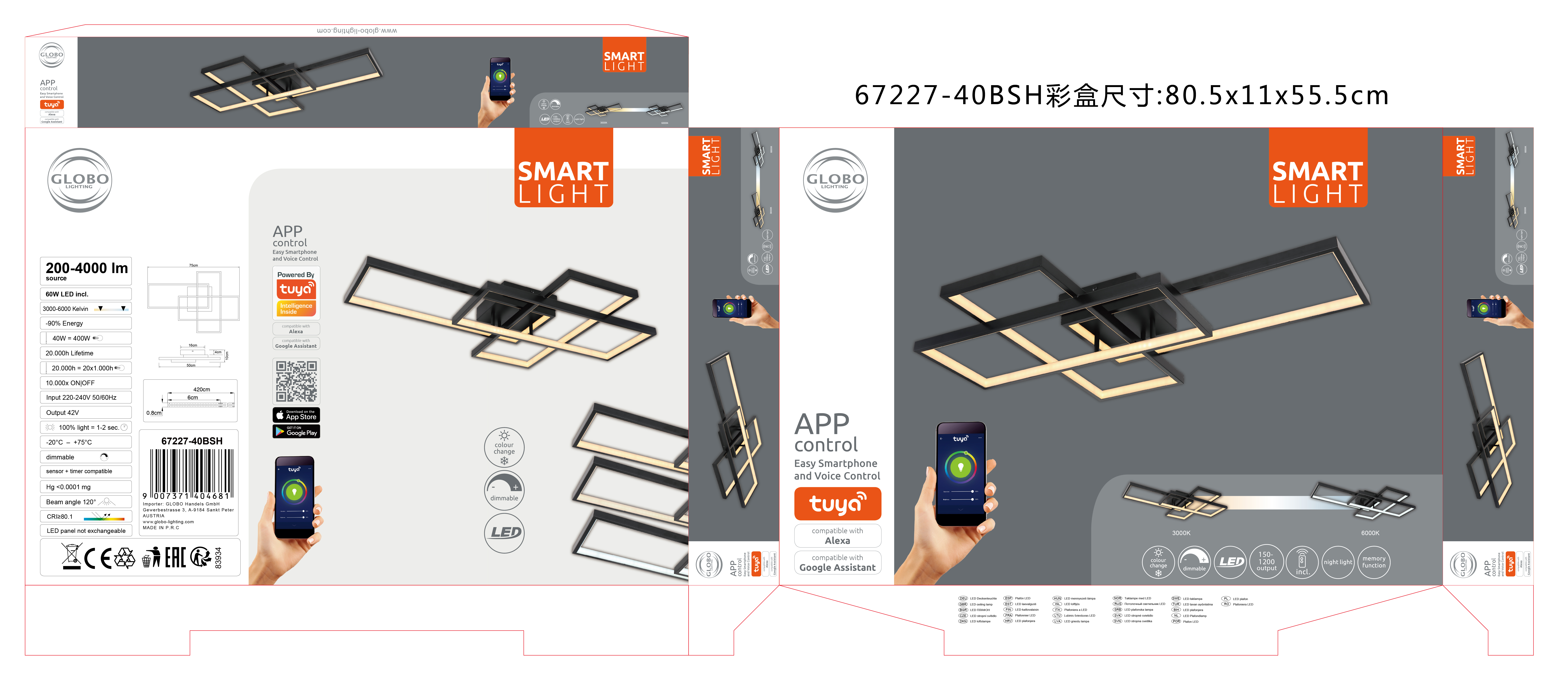 Sa ovom modernom LED plafonskom lampom iz Gabriel serije, možete unijeti high-tech u svoja četiri zida. Opremljen memorijskom funkcijom, izmjenjivačem boja i daljinskim upravljačem, nijedna želja ne ostaje neispunjena. Vrhunac je, međutim, funkcija Smart Home, svjetiljka je kompatibilna sa Smart Home i Alexa i može se upravljati glasovnim unosom. Ovom Smartlight lampom se lako može upravljati pomoću aplikacije Tuya Smart (Android TM/IOS). Upravljanje glasom je jednostavno uz Amazon Echo Tm i Google Home.