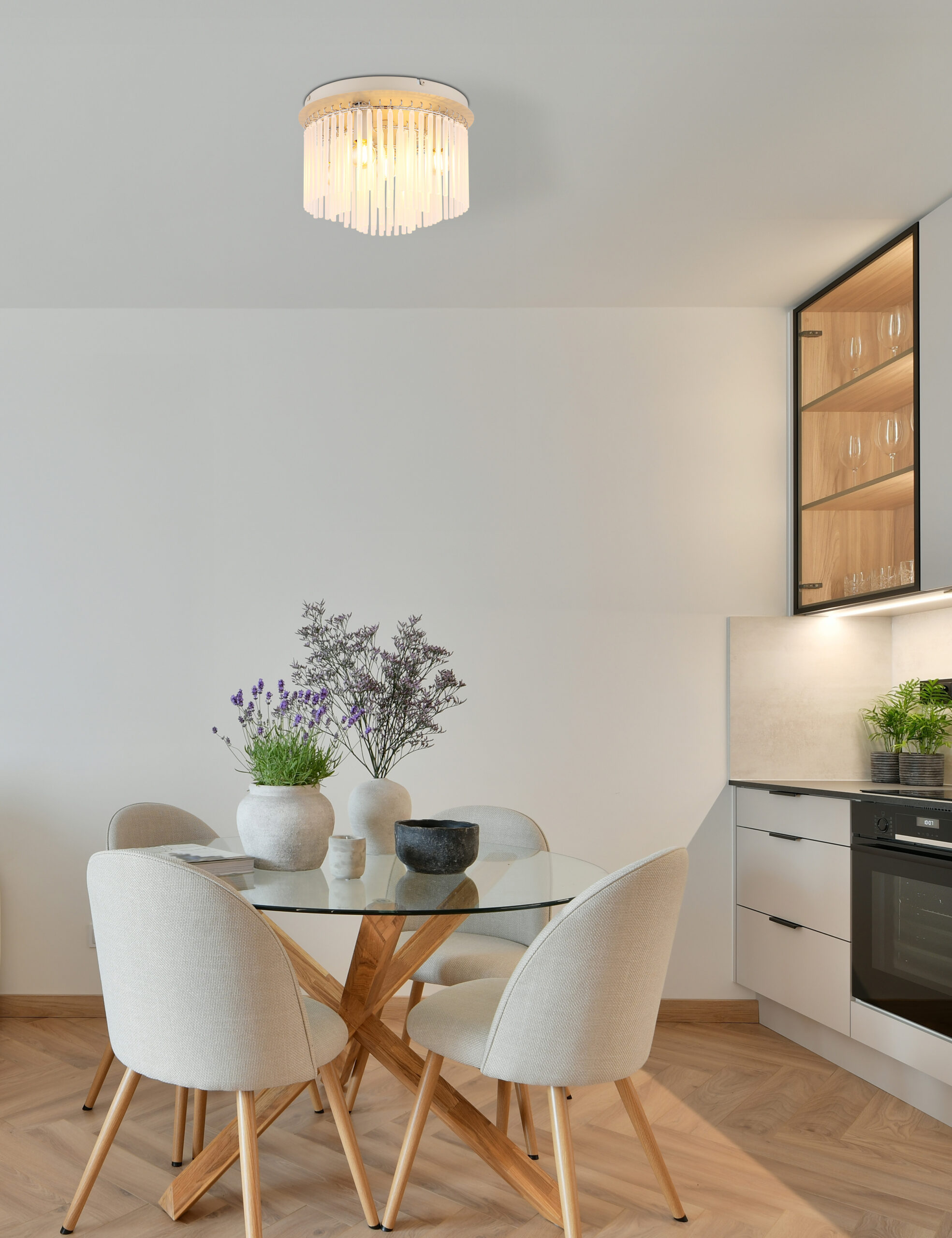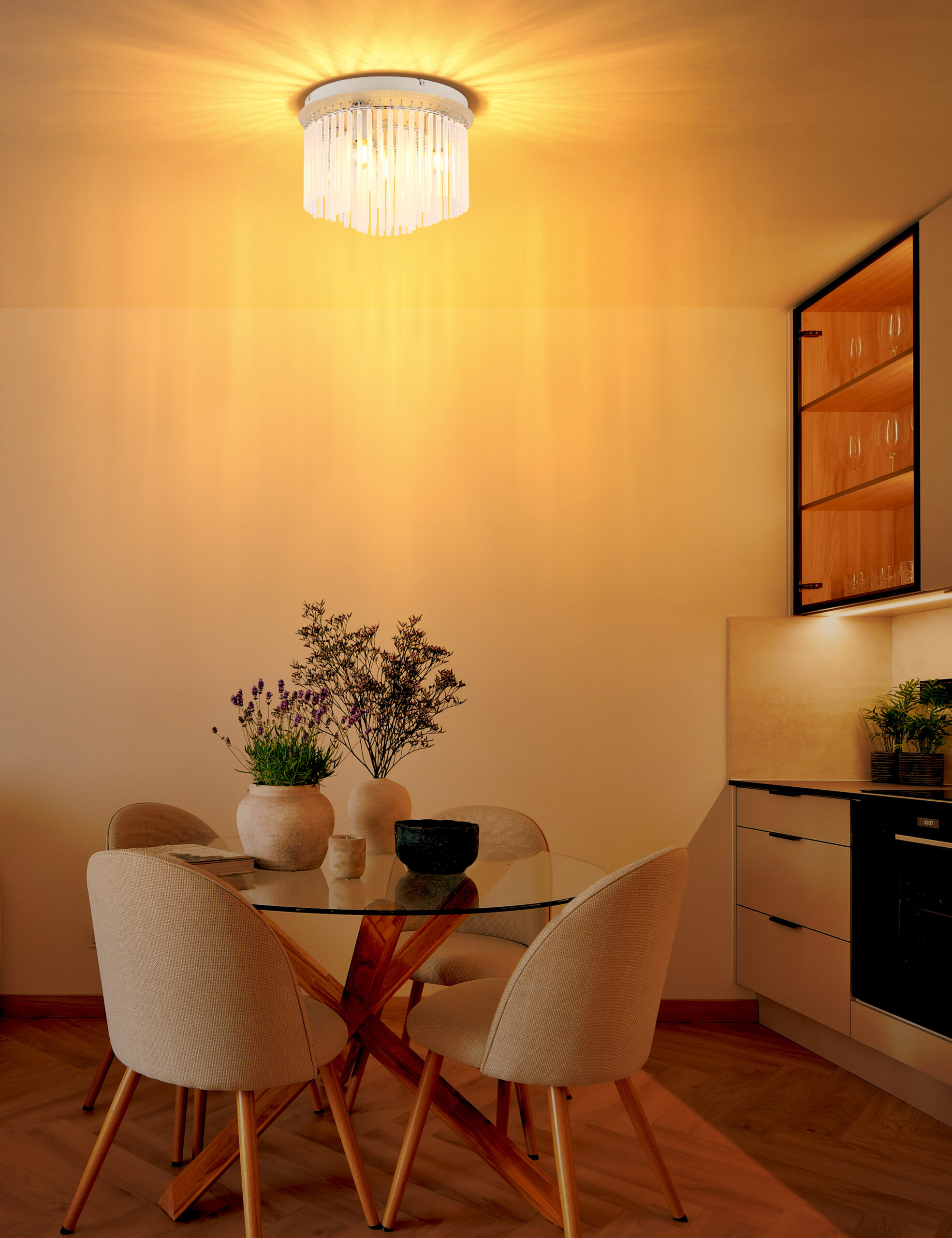 Okrugla GORLEY plafonska lampa impresionira svojim elegantnim i modernim dizajnom. Kućište kombinuje mat crno obojeni metal sa hromiranim elementima, stvarajući moderan kontrast. Okrugla nijansa se sastoji od staklenih štapića sa fascinantnim gradijentom od kupine preko crvene do prozirnog stakla. Ova kombinacija stvara poseban svjetlosni efekat i postavlja ukrasne akcente u svaku prostoriju. S promjerom od 320 mm, svjetlo je kompaktno i idealno za manje stambene prostore, hodnike ili ulazne prostore. Viseća lampa je dizajnirana za sijalice E14 (sijalice nisu uključene), što vam omogućava da odaberete izvor svetlosti prema vašim potrebama. Visokokvalitetna izrada i harmonična međusobna igra materijala čine GORLEY stilski privlačnim za oči koji pruža ugodno i atmosfersko osvjetljenje. Vrhunac modernog dizajna za svaku prostoriju.