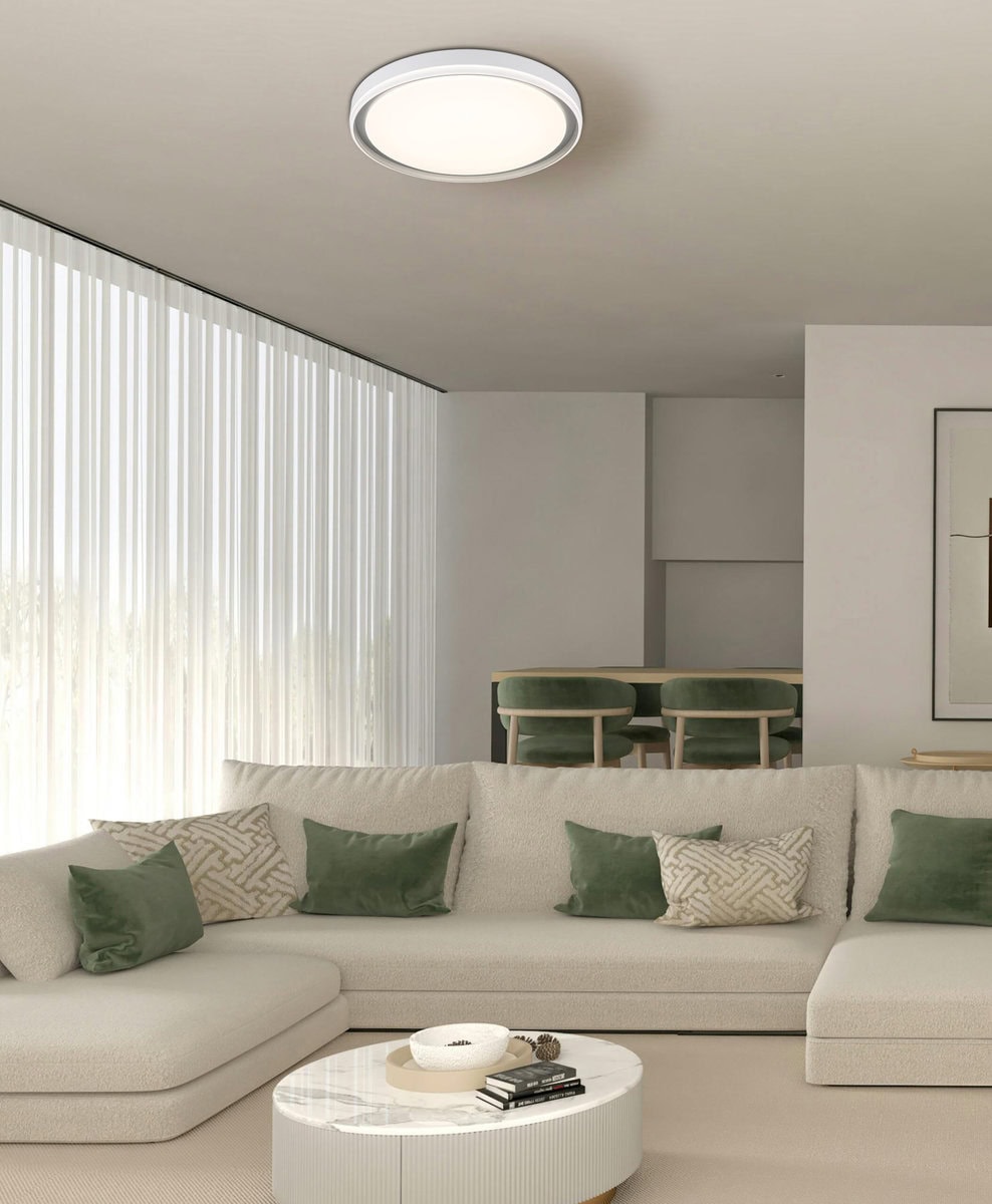 Plafonska lampa JANICE METALL WHITE kombinuje moderan dizajn sa praktičnom funkcionalnošću. Okrugla sjenilo od plastike srebrnog izgleda i opal akrila osigurava ravnomjernu distribuciju svjetlosti i stvara ugodno, ravnomjerno osvjetljenje. Tijelo izrađeno od mat metala u bijeloj boji neprimjetno se uklapa u različite stilove života i daje vašoj sobi stilski štih. Integrirani RGBW LED omogućava fleksibilnu promjenu boja i može se podesiti po želji pomoću daljinskog upravljača. Boje se također mogu fiksirati, a svjetlo se može prigušiti po želji, tako da možete individualno prilagoditi atmosferu osvjetljenja. Funkcija praktične memorije čuva vaše omiljene postavke za upotrebu bez napora. Idealan za dnevne i spavaće sobe, JANICE METALL WHITE stvara ugodnu atmosferu koja se može promijeniti u svakom trenutku. Savršen izbor za sve koji žele spojiti funkcionalnost sa modernim dizajnom.