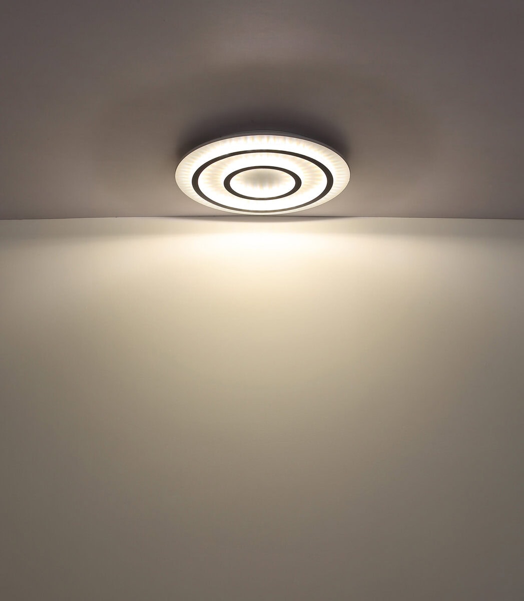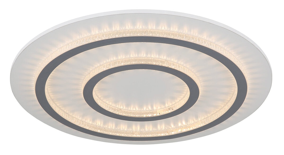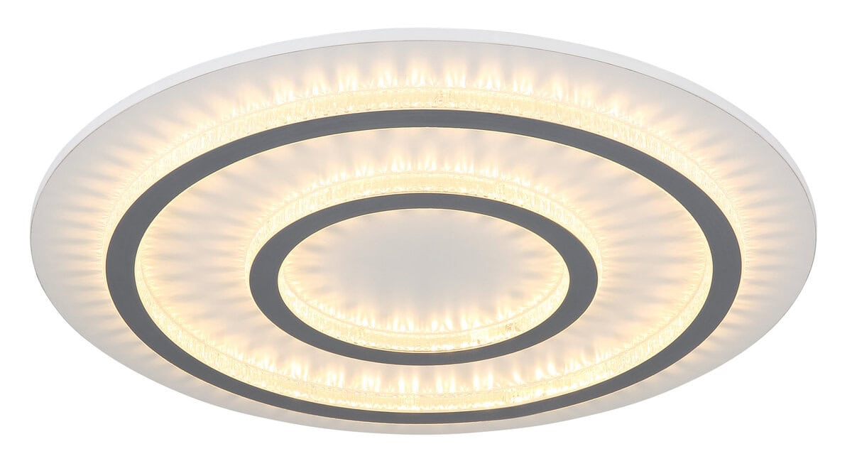 Jayden stropna svjetiljka od mat bijelog metala i prozirnih plastičnih kristala donosi moderan dizajn i raznovrsnu rasvjetu u vaš dom. Kućište izrađeno od visokokvalitetnog bijelog metala i plastike osigurava elegantan i suptilan izgled koji se uklapa u svaki interijer. Sjenilo od prozirnih plastičnih kristala i svijetlosive plastike širi ugodno, difuzno svjetlo i stvara privlačnu atmosferu. Sa prečnikom od 550 mm, lampa je idealna za srednje i velike prostorije. Integrirana LED tehnologija osigurava efikasno osvjetljenje i može se prigušiti pomoću daljinskog upravljača. CCT funkcija omogućava individualno podešavanje temperature boje od 2700 K (topla bela) do 6500 K (dnevno belo). Osim toga, željena postavka svjetla može se sačuvati pomoću memorijske funkcije. Jayden plafonska lampa kombinuje moderan dizajn i modernu funkcionalnost za vaš dom.