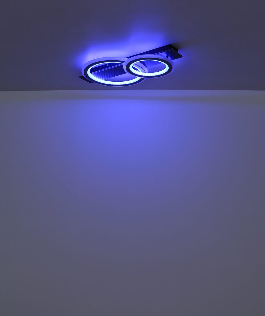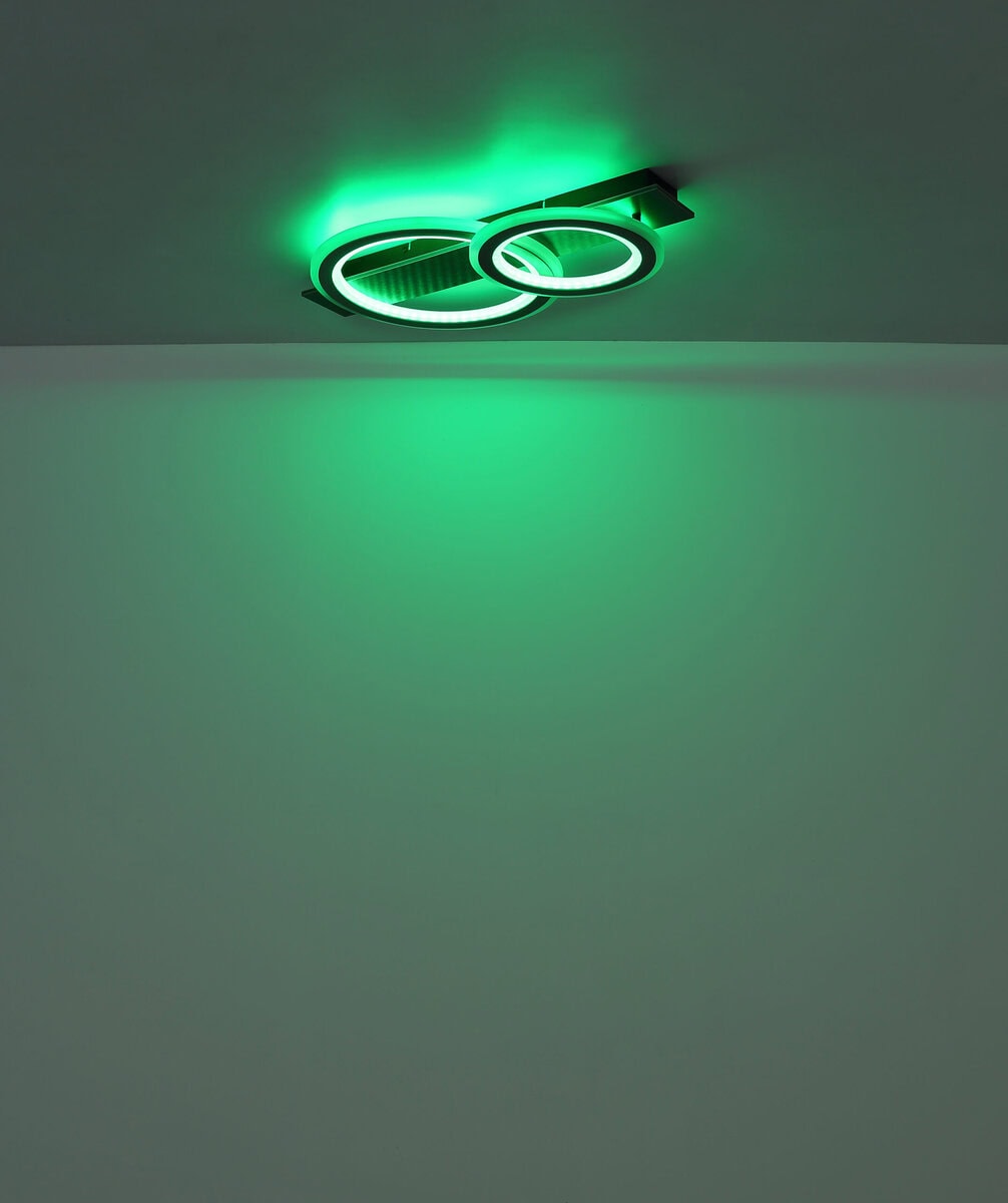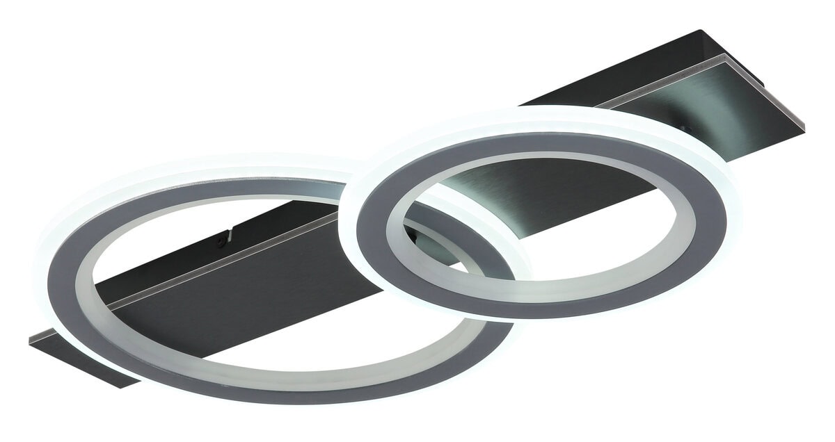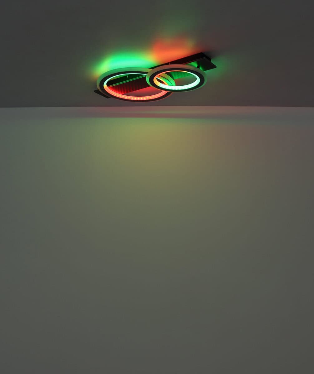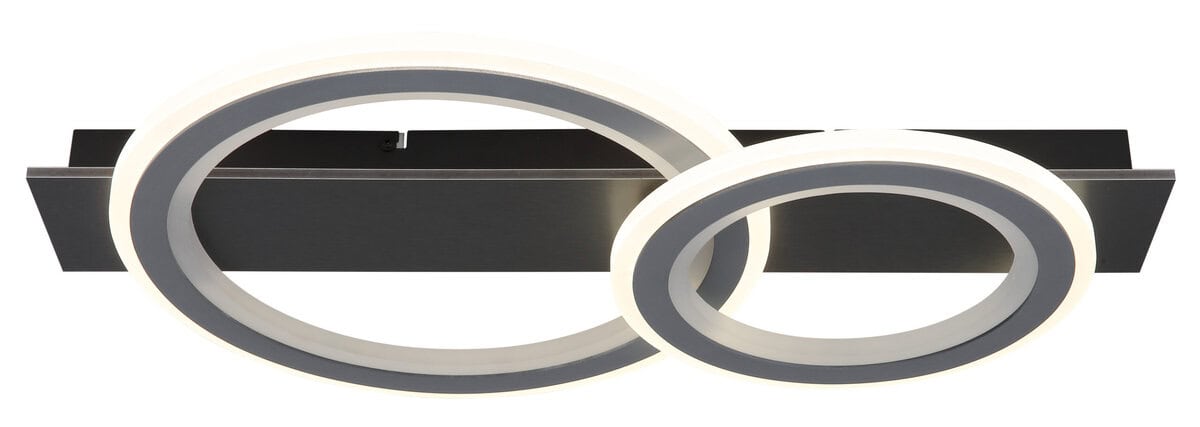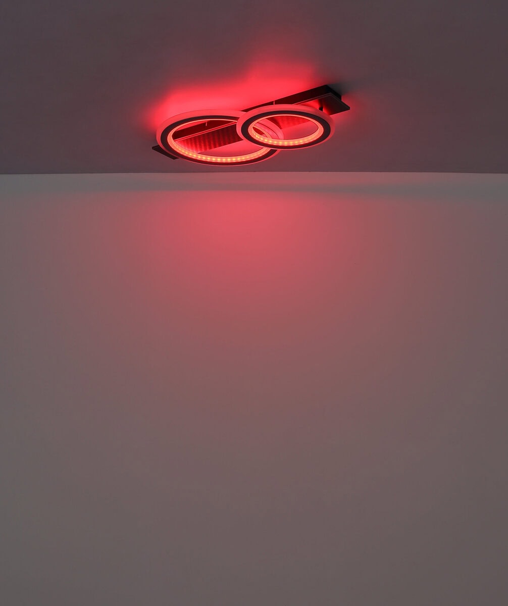 Stropna svjetiljka JAYDEN impresionira svojim modernim dizajnom i raznovrsnim funkcijama. Pravougaoni zidni natpis sa dva ofset prstena u kombinaciji sa kućištem od crnog, mat metala i brušene sive plastike daje lampi elegantan i savremen izgled. Sjenilo od svijetlosive metala i opal akrila osigurava ugodnu distribuciju svjetlosti. Sa daljinskim upravljačem koji je uključen u isporuku, možete prigušiti svjetlinu svjetla po želji i aktivirati promjenu RGB boje. Birajte iz širokog spektra boja koje se mogu popraviti ili uživajte u očaravajućem efektu duge. Temperatura boje je podesiva od 2700K do 6500K, tako da uvijek možete odabrati idealno svjetlo za svako raspoloženje i aktivnost. S veličinom od 630 mm x 350 mm, plafonska lampa JAYDEN je savršen izbor za moderne životne prostore. Funkcija memorije čuva vaša zadnja podešavanja.