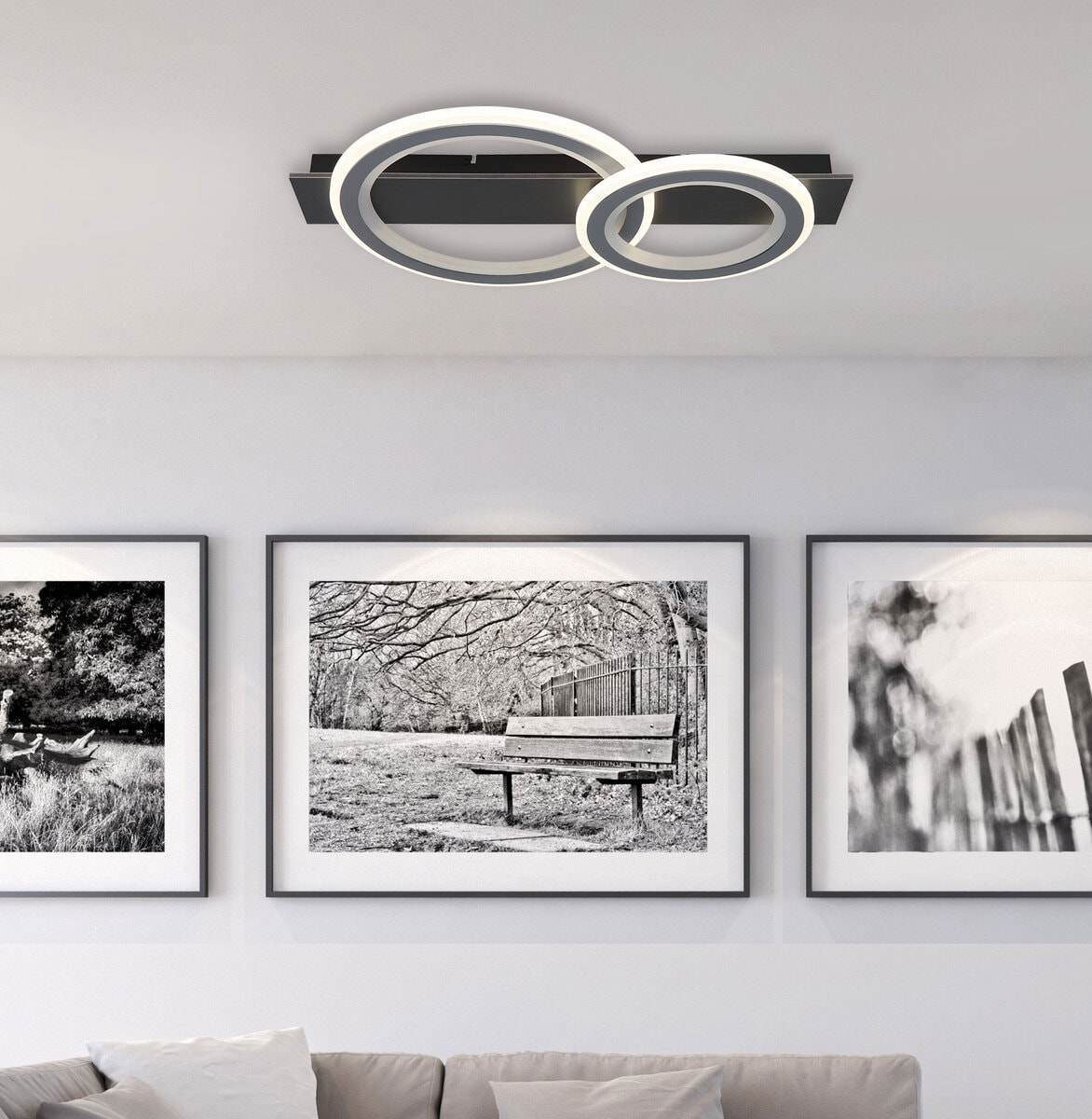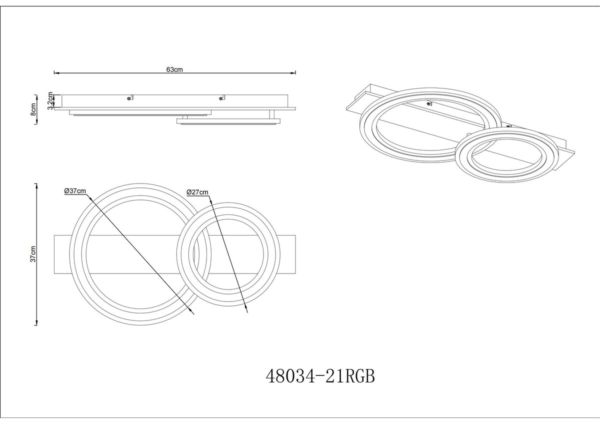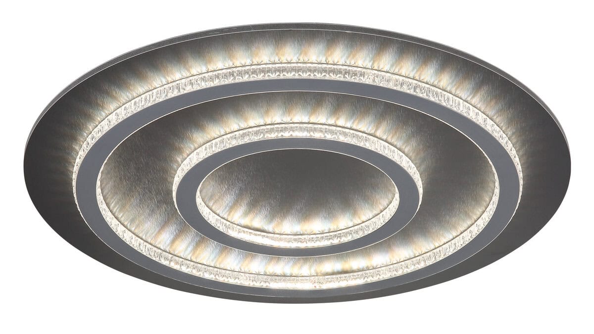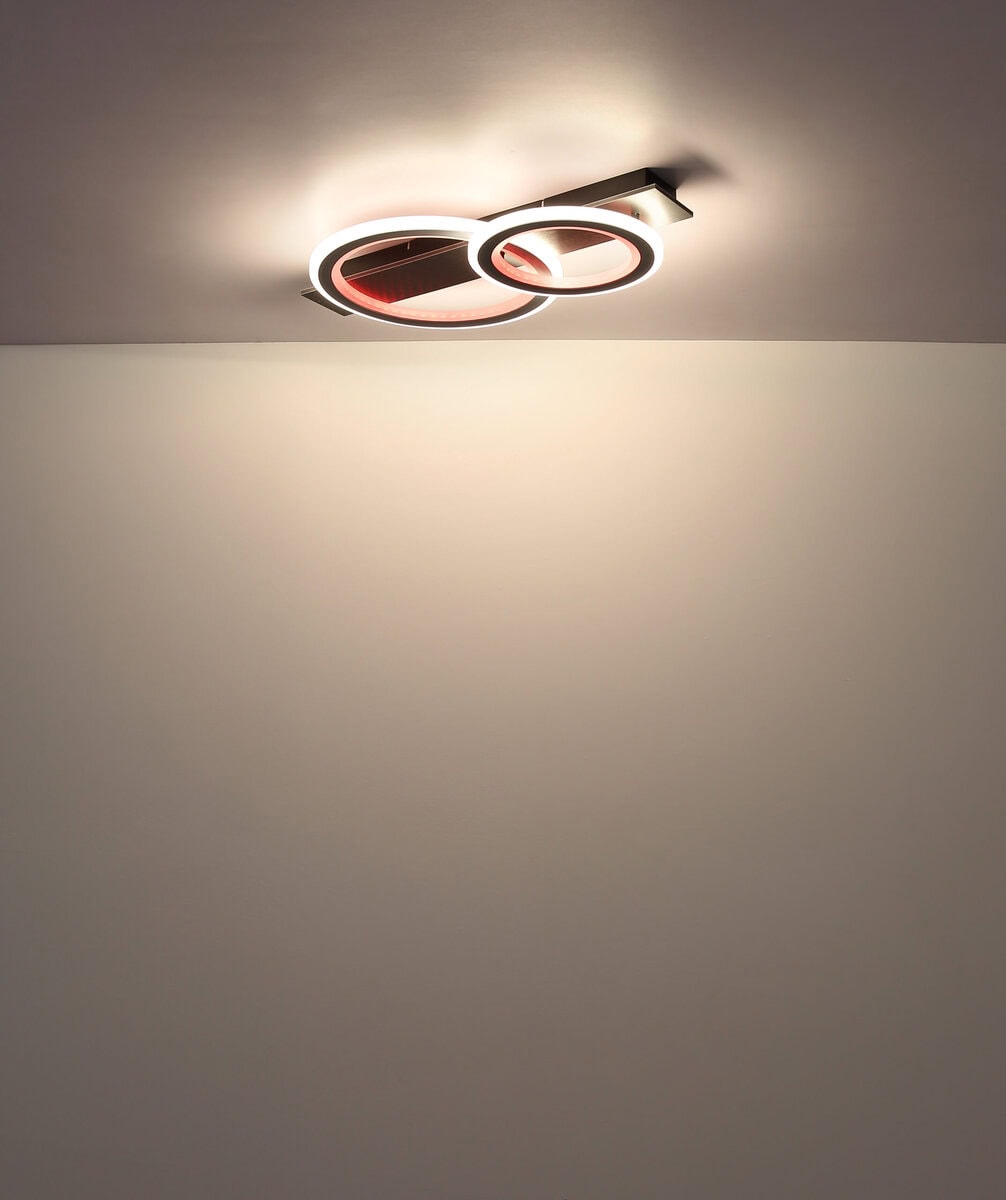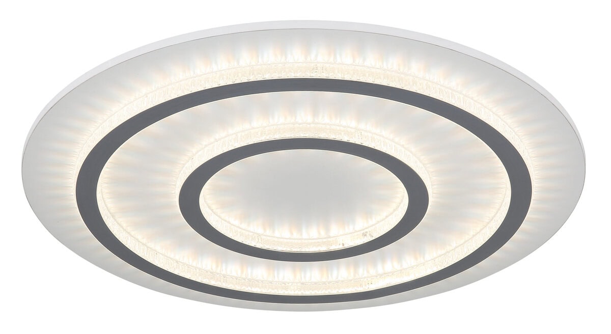 Stropna svjetiljka JAYDEN impresionira svojim modernim dizajnom i raznovrsnim funkcijama. Pravougaoni zidni natpis sa dva ofset prstena u kombinaciji sa kućištem od crnog, mat metala i brušene sive plastike daje lampi elegantan i savremen izgled. Sjenilo od svijetlosive metala i opal akrila osigurava ugodnu distribuciju svjetlosti. Sa daljinskim upravljačem koji je uključen u isporuku, možete prigušiti svjetlinu svjetla po želji i aktivirati promjenu RGB boje. Birajte iz širokog spektra boja koje se mogu popraviti ili uživajte u očaravajućem efektu duge. Temperatura boje je podesiva od 2700K do 6500K, tako da uvijek možete odabrati idealno svjetlo za svako raspoloženje i aktivnost. S veličinom od 630 mm x 350 mm, plafonska lampa JAYDEN je savršen izbor za moderne životne prostore. Funkcija memorije čuva vaša zadnja podešavanja.
