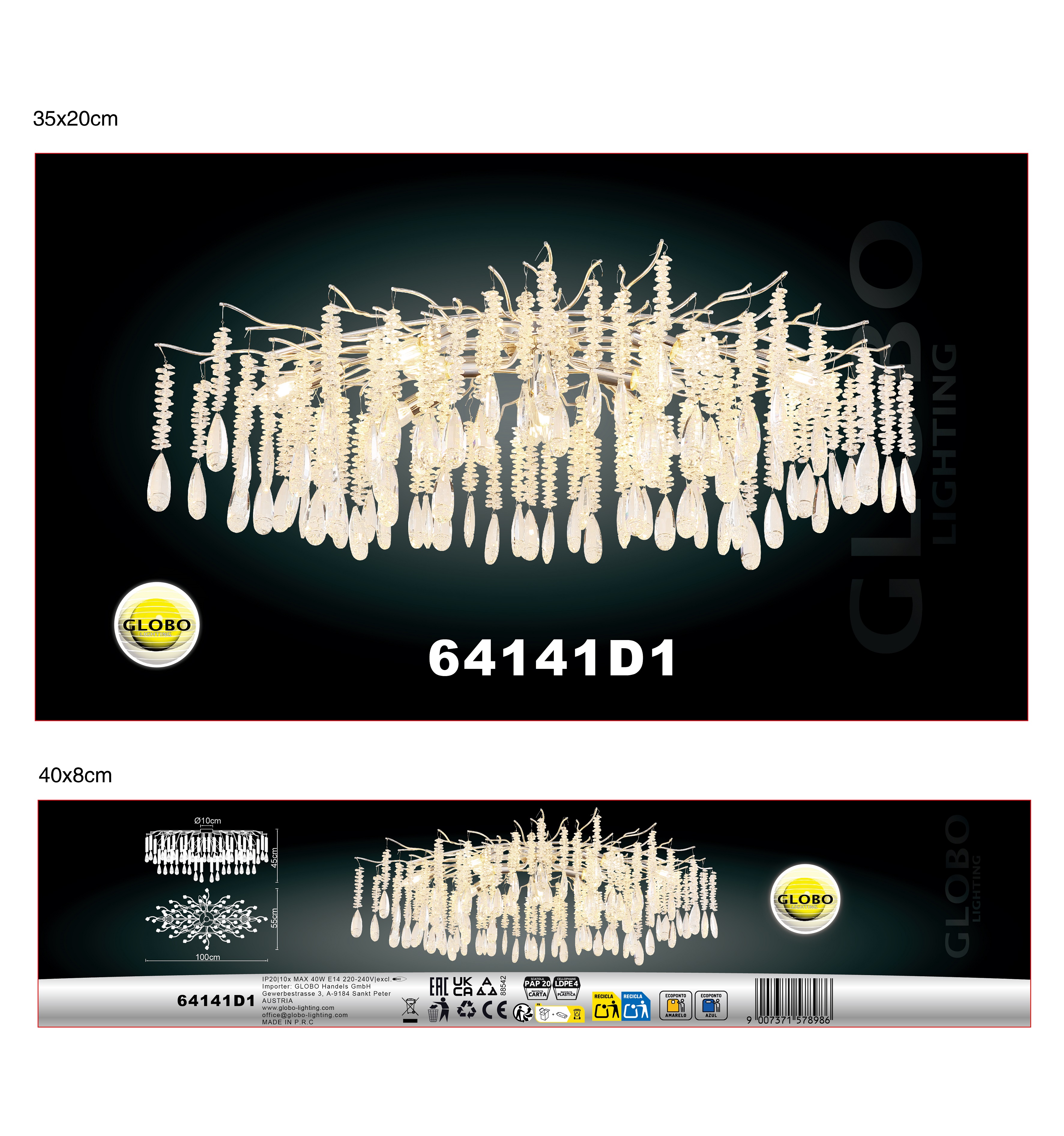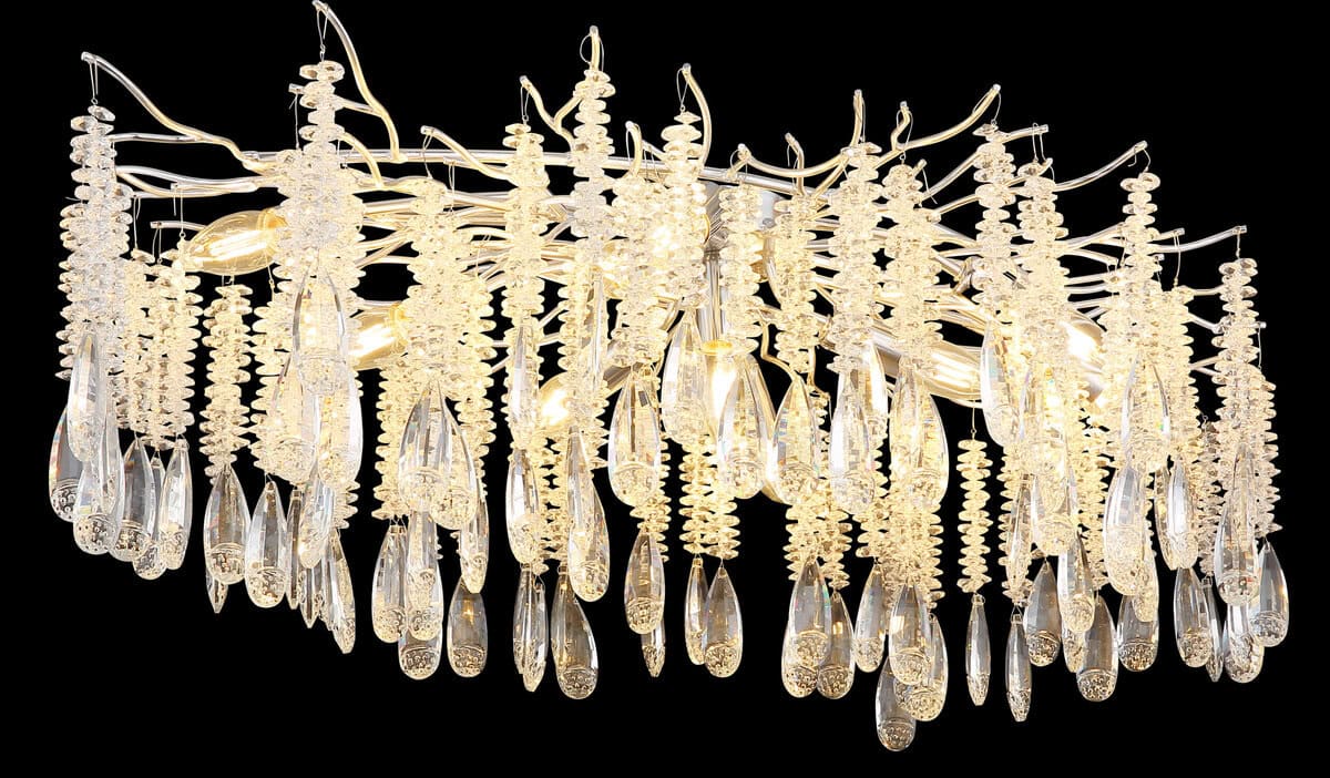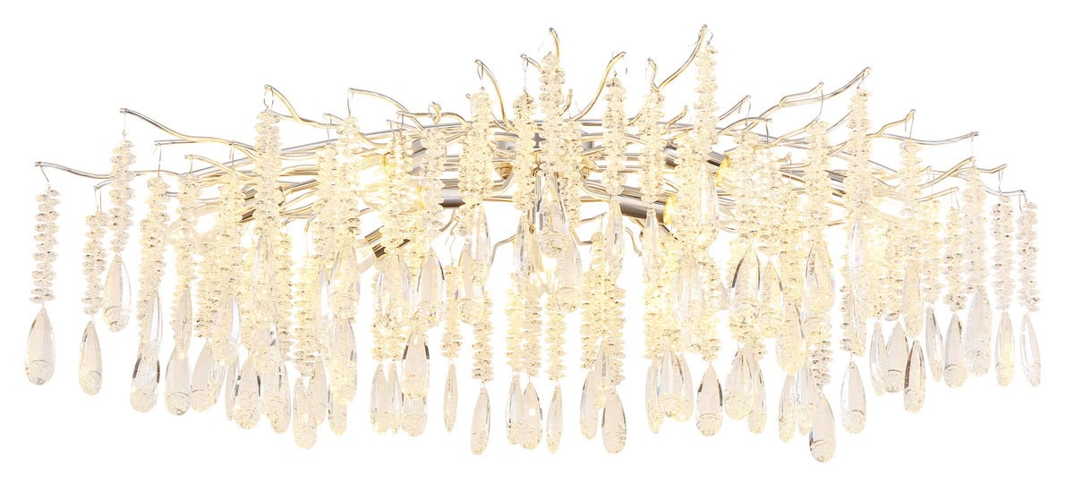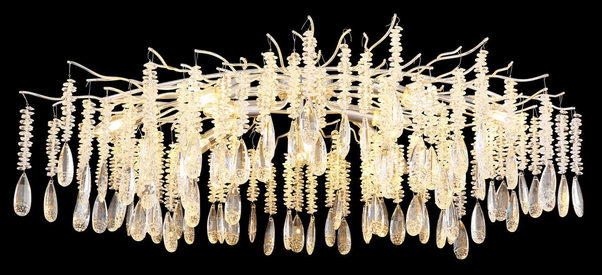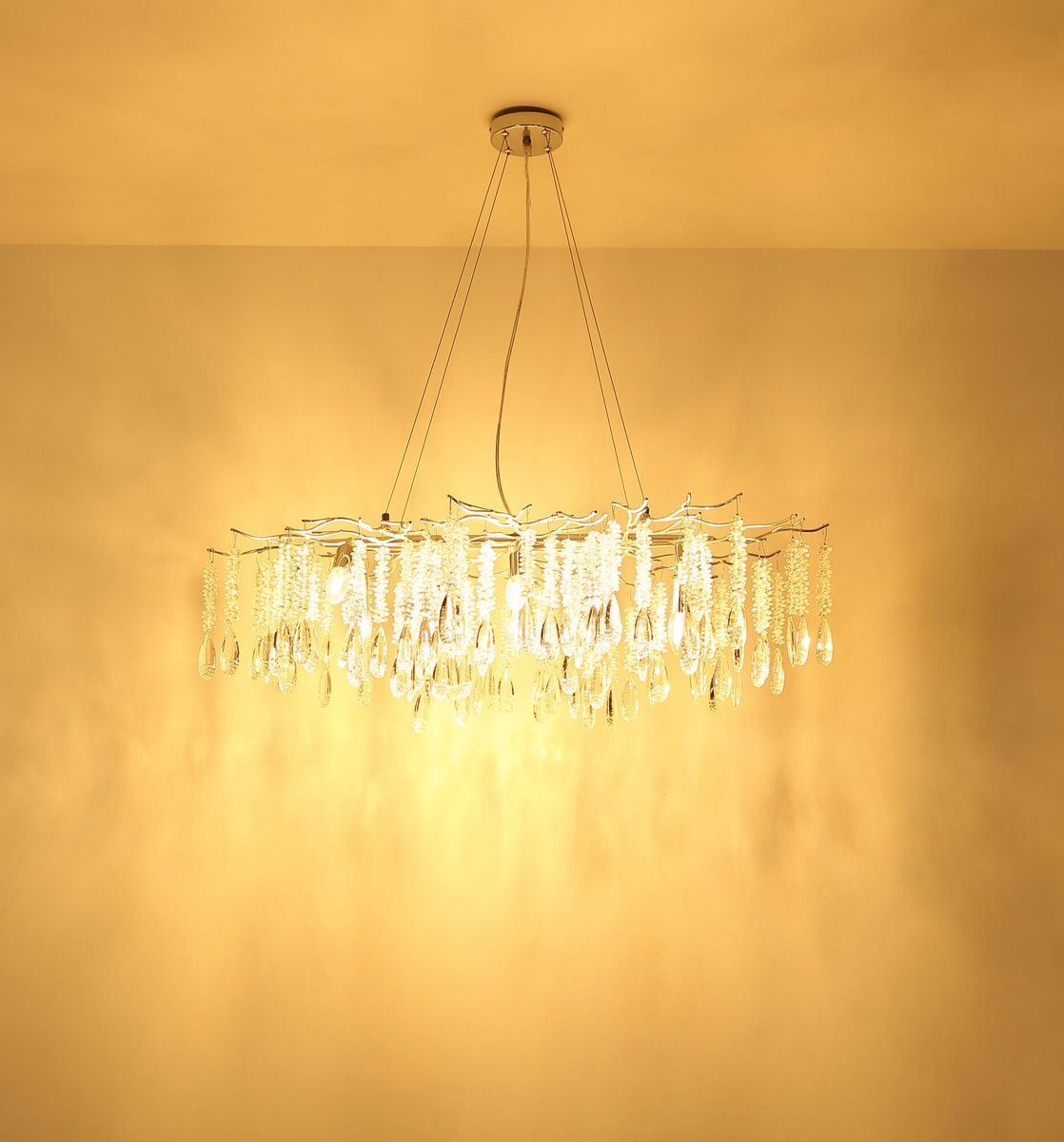 KINGA plafonska lampa kombinuje luksuzni dizajn sa organskom estetikom inspirisanom prirodom. Njegov ovalni okvir, izrađen od mat metala srebrne boje, podsjeća na nježne grane ukrašene blistavim kristalima od prozirnog stakla. Ovi kristali elegantno prelamaju svjetlost i stvaraju glamurozan ambijentalni sjaj u svakoj prostoriji. Sa značajnim dimenzijama od 1000 mm dužine i 550 mm širine, KINGA postaje upečatljiv središnji element — idealan za dnevne prostore, trpezarije ili impresivne hodnike. Dizajniran za E14 sijalice (nisu uključene), omogućava fleksibilan izbor boje i intenziteta svjetla. KINGA predstavlja elegantan stajling s daškom glamura, unoseći sofisticiranost i jedinstvenu atmosferu u vaš interijer. Ovaj stropni uređaj je savršen izbor za one koji traže dekorativnu estetiku i visokokvalitetne izrade u jednom izuzetnom rasvjetnom komadu.