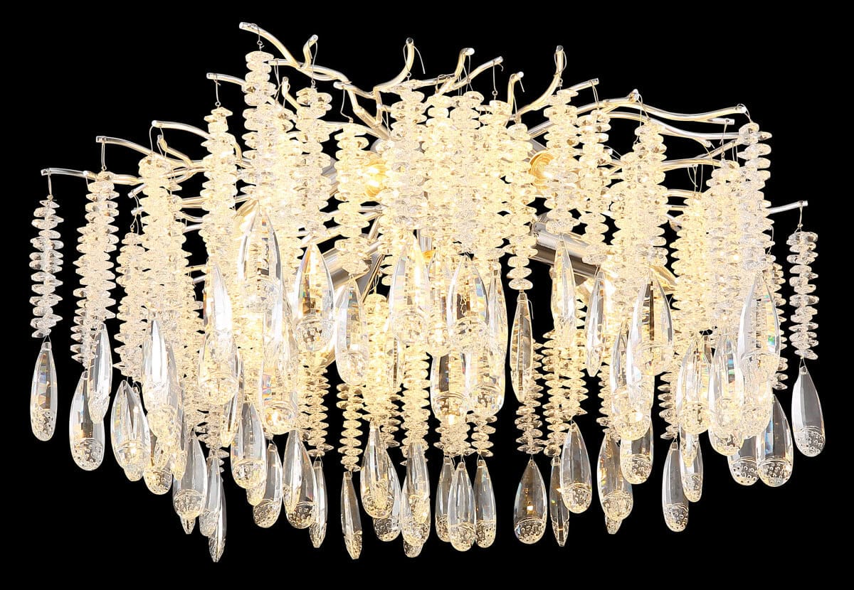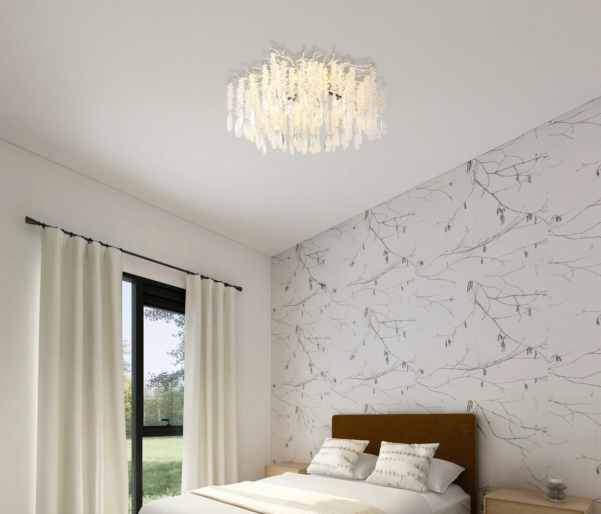 Okrugla plafonska lampa KINGA oduševljava svojim elegantnim dizajnom i visokokvalitetnim materijalima. Srebrni mat metalni okvir formira čvrstu strukturu koja se proteže u nježne grane ukrašene svjetlucavim kristalnim ukrasima. Prozirni stakleni kristali na sjenilu prelamaju svjetlost na fascinantan način, stvarajući magičan, svjetlucavi ambijent. Sa prečnikom od 600 mm, KINGA je idealna za velike dnevne ili prijemne sobe, gde služi kao stilski privlačan pogled. Za lampu je potreban E14 grlo (nije uključeno), što vam daje slobodu izbora izvora svjetlosti po želji. KINGA kombinuje moderan dizajn s plemenitim kristalnim štihom i osigurava skladnu distribuciju svjetlosti koja uljepšava svaku prostoriju. Savršeno za sve koji traže posebnu rasvjetu bezvremenske elegancije.