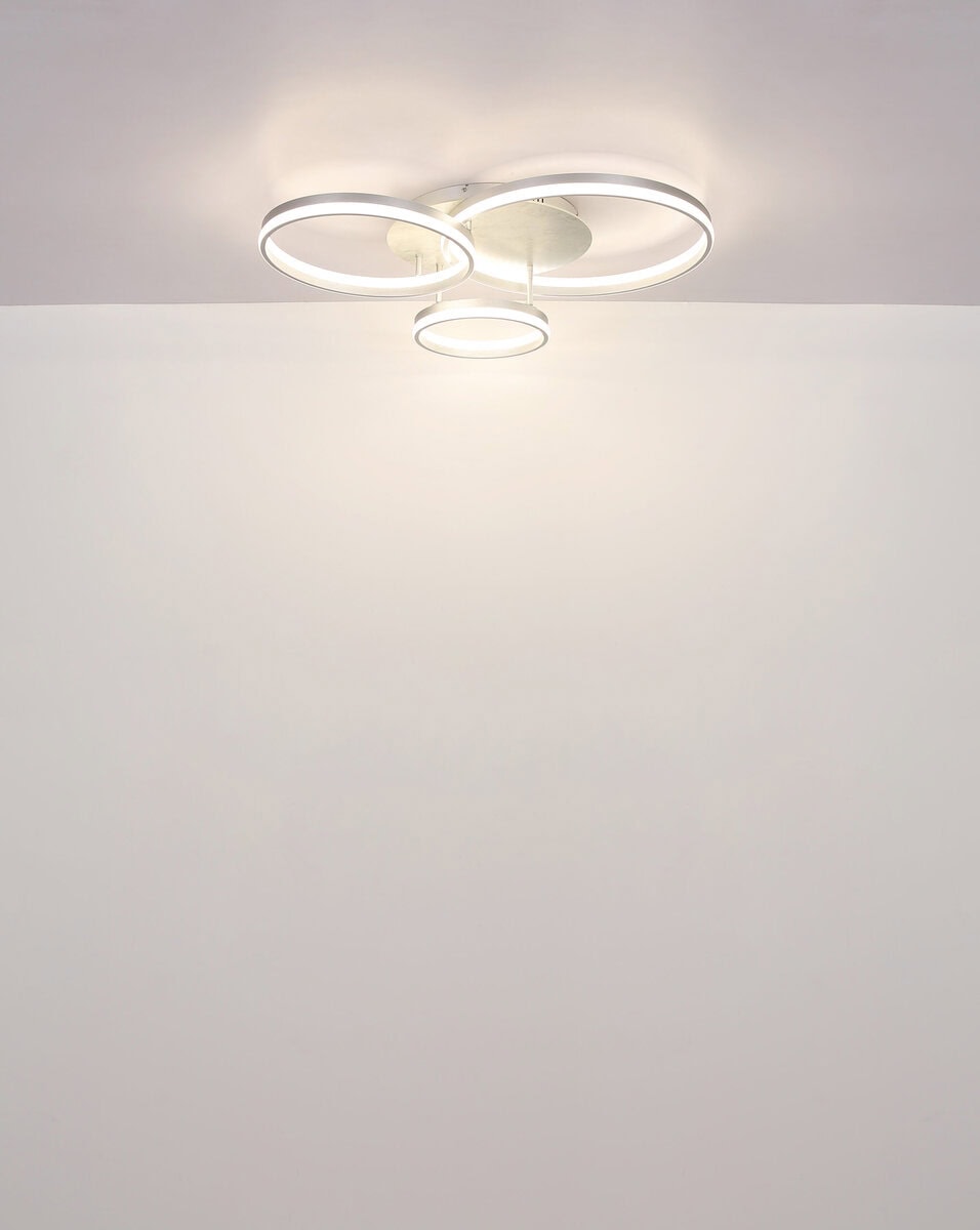 Otkrijte impresivnu PLAFONU MARI koja inspirira svojim izvanrednim dizajnom. Svojim pravougaonim oblikom i tri ofset prstena, koji su opremljeni plemenitim kristalnim dekorom, lampa postaje apsolutna privlačnost u svakoj prostoriji. Kućište izrađeno od mat metala srebrne boje i MDF-a u mramornom izgledu savršeno se uklapa u sjenilo od brušenog aluminija. Prozirni akrilni kristali i opalenska plastika pružaju fascinantne refleksije svjetlosti i toplu atmosferu. Sa dužinom od 855 mm i širinom od 685 mm, MARY ne nudi samo efektivno osvjetljenje sa izvanrednim lumenskim izlazom od 4600 lumena, već i široku temperaturu boje od 2700 K do 6500 K. Zahvaljujući integriranom daljinskom upravljaču, svjetiljka se može zatamniti, boje se mogu fiksirati i ima praktičnu funkciju memorije kao i noćno svjetlo. Unesite eleganciju i stil u svoj dom sa MARY PLAFONICOM!