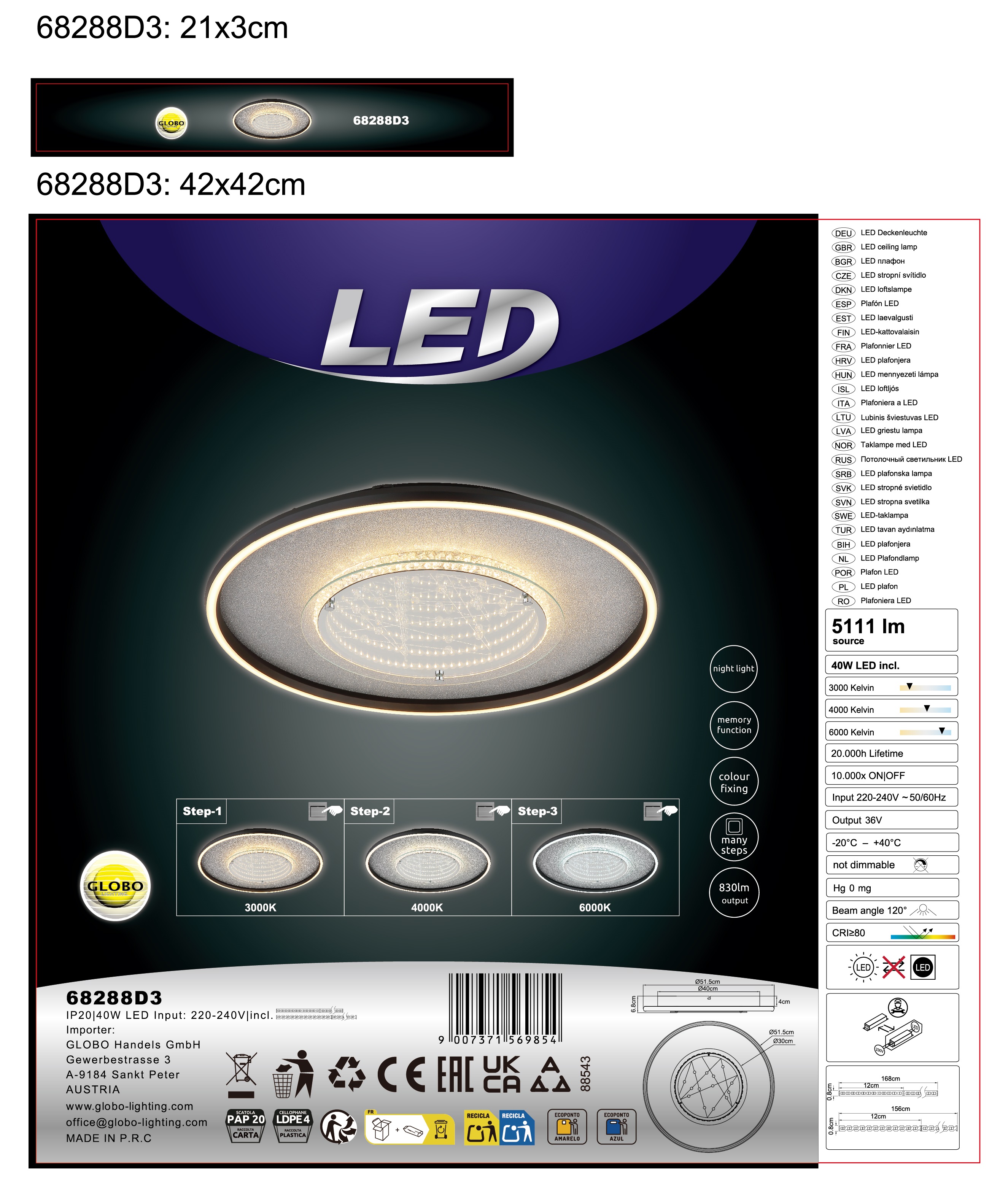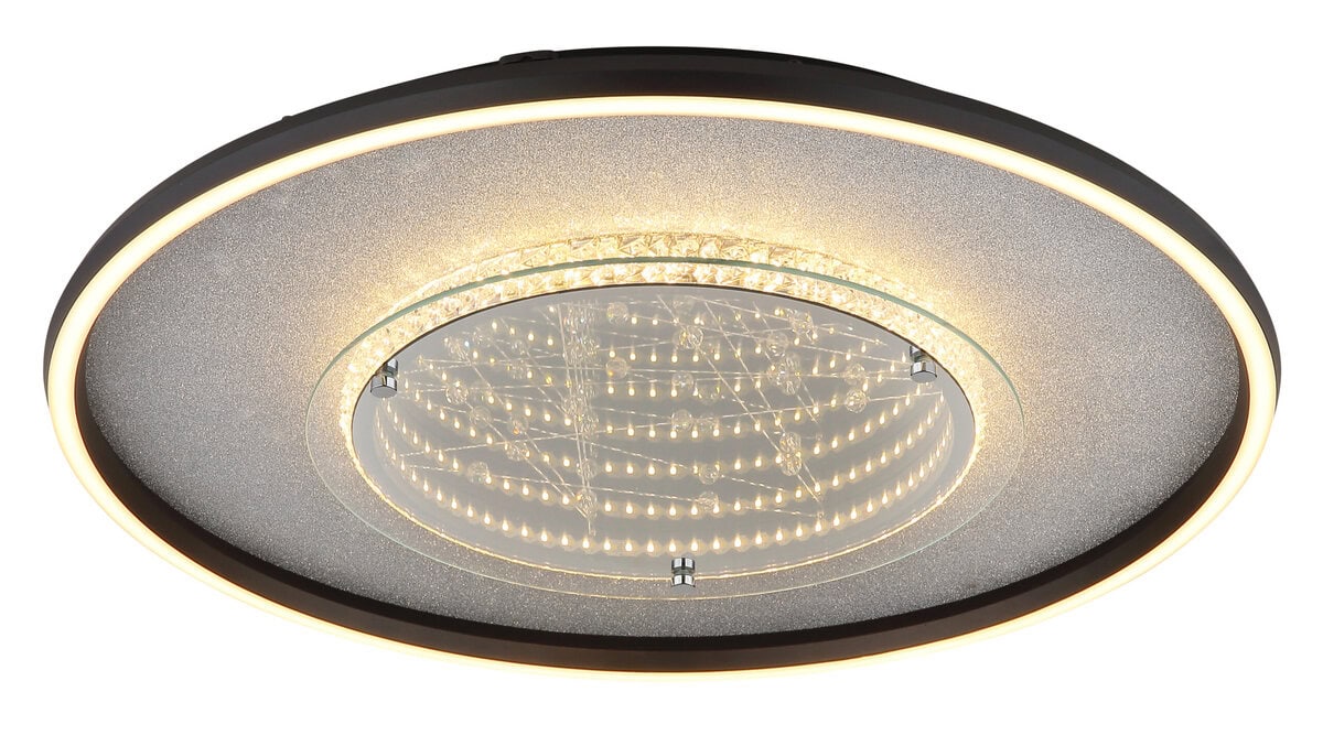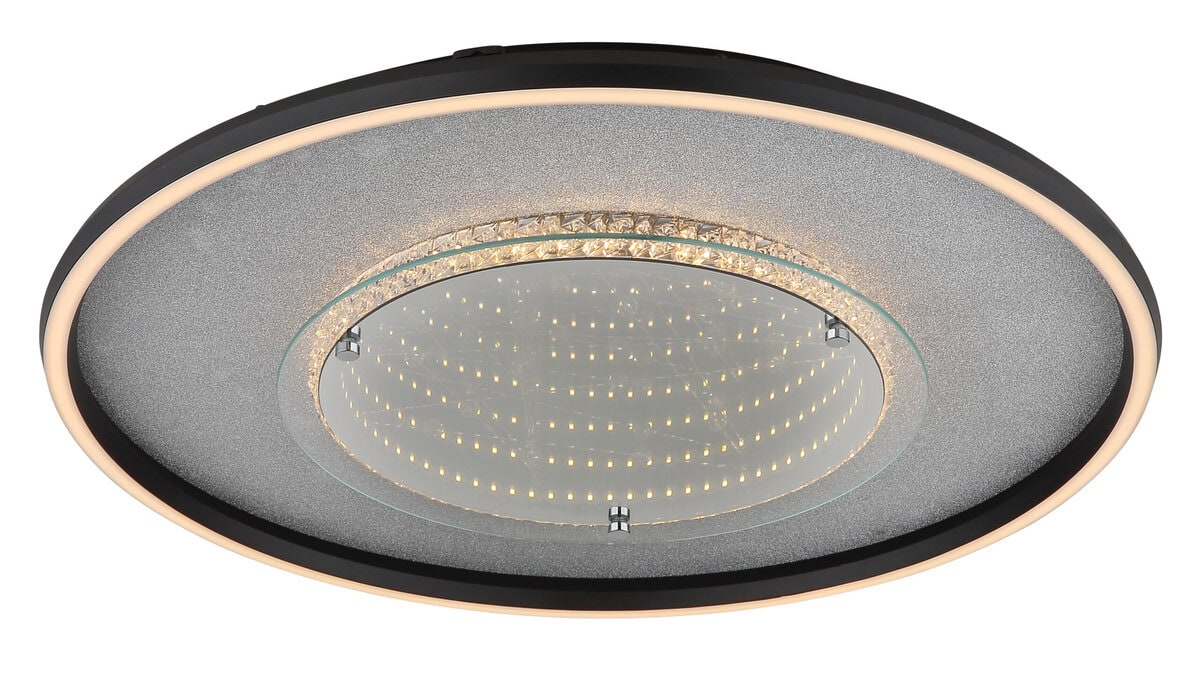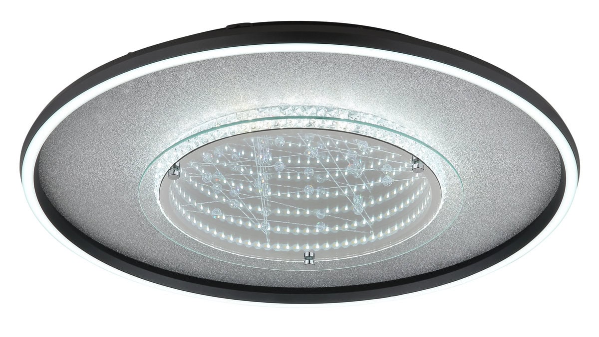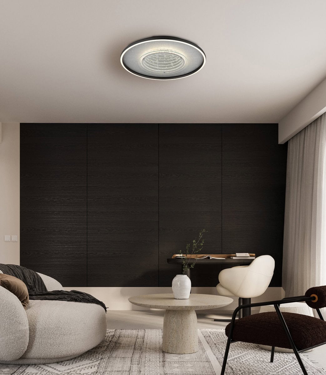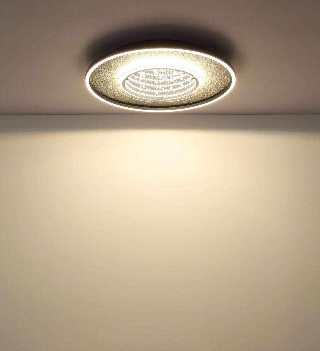 Okrugla plafonska lampa MIRRORA impresionira svojim jedinstvenim efektom tunela i prozirnim plastičnim kristalima iznutra, stvarajući fascinantnu 3D igru svjetla. Telo je izrađeno od mat crnog aluminijuma i kombinuje srebrne i hromirane metalne elemente, dajući lampi moderan, elegantan izgled. Sjenilo od ogledala sa plastičnim detaljima od opal pojačava učinak i stvara atmosferski ugođaj. Sa prečnikom od 515 mm, MIRRORA je idealna za dnevne sobe, spavaće sobe ili elegantne ulazne prostore. Integrisana LED daje 830 lumena i nudi fleksibilnu temperaturu boje od tople bijele (3000 K) do dnevne svijetlo bijele (6000 K). Boje se mogu fiksirati, a memorijska funkcija čuva posljednju postavku. Praktično noćno svjetlo upotpunjuje karakteristike. MIRRORA kombinuje moderan dizajn sa inovativnom tehnologijom osvetljenja i savršena je plafonska lampa za sofisticirane životne prostore.