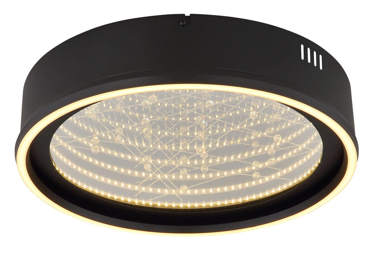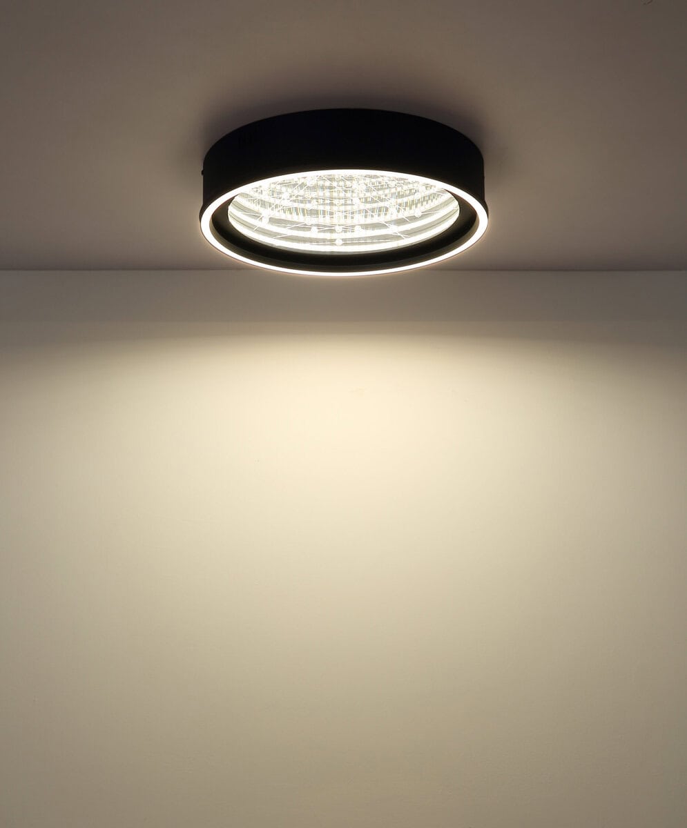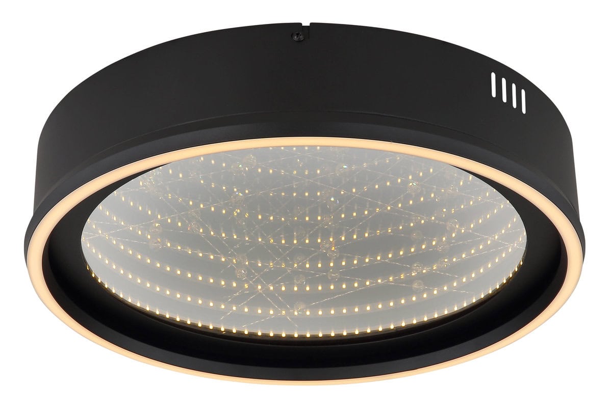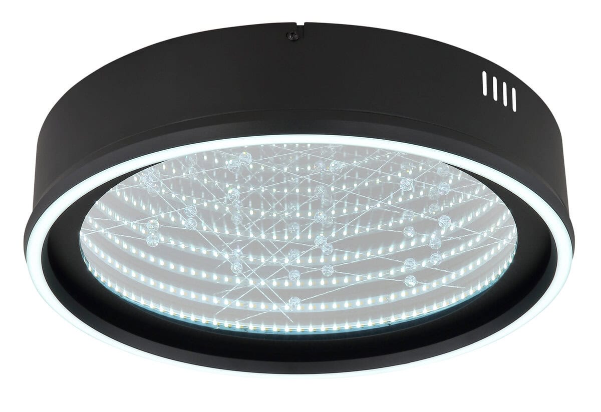 Okrugla plafonska lampa MIRRORA impresionira svojim fascinantnim efektom tunela i prozirnim plastičnim kristalima iznutra, stvarajući impresivnu 3D igru ​​svjetla. Mat crno metalno i aluminijumsko kućište savršeno nadopunjuje staklenu nijansu u ogledalu, pojačanu detaljima od opal plastike. Sa prečnikom od 515 mm, MIRRORA obezbeđuje atmosfersko i ravnomerno osvetljenje u dnevnim sobama, spavaćim sobama ili elegantnim ulaznim prostorima. Lampa ima mogućnost zatamnjivanja i dolazi sa daljinskim upravljačem, što omogućava fleksibilno podešavanje temperature boje od tople bijele (2700 K) do hladno bijele (6500 K). Boje se mogu fiksirati, a praktična memorijska funkcija čuva posljednju postavku. Integrirano noćno svjetlo upotpunjuje paket udobnosti. Ugrađeni LED daje 899 lumena, osiguravajući energetski efikasno osvjetljenje i dug životni vijek. MIRRORA kombinuje moderan dizajn s inovativnom tehnologijom rasvjete i savršen je izbor za sofisticirane životne prostore.