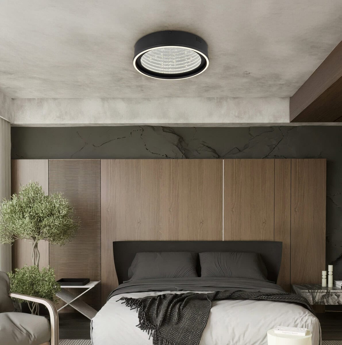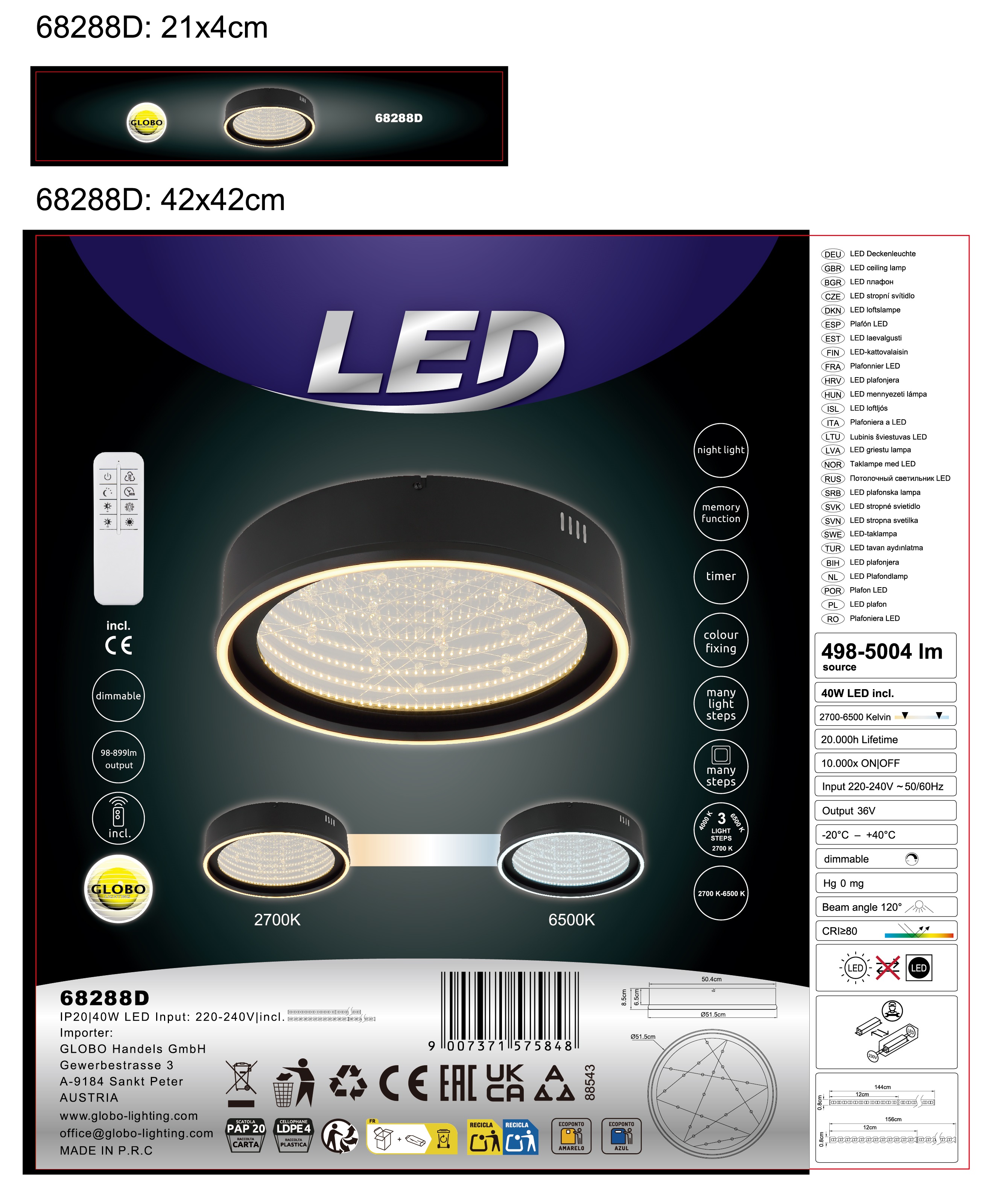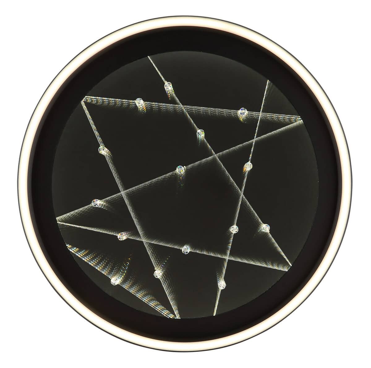 Okrugla plafonska lampa MIRRORA impresionira svojim fascinantnim efektom tunela i prozirnim plastičnim kristalima iznutra, stvarajući impresivnu 3D igru ​​svjetla. Mat crno metalno i aluminijumsko kućište savršeno nadopunjuje staklenu nijansu u ogledalu, pojačanu detaljima od opal plastike. Sa prečnikom od 515 mm, MIRRORA obezbeđuje atmosfersko i ravnomerno osvetljenje u dnevnim sobama, spavaćim sobama ili elegantnim ulaznim prostorima. Lampa ima mogućnost zatamnjivanja i dolazi sa daljinskim upravljačem, što omogućava fleksibilno podešavanje temperature boje od tople bijele (2700 K) do hladno bijele (6500 K). Boje se mogu fiksirati, a praktična memorijska funkcija čuva posljednju postavku. Integrirano noćno svjetlo upotpunjuje paket udobnosti. Ugrađeni LED daje 899 lumena, osiguravajući energetski efikasno osvjetljenje i dug životni vijek. MIRRORA kombinuje moderan dizajn s inovativnom tehnologijom rasvjete i savršen je izbor za sofisticirane životne prostore.