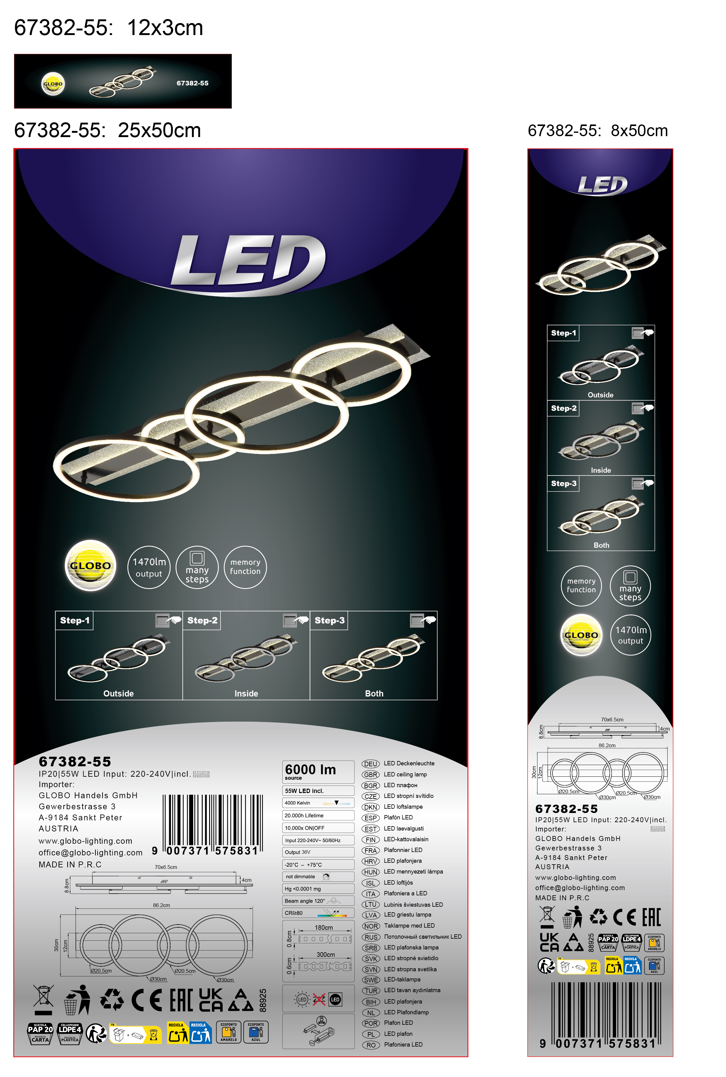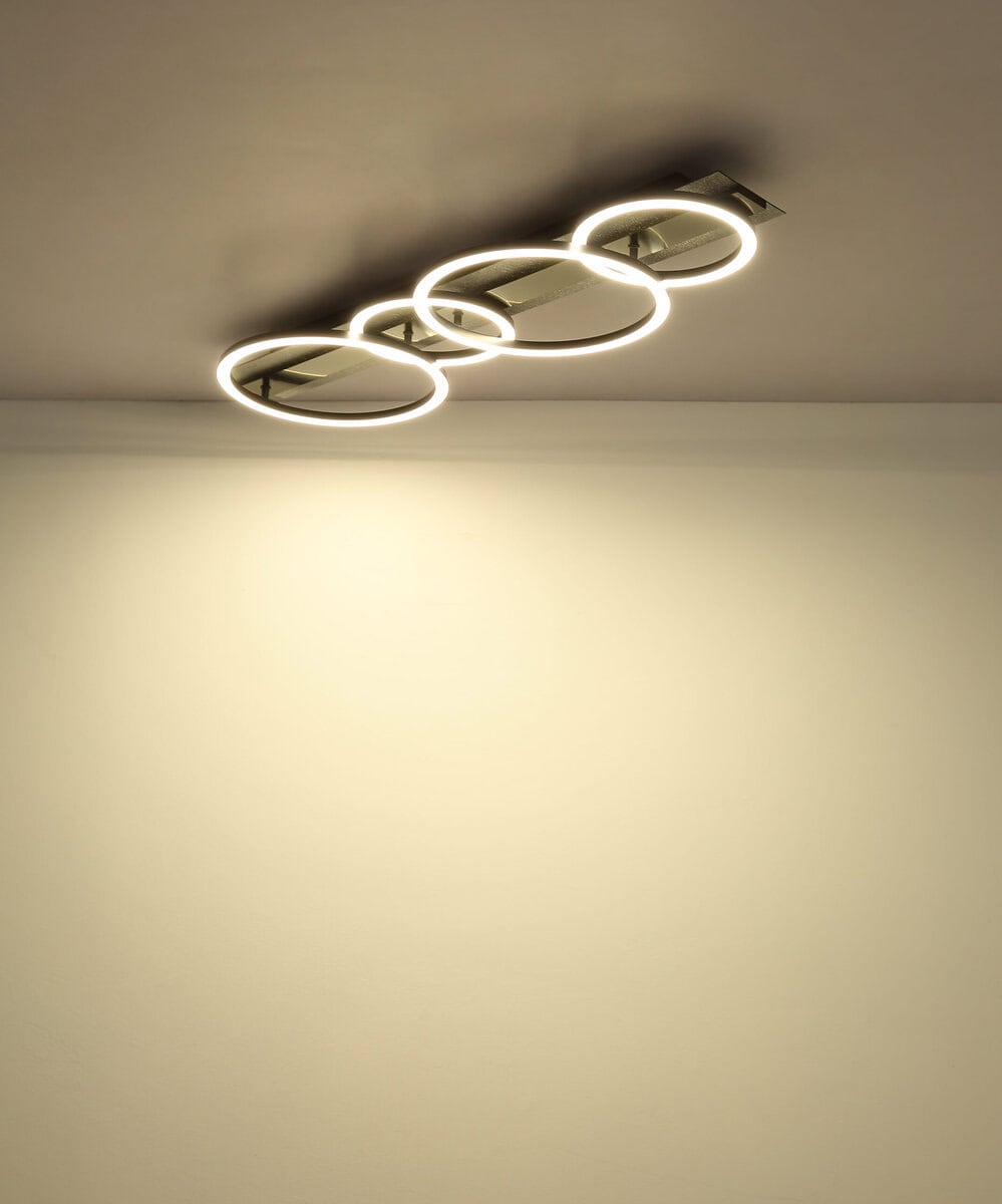 Plafonska lampa NORBERTO impresionira svojom modernom, pravougaonom zidnom pločom i četiri naslagana prstena, stvarajući dinamičan i upečatljiv svetlosni efekat. Tijelo, izrađeno od visokokvalitetnog metala u mat crnoj, sjajnoj srebrnoj i mat crno-hrom nehrđajućem čeliku, daje uređaju ekskluzivan, suvremen izgled. Sjenilo kombinuje mat crnu plastiku sa opal-bijelom plastikom za ravnomjerno osvjetljenje bez odsjaja. Sa izdašnim dimenzijama od 862 × 300 mm i svjetlosnom snagom od 1470 lumena, NORBERTO isporučuje neutralno bijelo svjetlo od 4000K—idealno za životne i radne prostore. Preko prekidača se mogu odabrati tri načina osvjetljenja: samo zvona, samo pozadinsko osvjetljenje ili oba zajedno kako bi odgovarali vašem raspoloženju. Funkcija memorije pohranjuje vaše posljednje postavke i vraća ih nakon uključivanja. Ugrađena LED tehnologija osigurava izdržljivost i energetsku efikasnost. Ovaj uređaj spaja sofisticiranu tehnologiju s elegantnim dizajnom—savršen izbor za profinjene interijere.