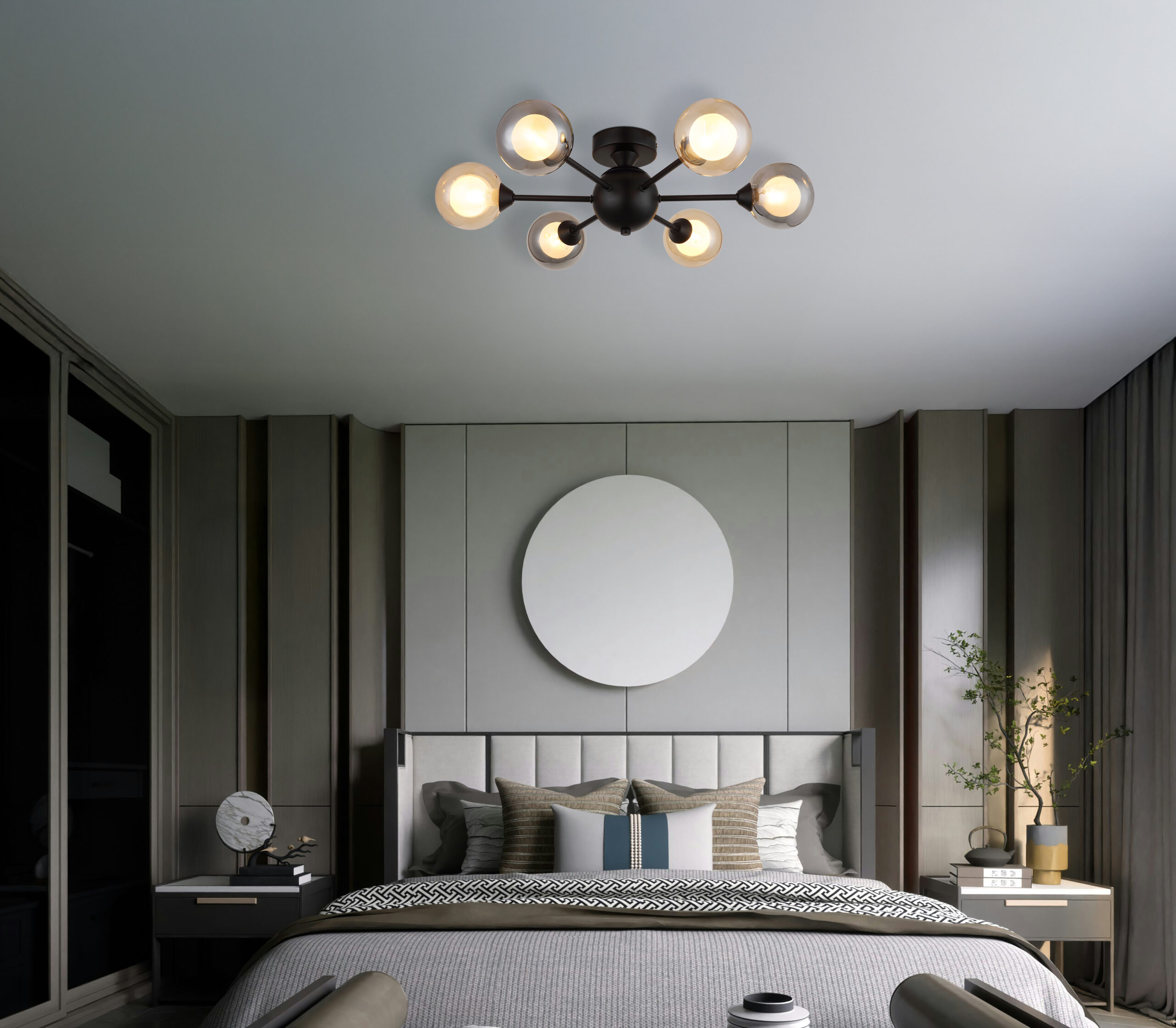 ROLAND plafonska lampa impresionira svojim jedinstvenim dizajnom, koji kombinuje klasičnu eleganciju sa modernim štihom. Sa 6 krakova raspoređenih u obliku zvijezde, ova lampa svakoj prostoriji daje poseban štih. Staklene kugle u bojama dim i ćilibar stvaraju toplu i privlačnu atmosferu osvjetljenja, pri čemu se svaka staklena boja skladno spaja u grupu od 3 x dim i 3 x ćilibar. Metalno kućište u mat crnoj boji stvara stilski kontrast staklenom izgledu i osigurava jednostavnu eleganciju. Svetlo je opremljeno G9 LED utičnicama (osim sijalica) i na taj način nudi štedljivo osvetljenje koje se može podesiti po potrebi. Savršena za dnevne i blagovaone, ROLAND stropna svjetiljka impresionira kako modernim tako i tradicionalnijim konceptima opremanja. Idealno za sve koji traže sofisticirani dizajn rasvjete s dozom luksuza.