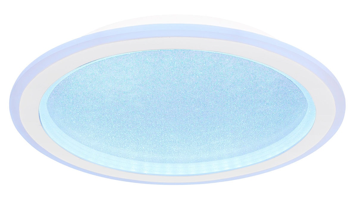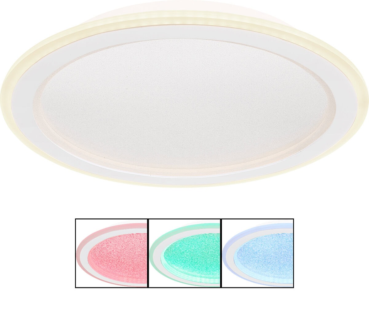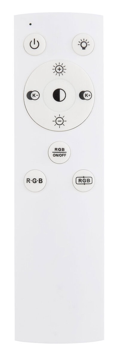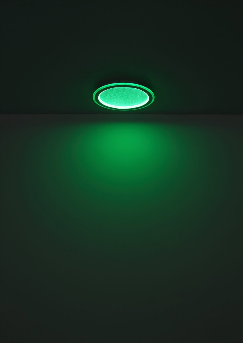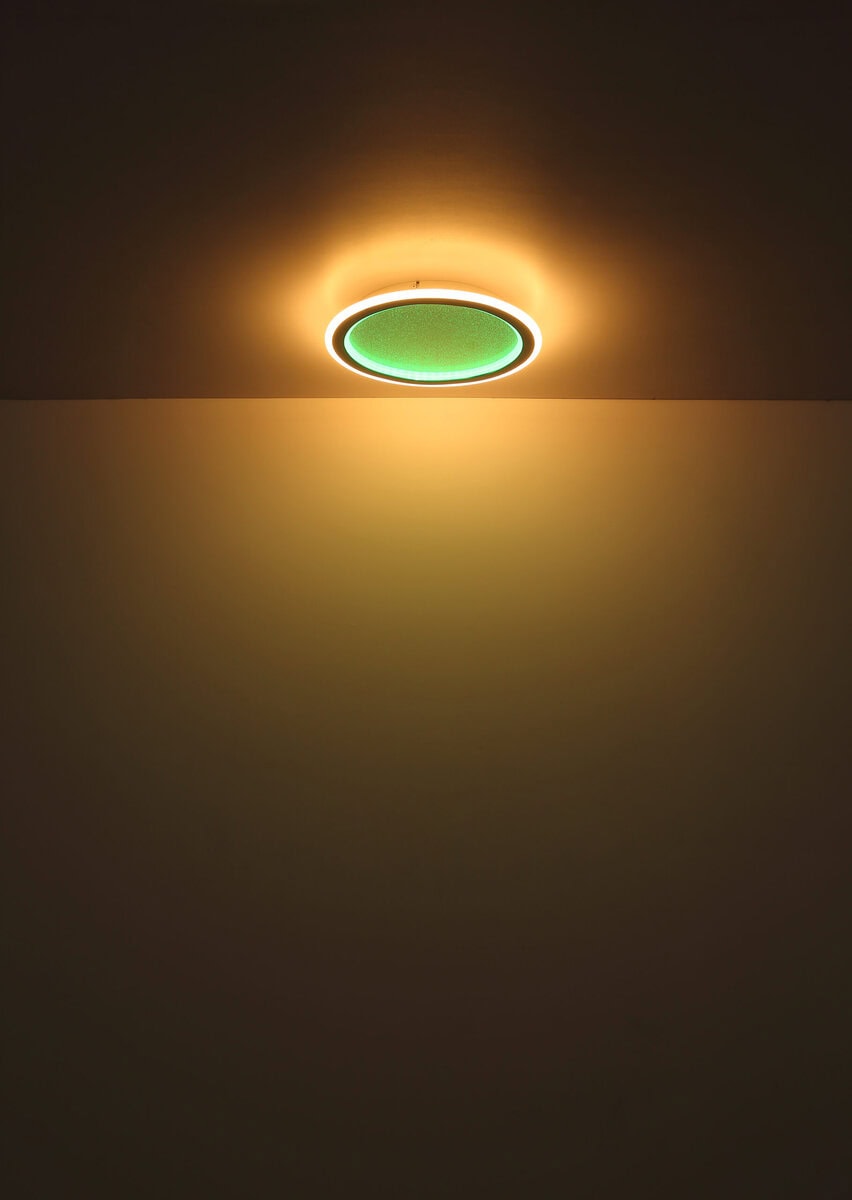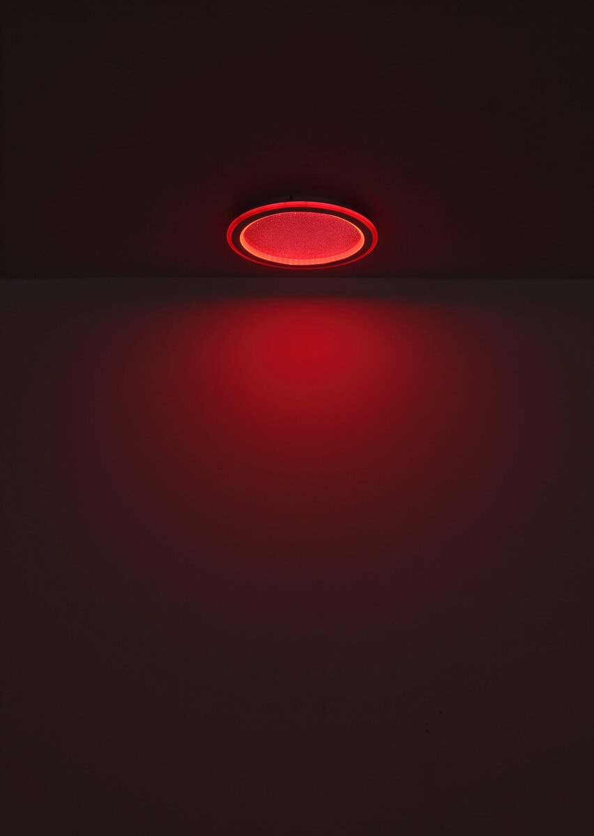 Ova sjajna plafonska lampa impresionira modernim dizajnom i funkcijama. Okrugla stropna lampa od bijelog metala (Ø 40 cm) ima toplo bijelo svjetlo od 27000 Kelvina do 6000 Kelvina hladno bijelo svjetlo i može se prigušiti i fiksirati u ovim vrijednostima. Koristeći priloženi daljinski upravljač, možete koristiti crveni, zeleni i plavi način rada, kao i sačuvati svjetlosne vrijednosti nakon isključivanja lampe.