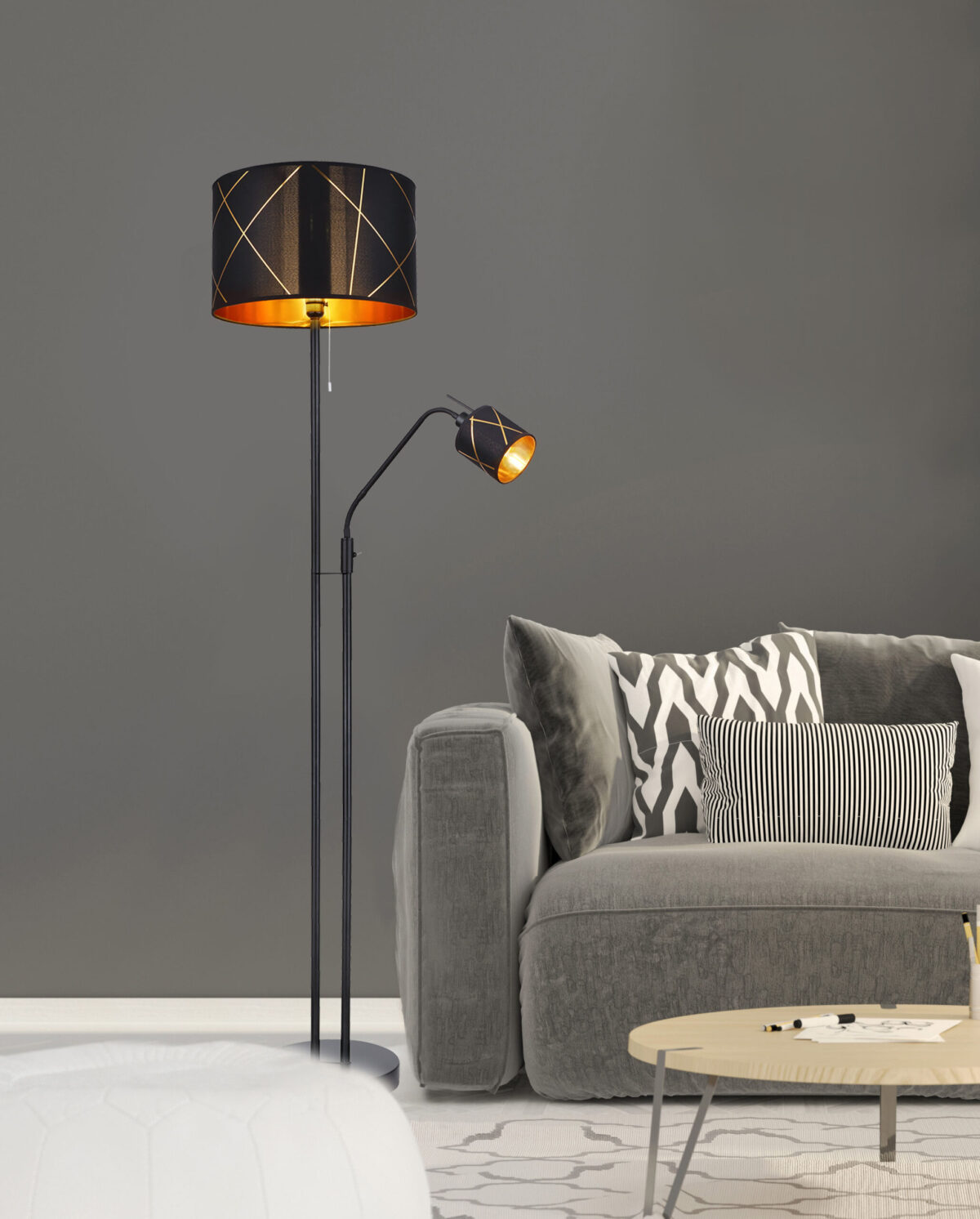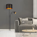 Čisti glamur utjelovljuje ovu crnu metalnu visilicu iz BEMMO serije. Podna lampa ima okrugli abažur sa ukrasnim štancanjem. Svjetlost ove predivne podne lampe predivno se reflektira akrilom zlatne boje pričvršćenim na unutrašnjost abažura. Dodatno svjetlo za čitanje sa prekidačem olakšava vam pretraživanje na sofi. Zahvaljujući flexo ruci, položaj se može lako podesiti po želji. Jednom slobodnim odabirom sijalica (osim 1xE27 max. 40W) za glavno svjetlo i jednom (osim 1xE14 max. 25W) za svjetlo za čitanje, odlučujete u kojoj boji će svijetliti vaš dom.