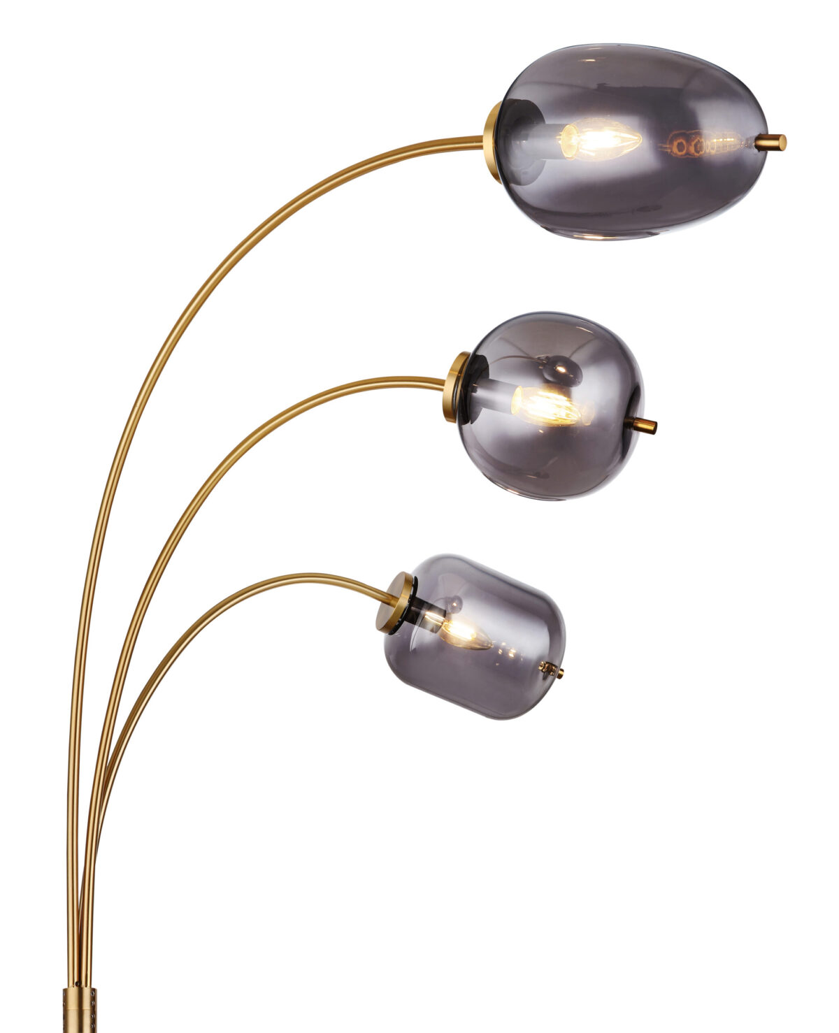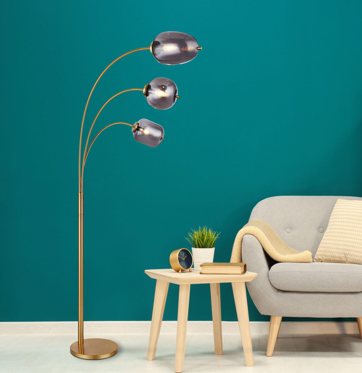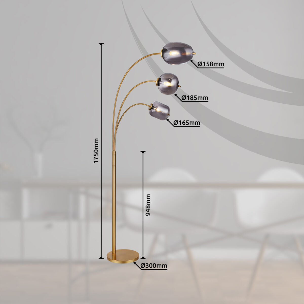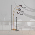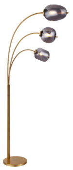 Ova sjajna podna lampa iz serije Blacky inspirira svojim prekrasnim dizajnom. Iz baze u boji mesinga viri metalna šipka iz koje vire tri druge metalne šipke u mesinganim bojama, svaka sa E14 nastavkom na vrhu. Na utičnicama E14 nalazi se zadimljeno staklo u različitim oblicima i omogućava vam da slobodno birate do maksimalne snage od 40 vati.