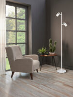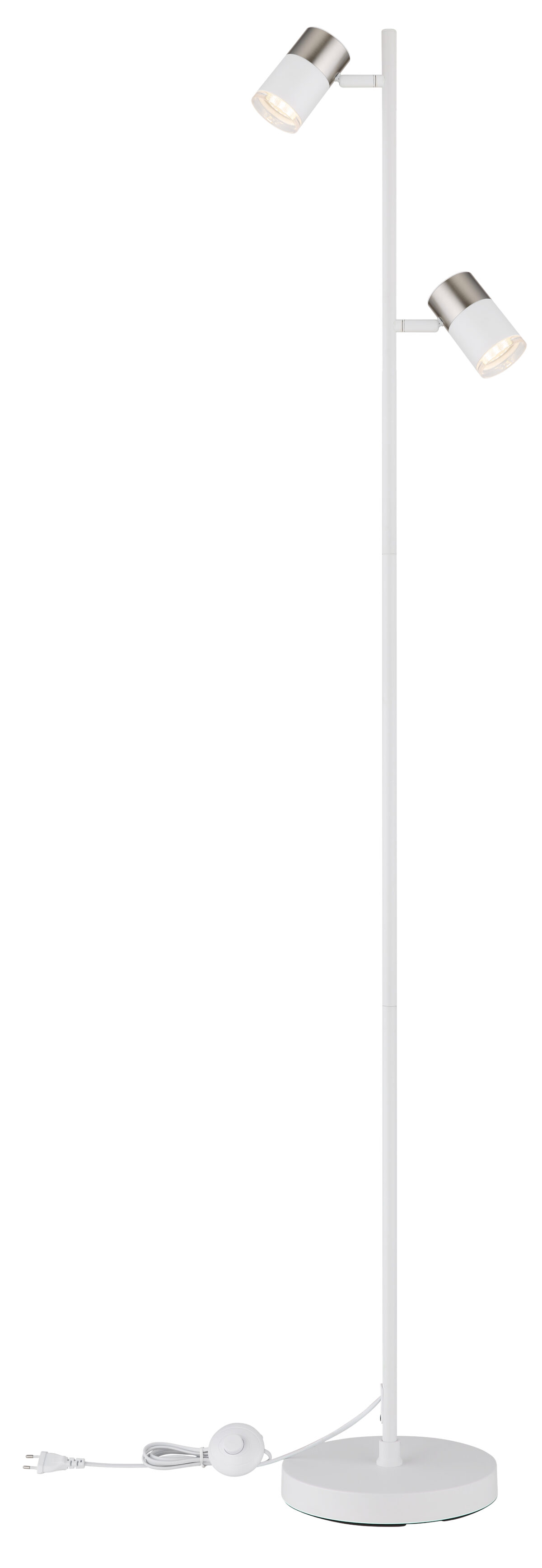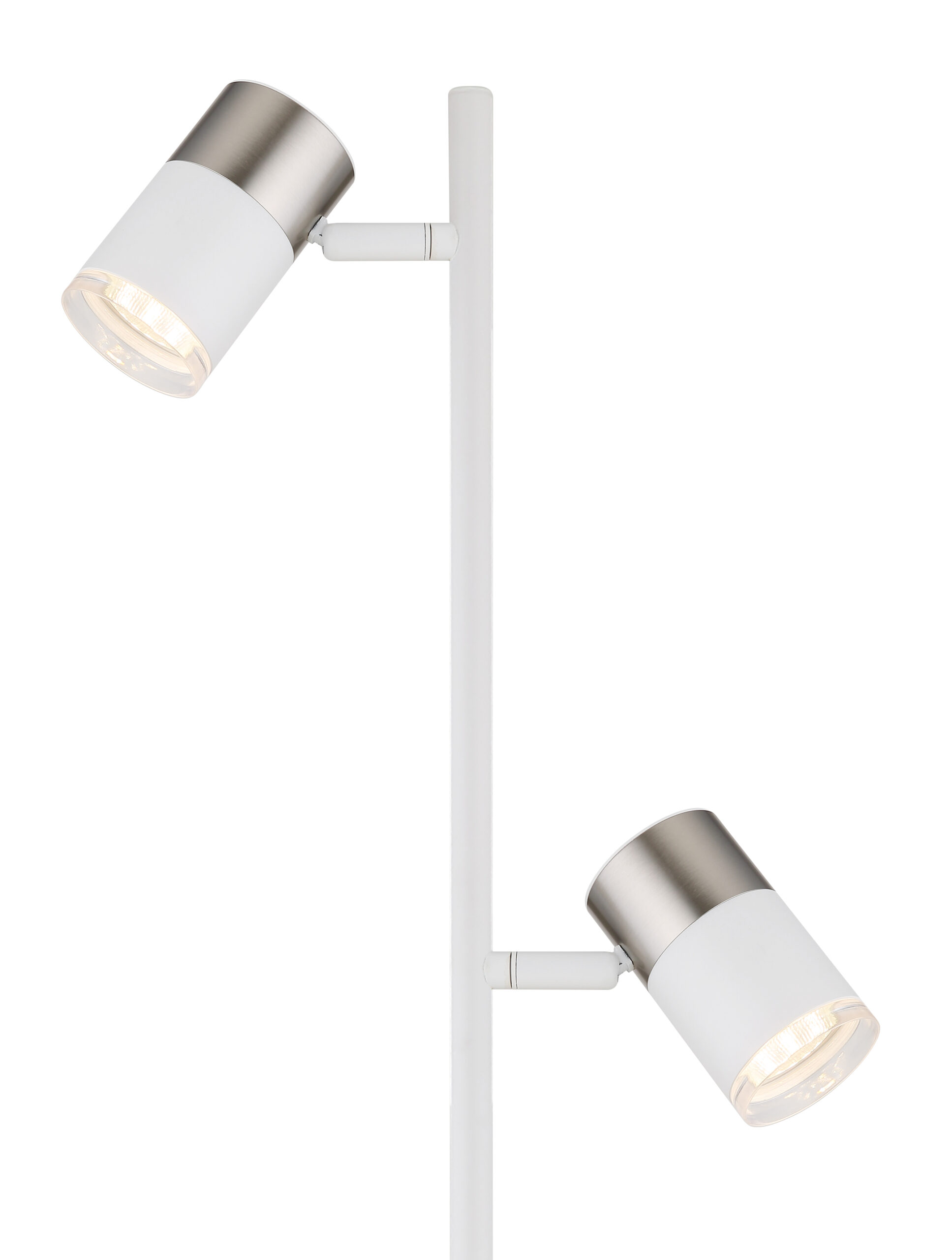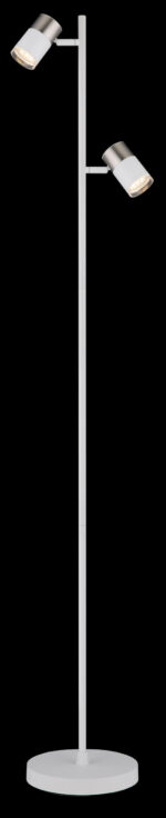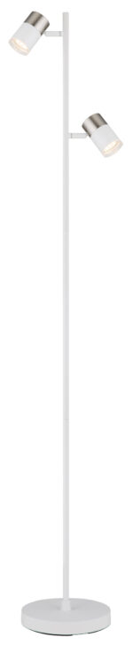 Moderna podna lampa s ravnom cijevi i dva cilindrična reflektora s ukrasnim prstenom stilski je dodatak vašim životnim prostorima. Podna lampa je izrađena od mat bijelog metala i ima dva GU10 LED reflektora ukupne snage 5W. Sjenila su izrađena od visokokvalitetnog aluminija u mat nikal i bijeloj boji, kao i od prozirne plastike koja lampi daje elegantan izgled. Sa dimenzijama od 215 mm dužine i 230 mm širine, podna lampa se savršeno uklapa u svaki kutak vaše sobe i pruža ugodno svjetlo. Praktičan nožni prekidač u kablu olakšava rukovanje svetiljkom. Unesite stil i svjetlinu u svoj dom s ovom bijelom metalnom podnom lampom i stvorite ugodnu atmosferu modernog dizajna.