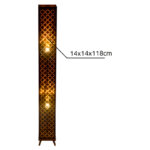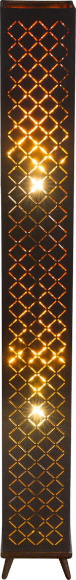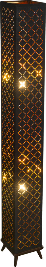 Kvadratna podna lampa (15×15 cm) ove serije modela ističe se svojim individualnim plemenitim dizajnom. Podna lampa visoka 1,18 metara sastoji se uglavnom od crnog tekstila ukrašenog oblikovanim ukrasnim udarcima, koji je iznutra prekriven zlatnim listićima. Ova unutrašnja lampa je opremljena sa dva grla E27, što vam omogućava da sami odredite sijalice (max.40W) kako biste odlučili o intenzitetu svjetlosti i boji svjetla. Zbog uštede energije i dugovečnosti preporučujemo LED lampe. Standardni prekidač za uključivanje/isključivanje i priključni kabel dužine 1,5 metara čine ih fleksibilnim. Dodatne lampe iste serije modela mogle bi upotpuniti sliku u vašem području.