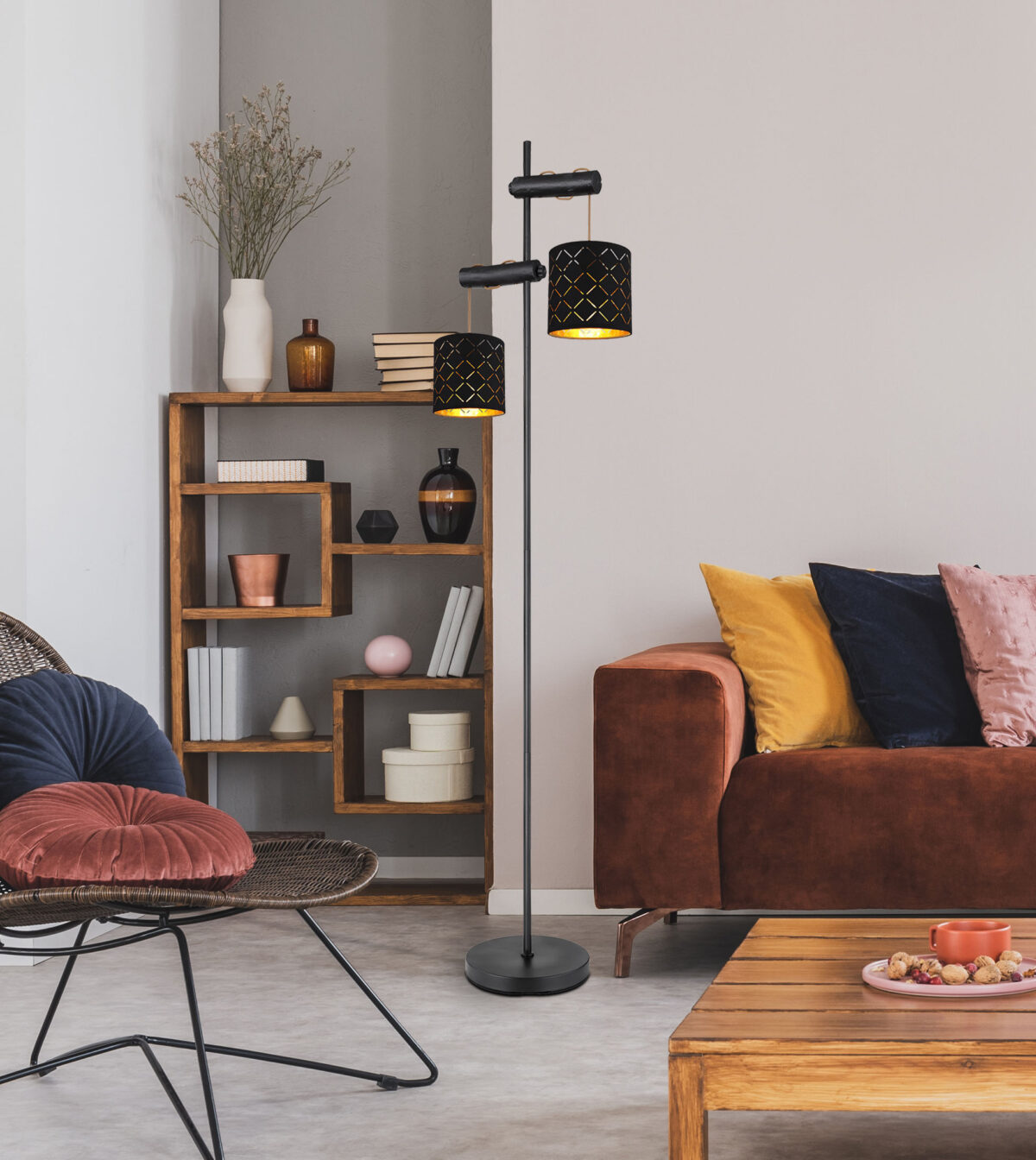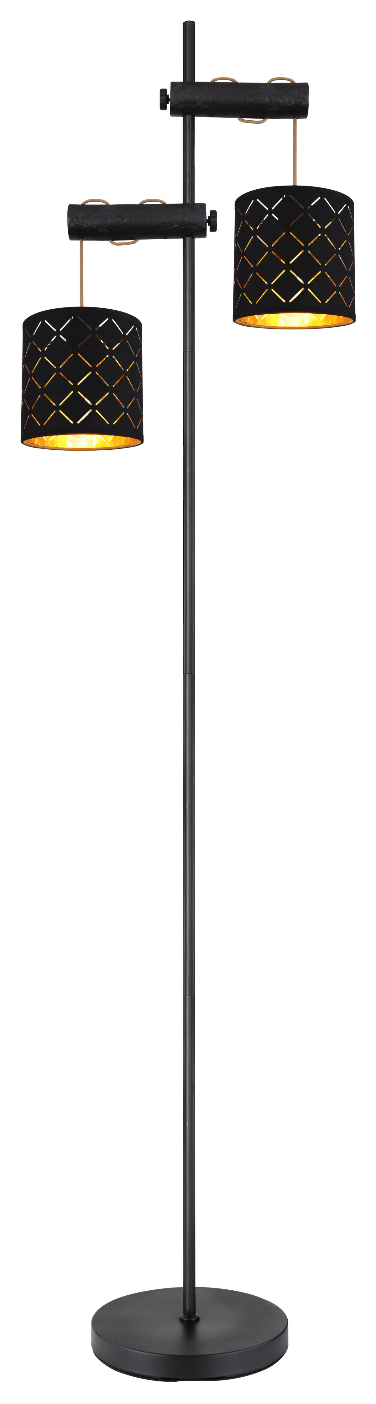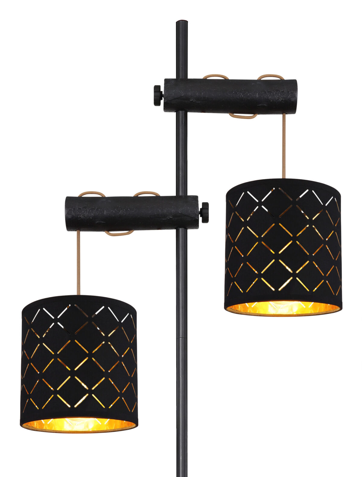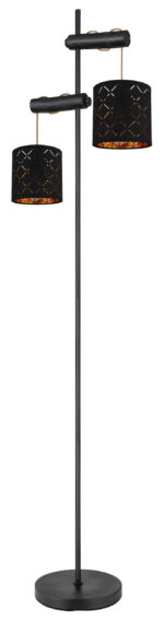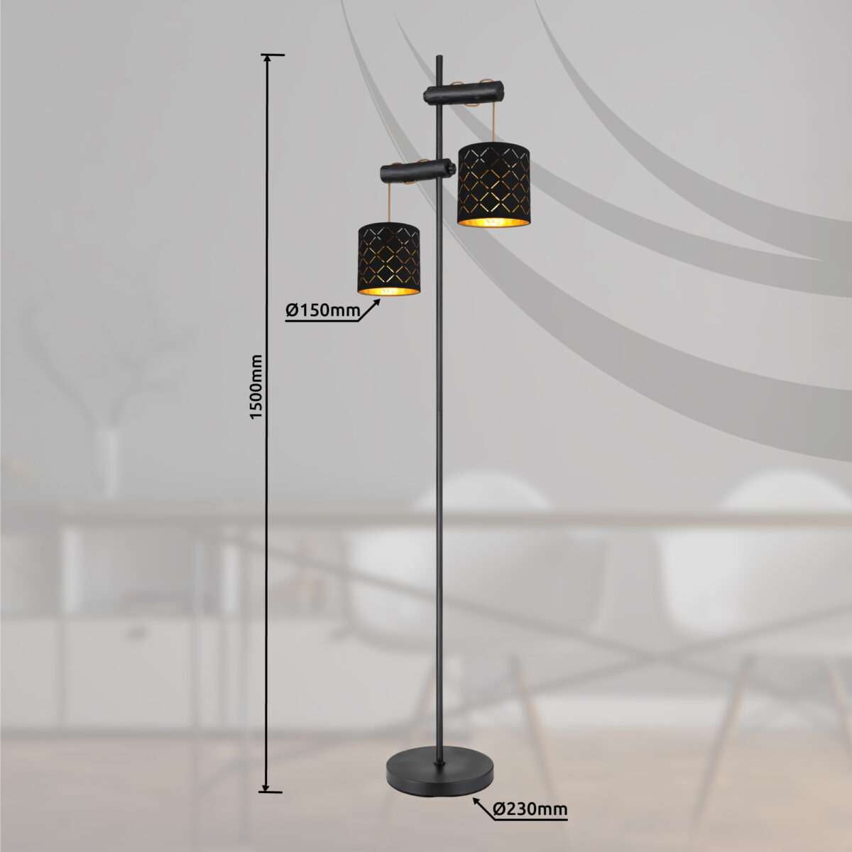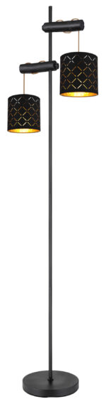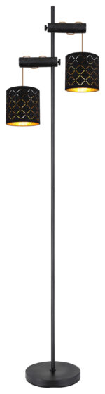Ova podna lampa iz Clarke serije uvjerava svojim prekrasnim dizajnom crne i zlatne boje. Podna lampa se sastoji od 2 crna mat sjenila sa ukrasnim udarcima, od kojih je svaki opremljen E27 grlom i visi na kablovima zlatne boje. Oni su podesivi po visini na crnoj mat metalnoj šipki visokoj 1,5 m. Sa grlom E27 možete koristiti sijalice po izboru, do maksimalne snage 40 vati. Sa ostalim modelima ove serije možete uljepšati svoj dnevni boravak.