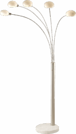 Elegantna i moderna, ova divna nikal mat podna lampa u kombinaciji sa mermernom postoljem. Pet montiranih reflektora okruženo je staklenim sjenilima, a E14 utičnice vam ostavljaju slobodu da sami odlučite koji izvor svjetlosti (maks. 40W) želite koristiti, a time i intenzitet svjetla i boju svjetla. Priloženi dimer i veličina od 210 cm upotpunjuju cjelinu.