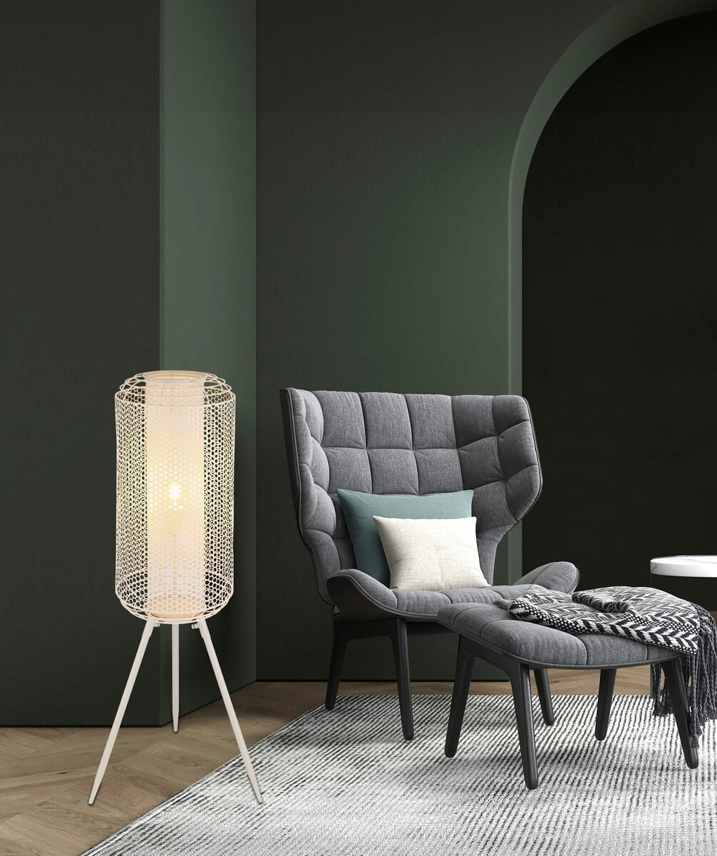 Sa svojim šarmantnim, okruglim dizajnom i mekom metalnom završnom obradom krem ​​boje, podna lampa DENTON donosi ugodnu atmosferu u svaku prostoriju. Tri čvrste noge daju lampi stabilan oslonac i elegantan izgled. Jednostavna, okrugla nijansa diskretno se uklapa u različite stilove interijera i osigurava ugodnu distribuciju svjetlosti. Sa prečnikom od 300 mm, DENTON je kompaktan i svestran—idealan za dnevne sobe, kancelarije ili spavaće sobe. Preklopni prekidač na kablu omogućava jednostavno rukovanje, dok E27 grlo (bez sijalice) daje vam slobodu izbora savršenog izvora svetlosti. DENTON kombinuje klasičan dizajn sa praktičnom funkcionalnošću, što ga čini savršenim dodatkom za stilski osviještene sobe koje cijene bezvremensku eleganciju.