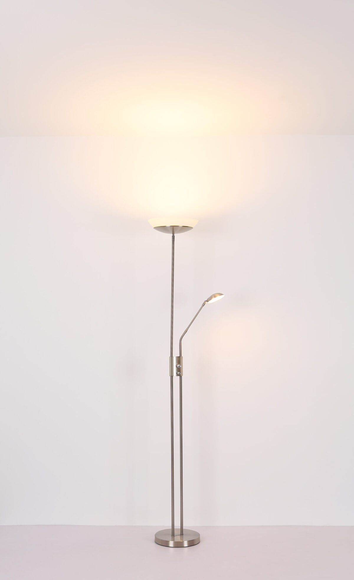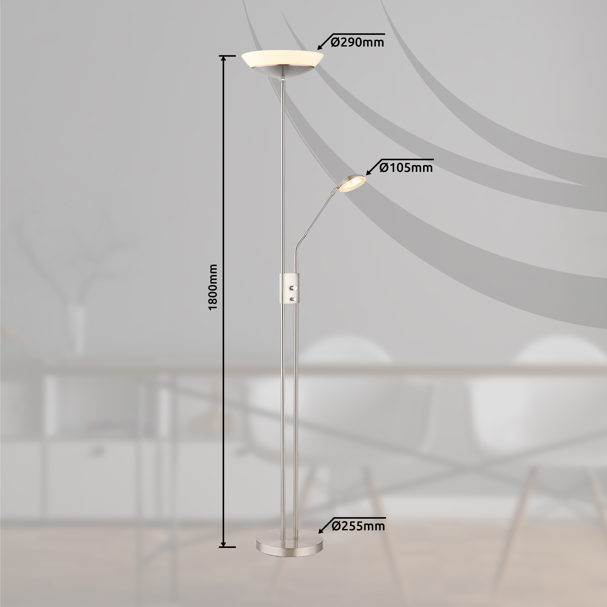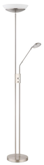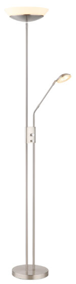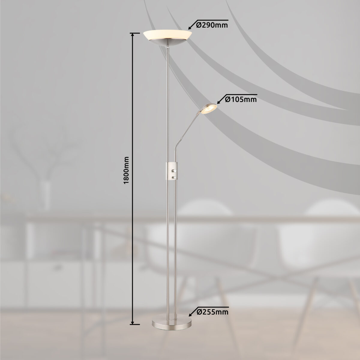 Zapanjujuća rasvjeta koja će vašoj sobi dati toplu atmosferu. Reflektor je napravljen od nikl mat metala i opal stakla koje emituje meku svjetlost. Plastika ima satensku završnu obradu i zaokružuje stilski izgled. Sa promjerom od 290 mm i visinom od 1800 mm, ova svjetiljka je prava privlačna za oči u svakoj prostoriji. Reflektor se može prigušiti i ima beskonačni dimer na dodir. Može se rotirati i okretati i ima flekso ruku. Svjetlo za čitanje ima prečnik 10,5 cm. Imajte na umu da se reflektor isporučuje isključujući 1x LED 18.5W 230V, koji ima intenzitet svjetlosti od 1370lm izlazne svjetlosti i temperaturu boje od 3000K. Svjetlo za čitanje napaja LED od 4,5W 230V, koji ima jačinu svjetlosti od 320lm i temperaturu boje od 3000K.
