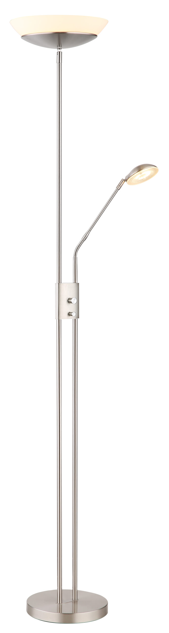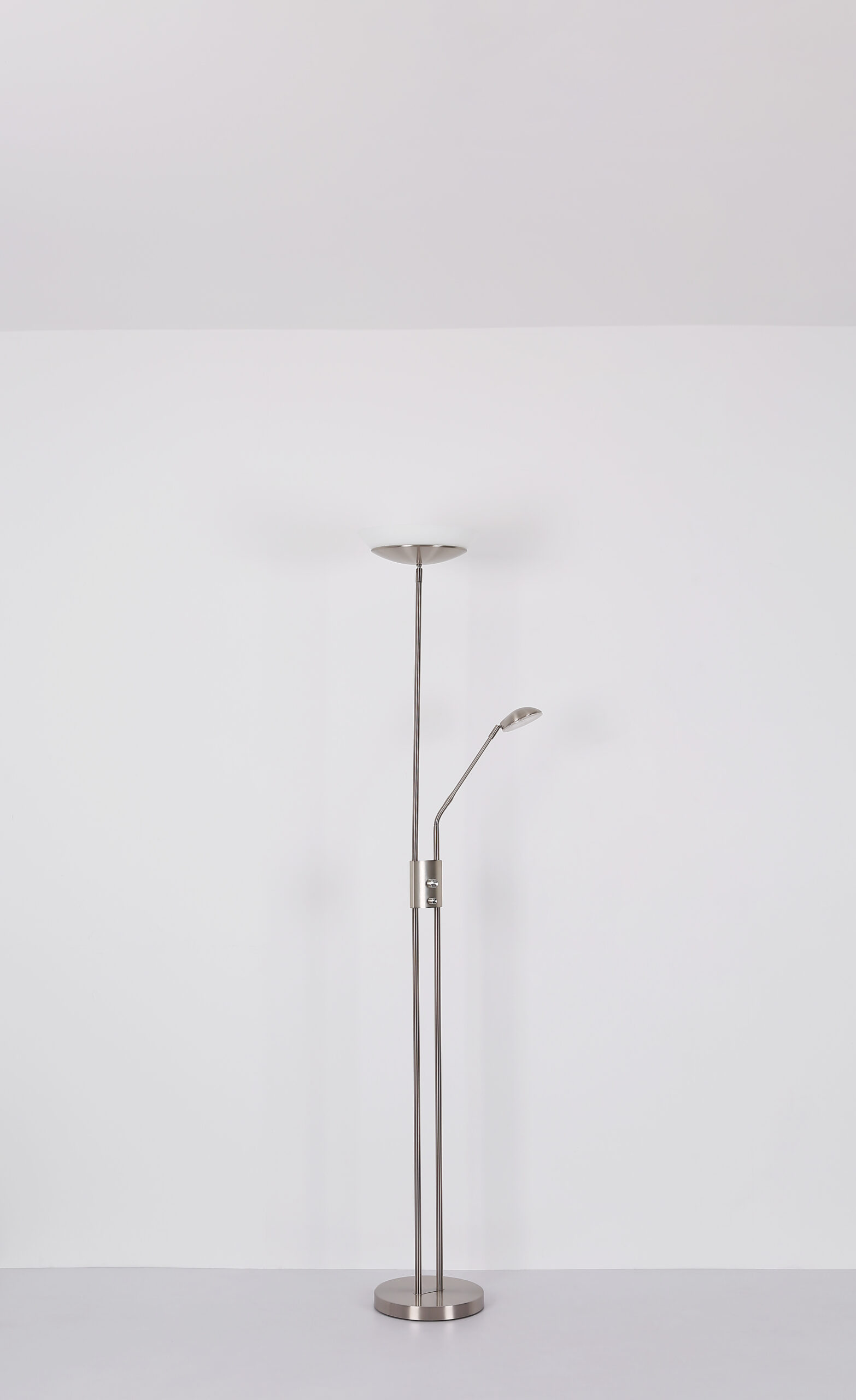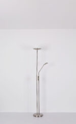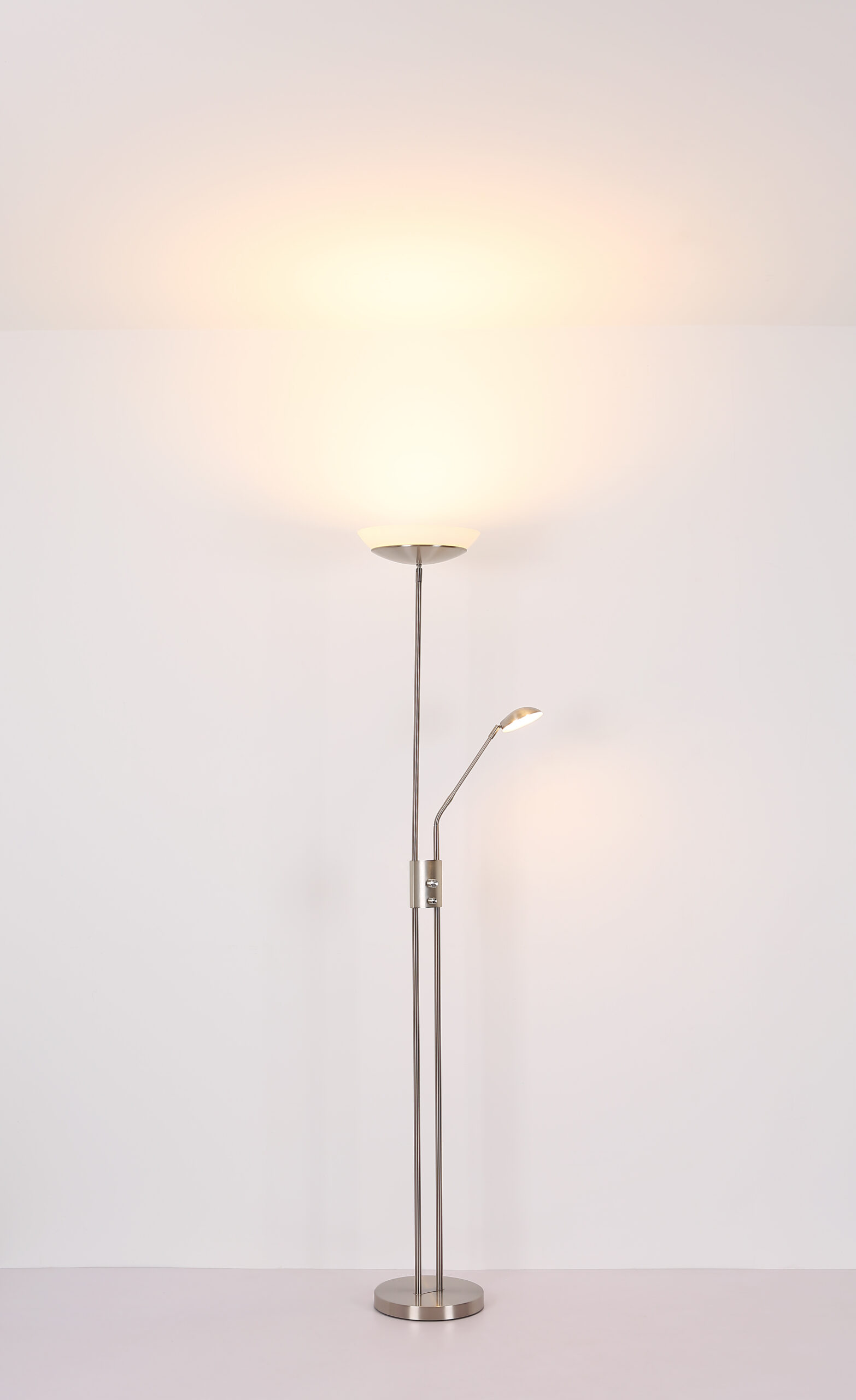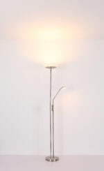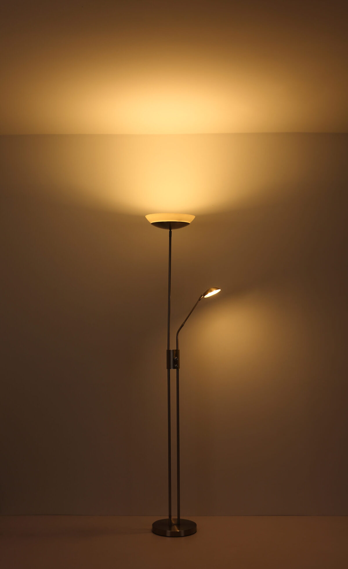 Zapanjujuća rasvjeta koja će vašoj sobi dati toplu atmosferu. Reflektor je napravljen od nikl mat metala i opal stakla koje emituje meku svjetlost. Plastika ima satensku završnu obradu i zaokružuje stilski izgled. Sa promjerom od 290 mm i visinom od 1800 mm, ova svjetiljka je prava privlačna za oči u svakoj prostoriji. Reflektor se može prigušiti i ima beskonačni dimer na dodir. Može se rotirati i okretati i ima flekso ruku. Svjetlo za čitanje ima prečnik 10,5 cm. Imajte na umu da se reflektor isporučuje isključujući 1x LED 18.5W 230V, koji ima intenzitet svjetlosti od 1370lm izlazne svjetlosti i temperaturu boje od 3000K. Svjetlo za čitanje napaja LED od 4,5W 230V, koji ima jačinu svjetlosti od 320lm i temperaturu boje od 3000K.