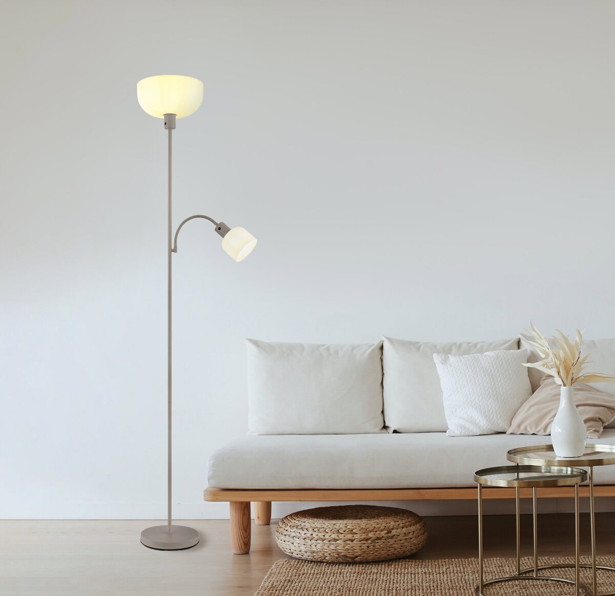 HINTON podna lampa impresionira svojim funkcionalnim dizajnom i toplim, domaćim izgledom. Metalno kućište boje pijeska, mat lakirano, ima moderan, ali nenametljiv izgled. Ravna cijev s integriranim LL utičnicom i fleksibilnim opcijama podešavanja omogućava precizan smjer svjetlosti – idealno za čitanje ili rad. Opalno plastično sjenilo osigurava ugodnu raspodjelu svjetla bez odsjaja. Praktično: prekidač se nalazi direktno na zastoru, što ga čini posebno lakim za dohvat. HINTON je savršen za postavljanje pored sofe, stolice za čitanje ili kreveta, a zahvaljujući jednostavnom dizajnu, harmonično se uklapa u širok izbor stilova enterijera. Lampa je opremljena grlom E27, što vam omogućava da slobodno odaberete izvor svjetlosti (nije uključen). Ovo vam omogućava da individualno prilagodite boju svjetla i svjetlinu svojim potrebama. Elegantna i funkcionalna rasvjeta za vaš dom.