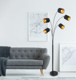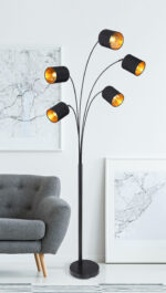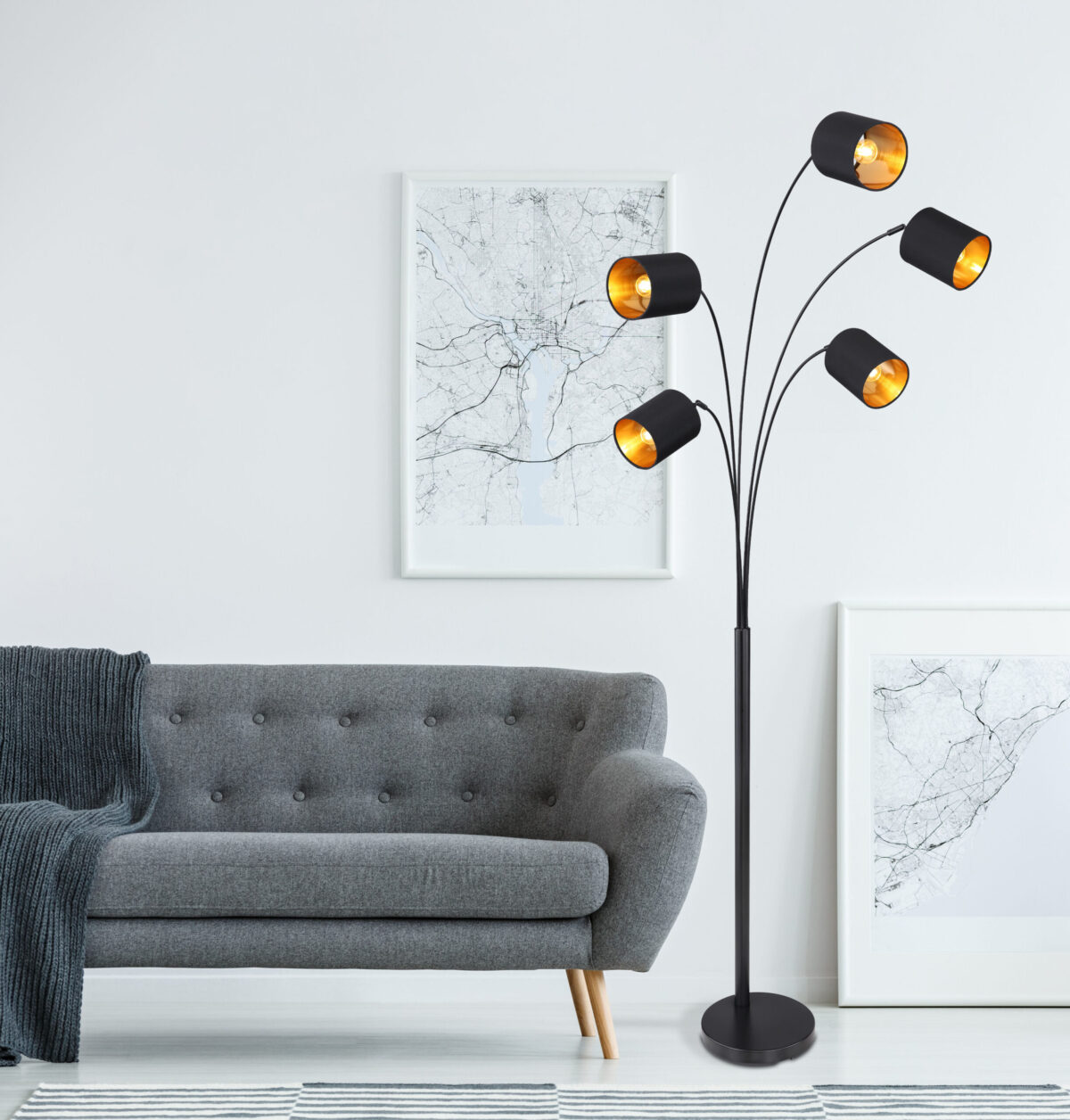 Ova podna lampa kombinuje klasični stil sa uzbudljivom kombinacijom materijala. Mat crna baza i mat crni abažuri. Zlatni listići unutar ovog abažura pružaju posebno svjetlo. Standardno E14 grlo ove podne lampe od 2,04 metra omogućava vam da slobodno odaberete sijalicu (maks. 40W). Zbog uštede energije i dugovečnosti preporučujemo LED lampe.