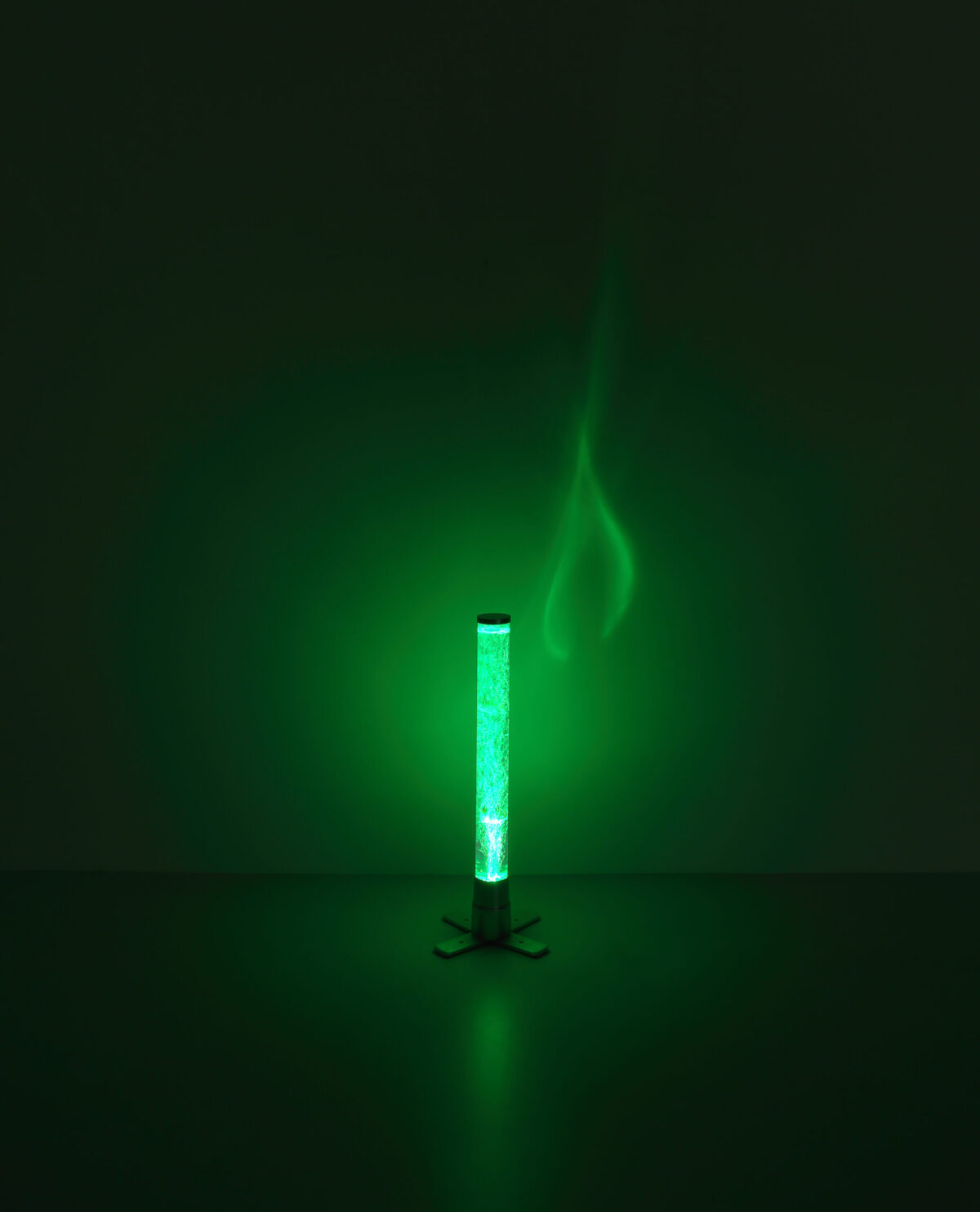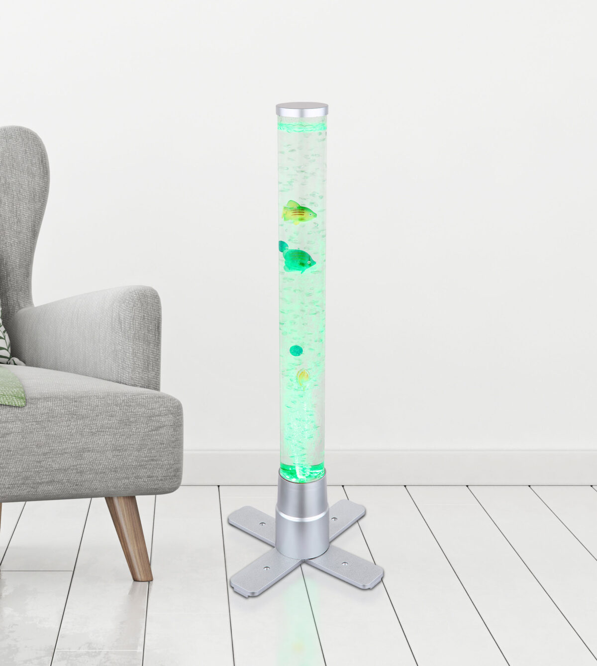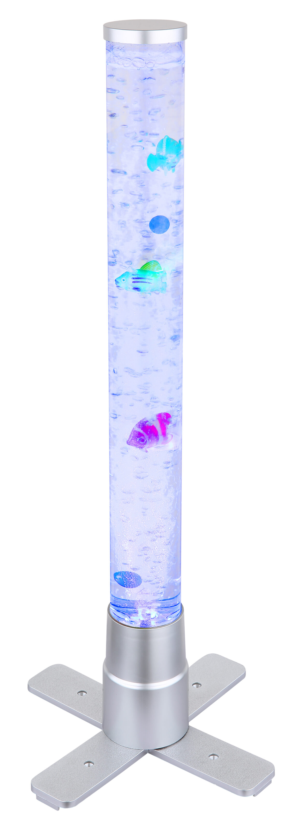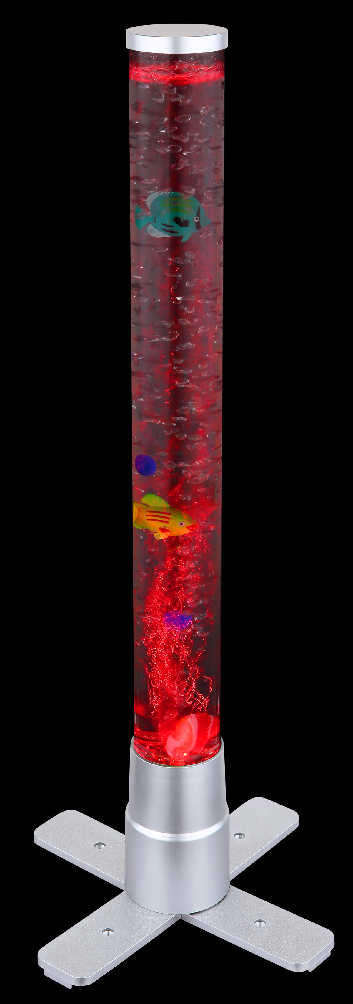 Ova sjajna podna lampa iz serije Mendoza inspiriše svojim jedinstvenim dizajnom. Iz noge viri cilindrična posuda visine 61 cm sa ukrasnim ribicama koje se kreću gore-dolje kroz dižuće mjehuriće zraka. Kroz RGB LED sijalicu u postolju, voda sija u različitim bojama i pruža odličan efekat.