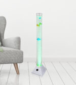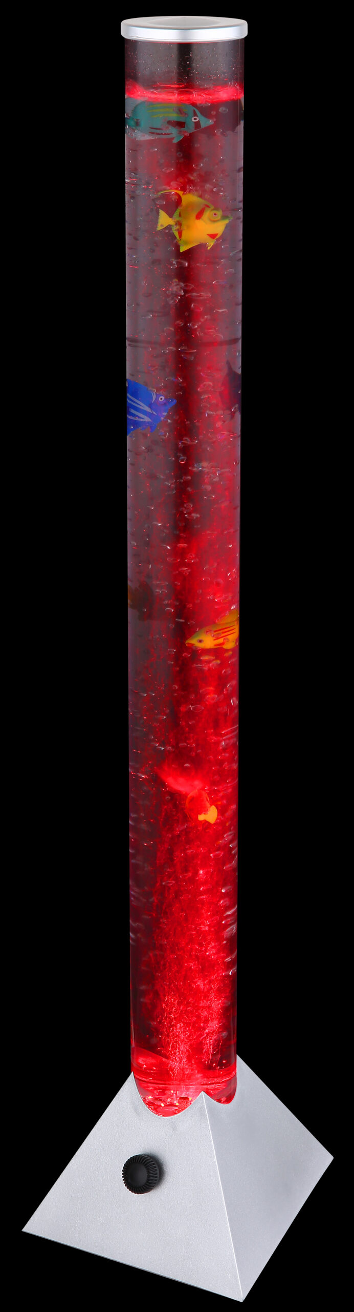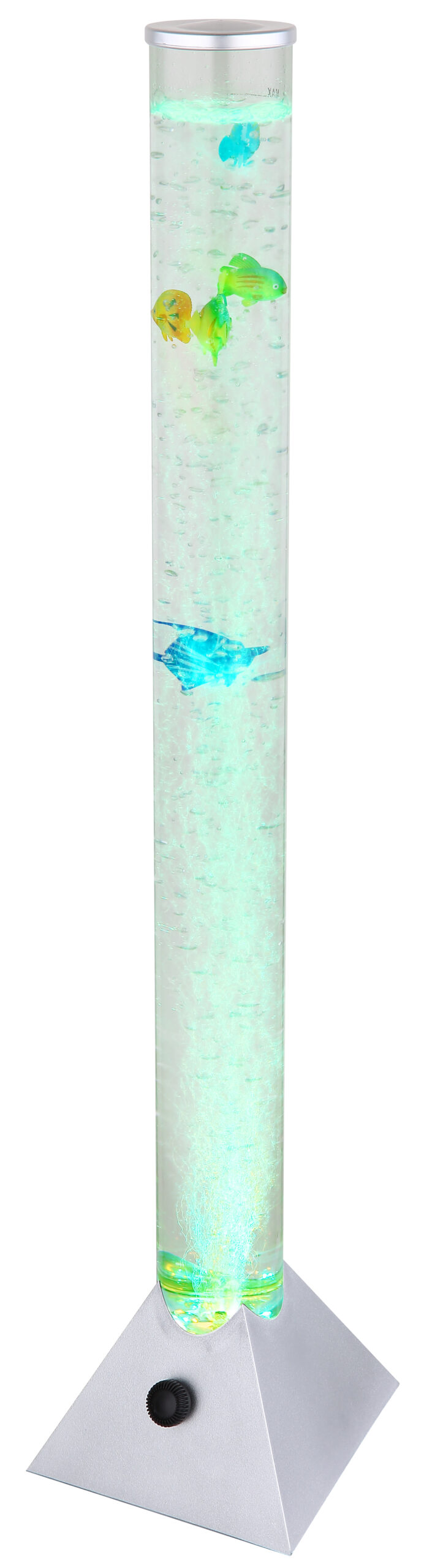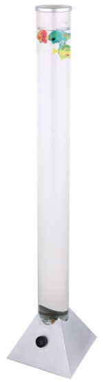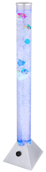 Ova sjajna podna lampa iz serije Mendoza inspiriše svojim jedinstvenim dizajnom. Iz stalka u obliku piramide viri cilindrična posuda visine 61 cm sa ukrasnim ribicama koje se kreću gore-dolje kroz dižuće mjehuriće zraka. Kroz RGB LED sijalicu u postolju, voda sija u različitim bojama i pruža odličan efekat.