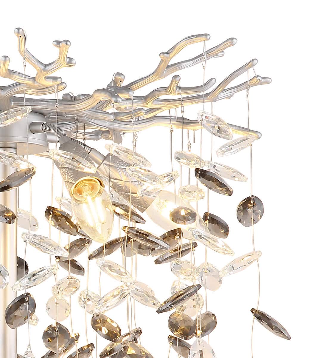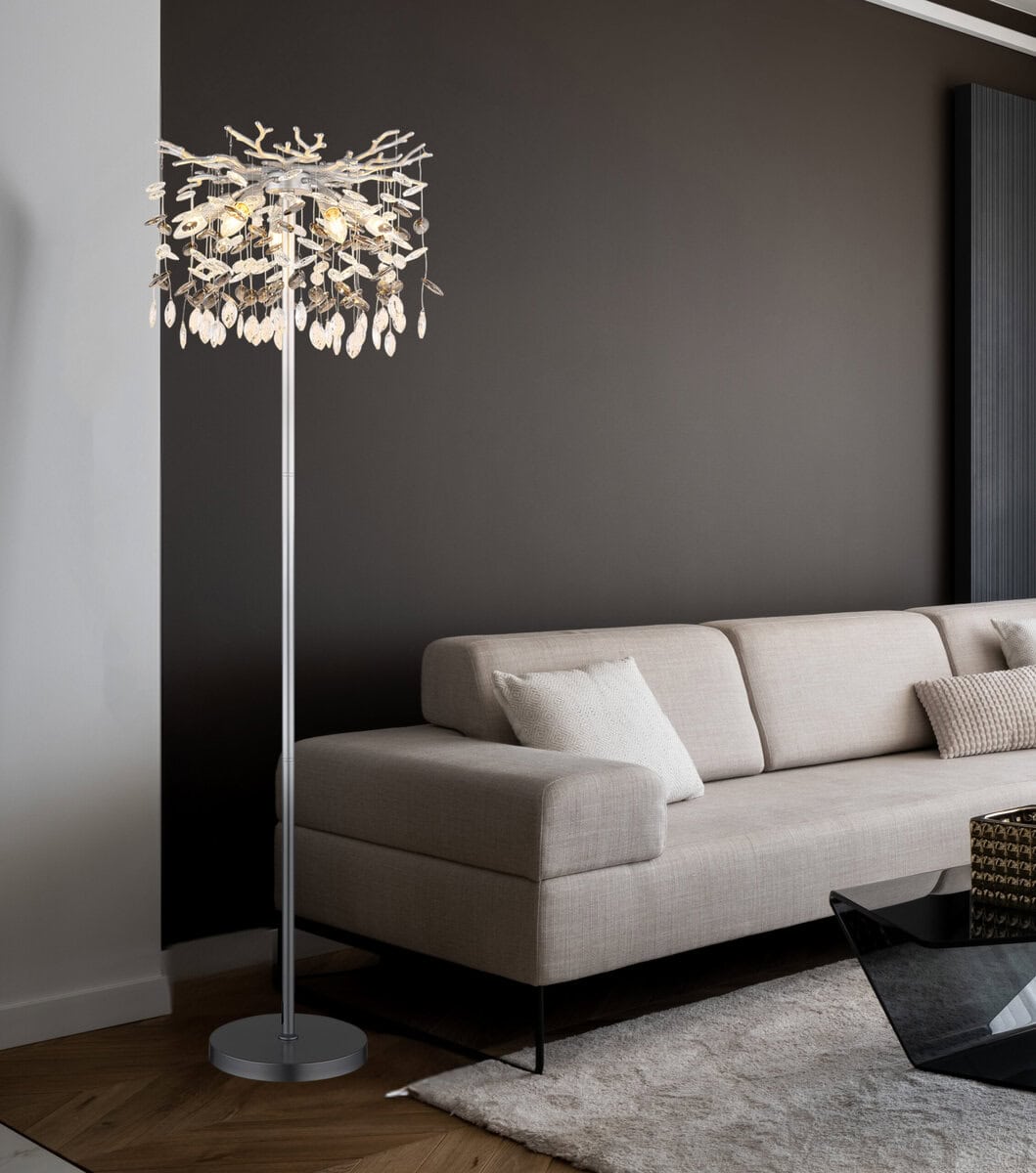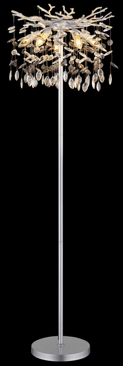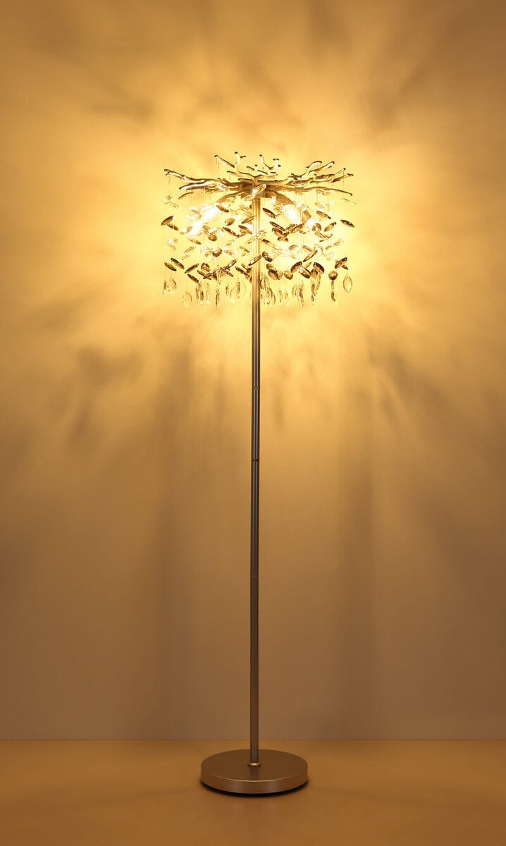 QUEENA – Okrugla podna lampa sa elegantnim kristalnim privescima. Okrugla podna lampa QUEENA impresionira svojim modernim dizajnom i visokokvalitetnom izradom. Umjetno razgranato tijelo od mat metala srebrne boje podsjeća na nježne grane i daje svjetiljci elegantan, ali prirodan izgled. Sjenilo napravljeno od svjetlucavih staklenih kristala u dimno sivoj i prozirnoj boji stvara impresivne refleksije svjetlosti i stvara toplu, privlačnu atmosferu u vašem dnevnom boravku ili spavaćoj sobi. Opremljen sa pet E14 utičnica, QUEENA pruža dovoljno svjetla, a zahvaljujući flekso elementima na utičnicama, izvori svjetlosti se mogu individualno podešavati kako bi se stvorili ciljani akcenti. Pogodno se upravlja preko nožnog prekidača u kablu, što omogućava praktično rukovanje. QUEENA kombinuje moderan izgled sa funkcionalnošću, postajući svetlucavi vrhunac u svakoj prostoriji. E14 sijalice nisu uključene.