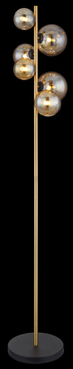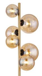 Ova fascinantna podna lampa serije RIha uvjerava sjajnim dizajnom. Iz okrugle crne mat baze viri cca. 1,6 m veliki metalni štap od prekrasnog mesinga, opremljen sa šest različitih veličina G9 LED lampi i svaka staklenim sjenilom u ćilibaru. G9 LED žarulje emituju toplo bijelo svjetlo od 3000 Kelvina i tako stvaraju ugodnu atmosferu. Sa ostalim modelima ove serije možete savršeno upotpuniti svoj dnevni boravak.