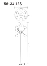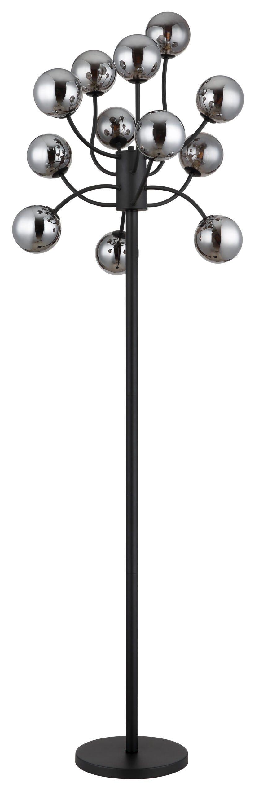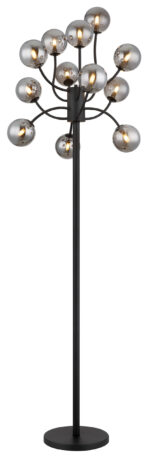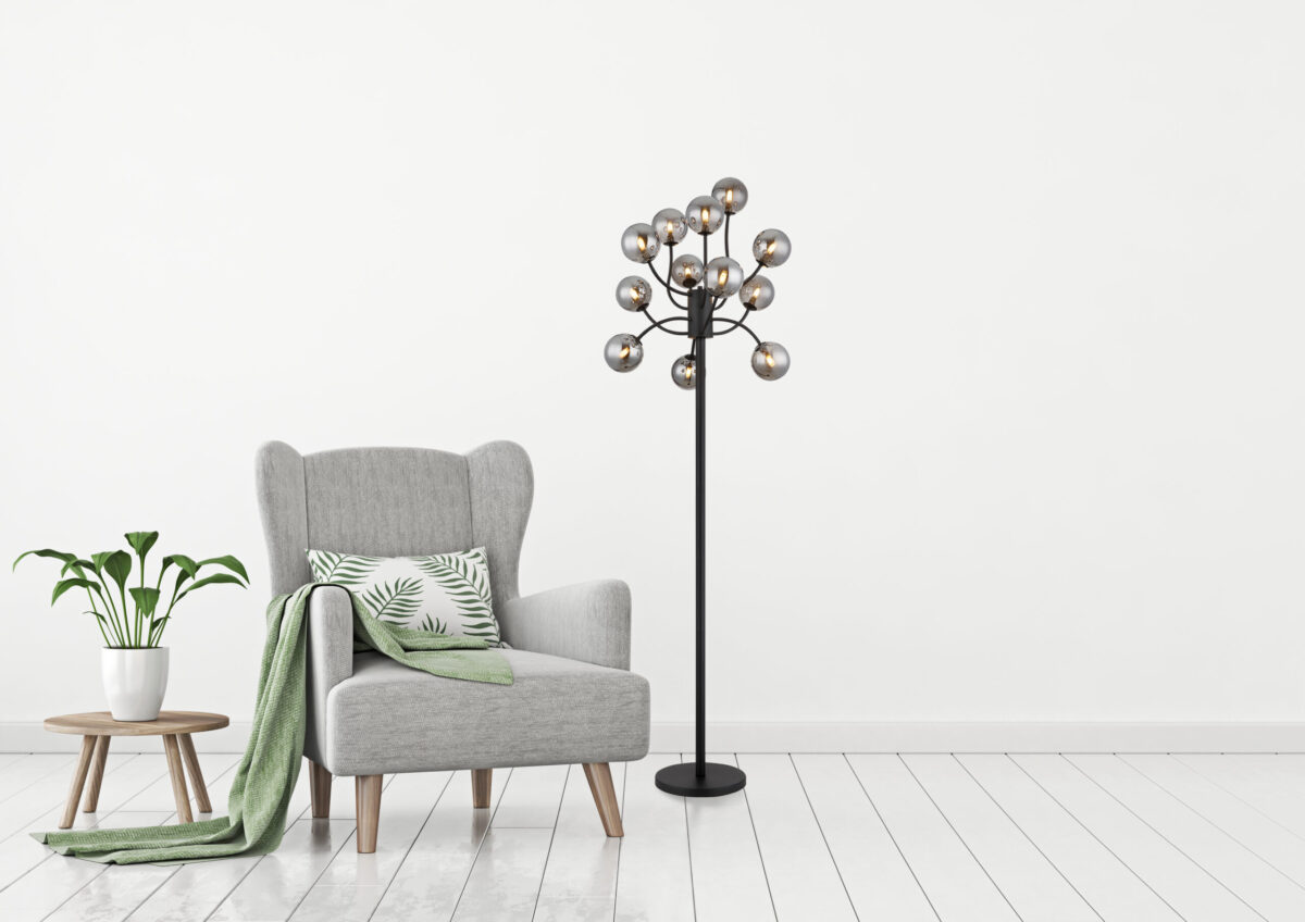 Podna lampa RIHA impresionira svojim dizajnom i 12 zakrivljenih krakova ukrašenih staklenim kuglicama u boji dima. Crno metalno tijelo i nožni prekidač u kabelu nude funkcionalnost i eleganciju. Sa svetlosnom snagom od 130 lumena i svetlosnom temperaturom od 3000 K, ova svetiljka pruža meko i privlačno osvetljenje. Idealno za moderne dnevne sobe ili kutke za čitanje kojima je potreban moderan izvor svjetlosti.