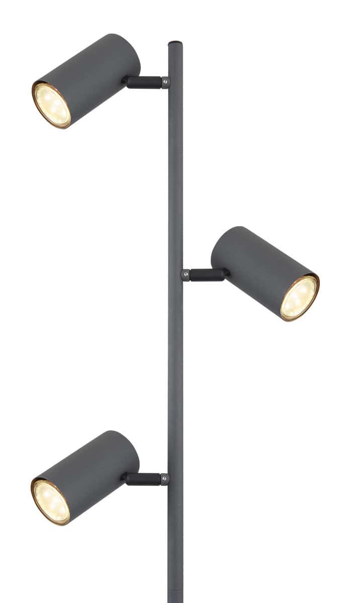 Ova podna lampa visoka 154 cm iz Robby serije je prekrasan dodatak vašem interijeru. Napravljena od metala u boji grafita, podna lampa se sastoji od okruglog metalnog postolja u izgledu drveta, na koji je pričvršćena šipka sa tri okretna, metalom obložena GU10 grla. One mogu biti opremljene LED sijalicama po Vašem izboru, što Vam daje mogućnost da individualno odredite boju svjetla i svjetlinu. Osim toga, ima uključen prekidač pomoću kojeg se svjetiljka može jednostavno uključiti i isključiti. Sa ostalim modelima iste serije možete upotpuniti cjelokupnu sliku u svoja četiri zida.