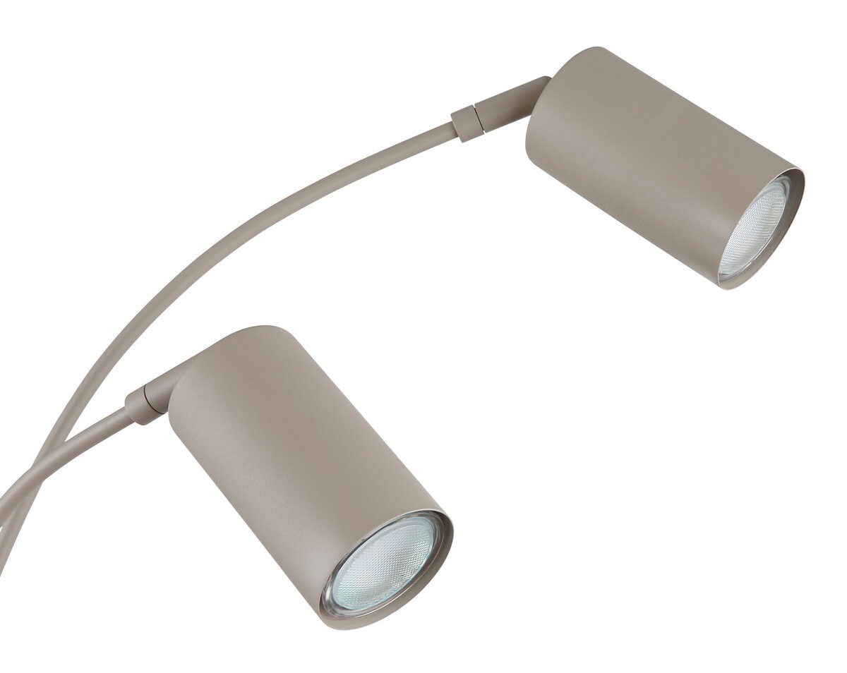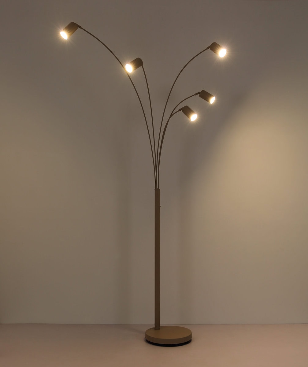 Podna lampa ROBBY impresionira svojim modernim i funkcionalnim tehničkim dizajnom. Okrugla baza i ravna cijev pružaju stabilnu osnovu, dok 5 zakrivljenih krakova daju lampi karakterističan, dinamičan izgled. Metalna konstrukcija mat boje pijeska harmonično se uklapa u različite koncepte prostorija i daje suptilan, ali moderan naglasak. Metalne sjenila u mat boji pijeska savršeno prikazuju lampu i stvaraju ugodno osvjetljenje. Preklopni prekidač na predmetu omogućava jednostavno rukovanje. Podna lampa se isporučuje bez GU10 sijalice, tako da možete odabrati izvor svjetlosti prema vašim ličnim željama. Uz visinu i širinu koja je čini pogodnom i za manje i za veće prostore, ROBBY podna lampa je idealan izbor za moderne dnevne ili radne prostore.
