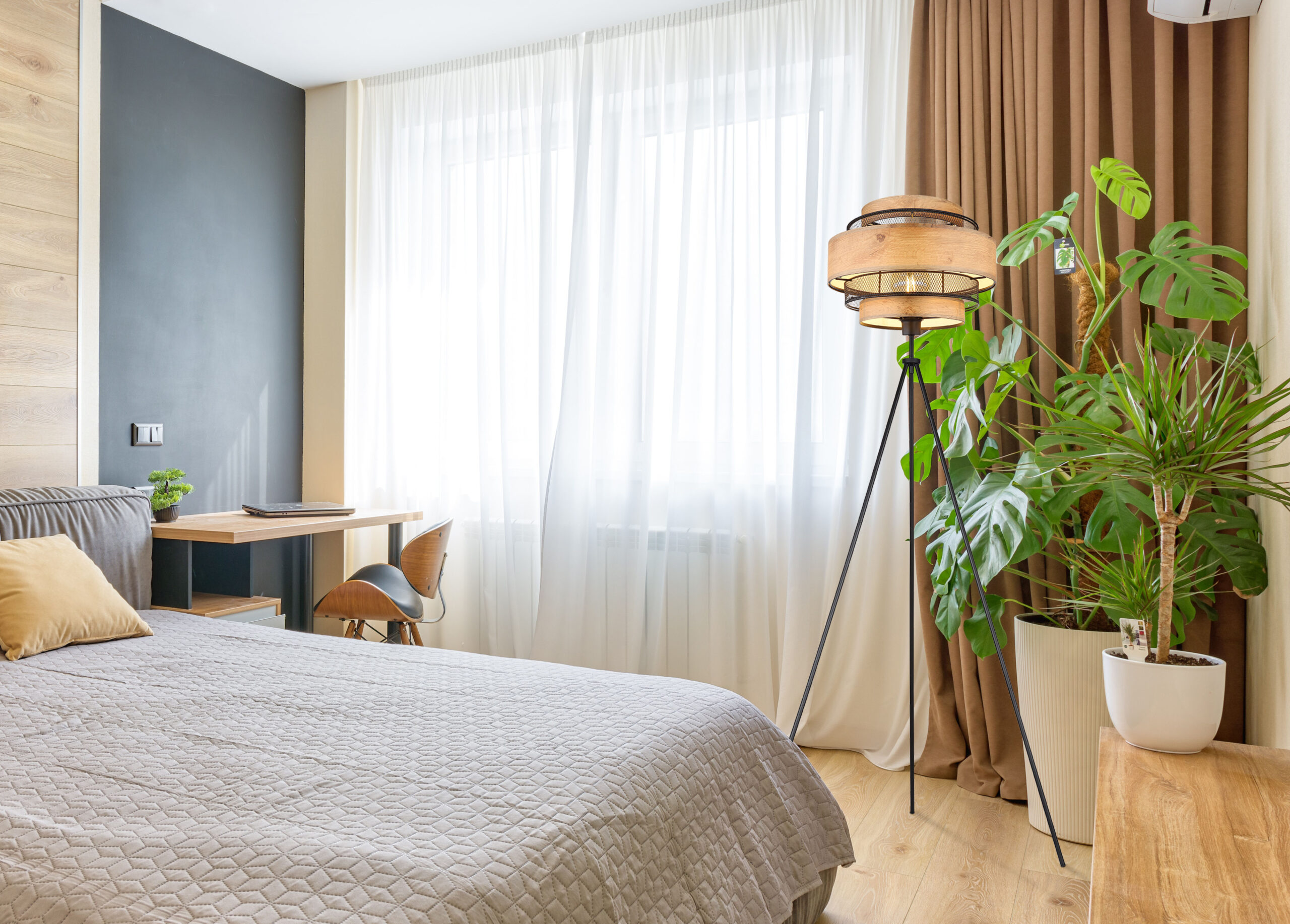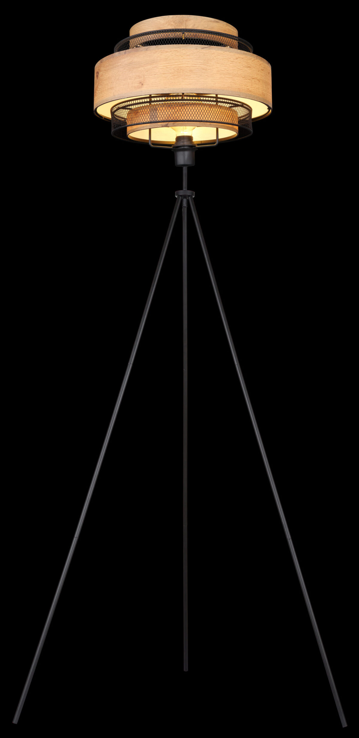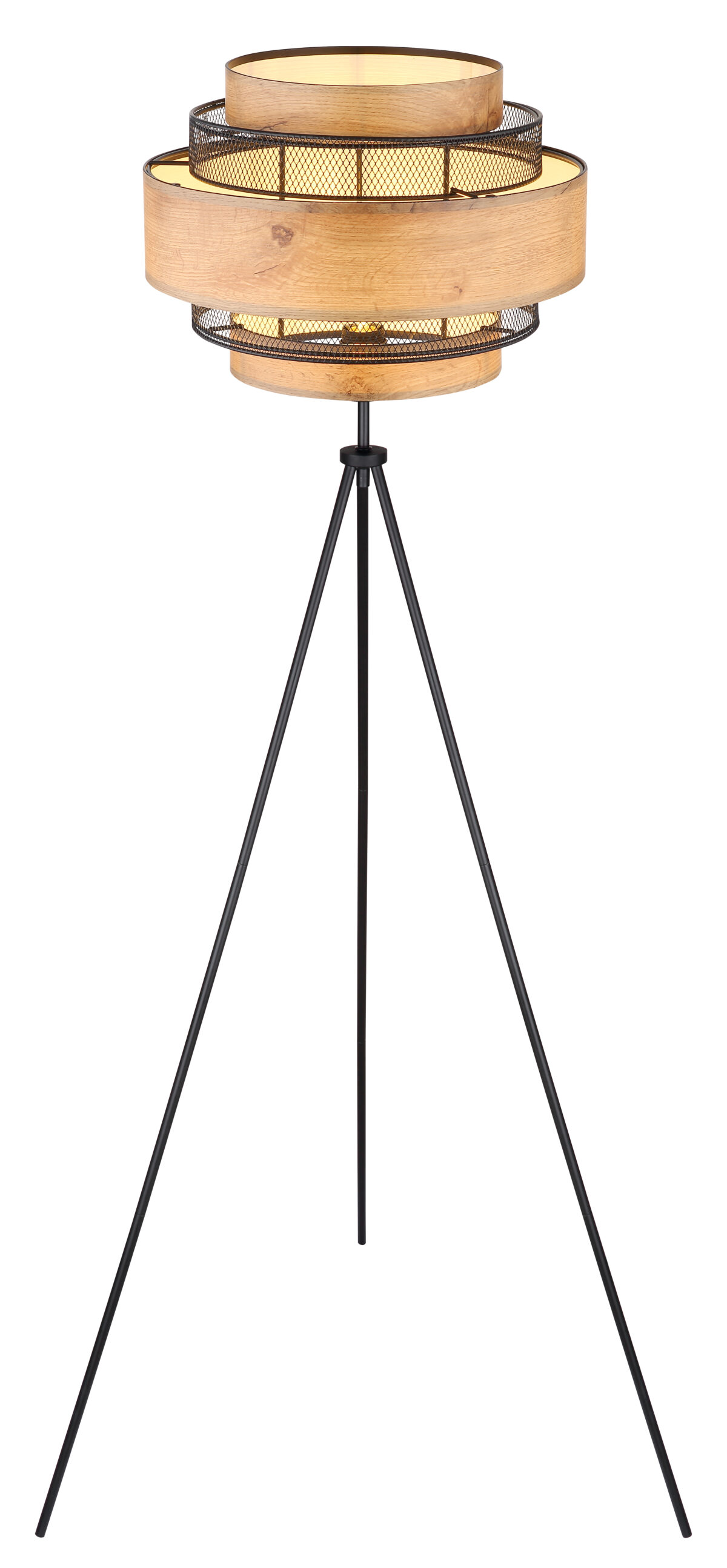 Ova sjajna podna lampa inspiriše svojim jednostavnim dizajnom. Iz crnog mat stativa od metala viri E27 utičnica na visini od 1,5m. Utičnica E27 je opremljena prelijepom sjenilom od metalnih rešetki i ukrasa u izgledu drveta (Ø60cm). Omogućava vam da odredite boju svjetla i svjetlinu do maksimalne snage od 40 vati.