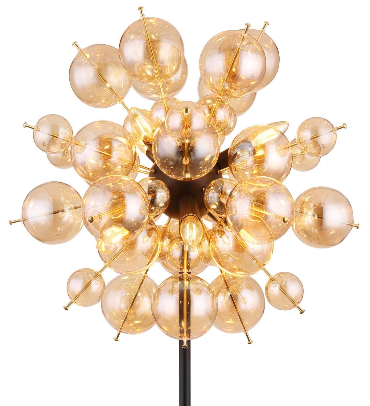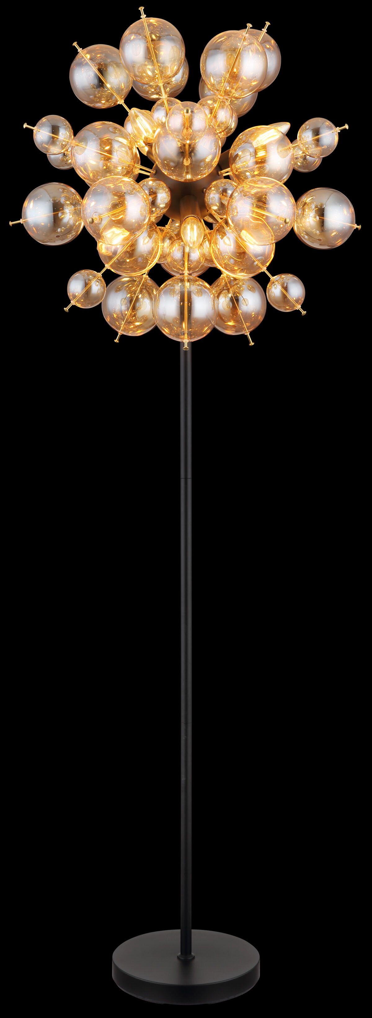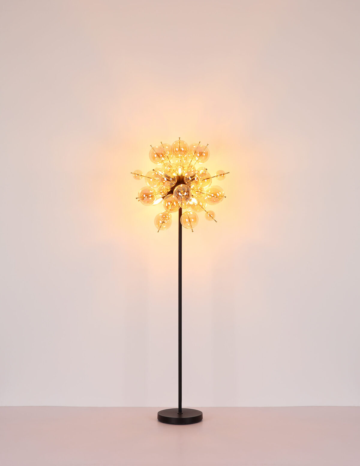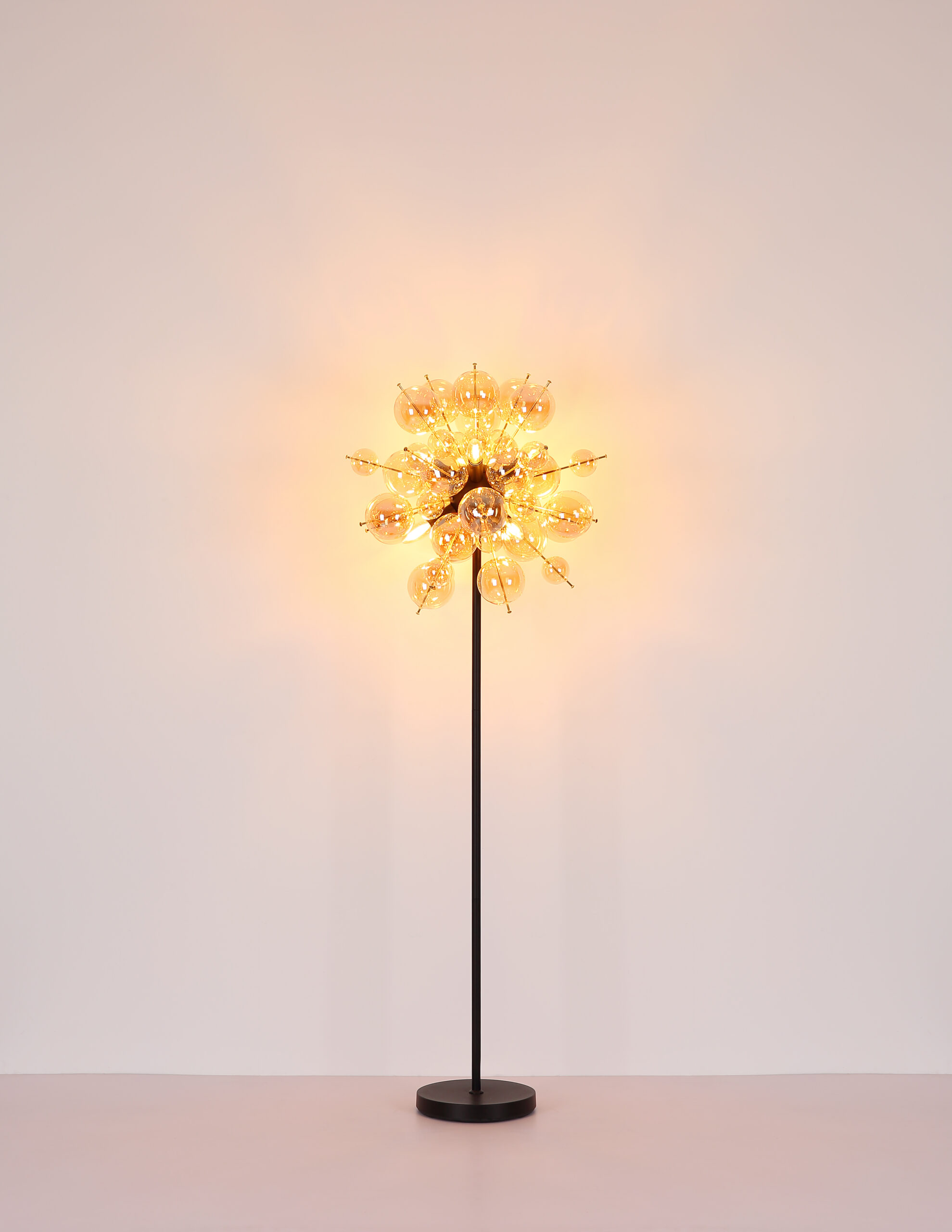 Podna lampa UDO kombinuje moderan dizajn sa daškom ekstravagancije. Sa svojim zaobljenim i elegantnim izgledom, prava će privući oči u svakoj prostoriji. Šipke lampe su opremljene kuglicama različitih veličina, što čini zanimljiv i razigran izgled. Tijelo UDO podne lampe izrađeno je od mat crnog metala, dok su kugle na šipkama zlatne boje. Ova kombinacija daje lampi plemenit i moderan karakter. Sjenilo je napravljeno od staklenih kuglica boje ćilibara koje proizvode toplo i ugodno svjetlo. Sa prečnikom od 550 mm, ova podna lampa pravi je vrhunac i postavlja stilski naglasak u svakoj prostoriji. Nožni prekidač u kablu olakšava paljenje i gašenje svjetla bez saginjanja. Dajte svom životnom prostoru moderan i ekstravagantan dodir uz UDO podnu lampu. Uronite svoj dom u toplo i ugodno svjetlo i uživajte u jedinstvenoj atmosferi.