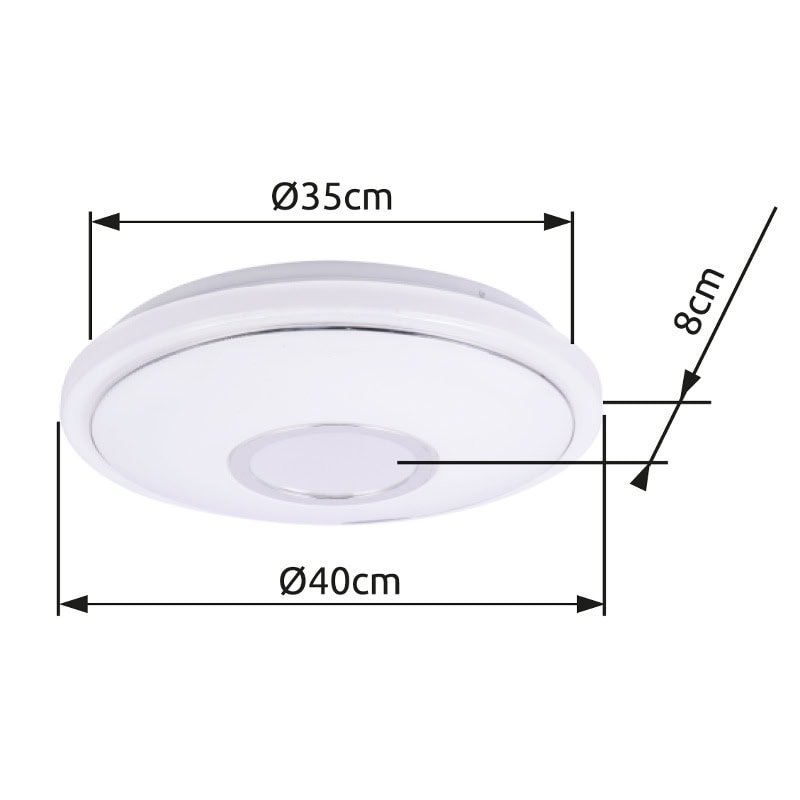 Ova klasična, elegantna plafonska lampa CONNOR (Ø 40 cm) od belog akrila sa blistavim dekorom daje performanse i funkcionalnost. Pomoću priloženog daljinskog upravljača i CCT funkcije, boja svjetla može se regulirati i fiksirati u nekoliko faza između ugodnog toplog bijelog 3000K i 6000K hladno bijelog svjetla. Sa uključenom LED sijalicom od 16 W, ova plafonska lampa pruža maksimalno 1040 lumena jakog svetla, može se prigušiti po želji i prilagoditi odgovarajućoj situaciji. Zahvaljujući integrisanoj RGB 3 Watt LED sijalici, ova unutrašnja lampa omogućava da vaša soba zasija u različitim bojama koje odgovaraju raspoloženju. Željena boja se takođe može popraviti. Osim toga, ova lampa ima funkciju noćnog svjetla i funkciju memorije. Ovom Smartlight lampom se lako može upravljati pomoću aplikacije Tuya Smart (Android TM/IOS). Upravljanje glasom je jednostavno uz Amazon Echo Tm ili Google Home.