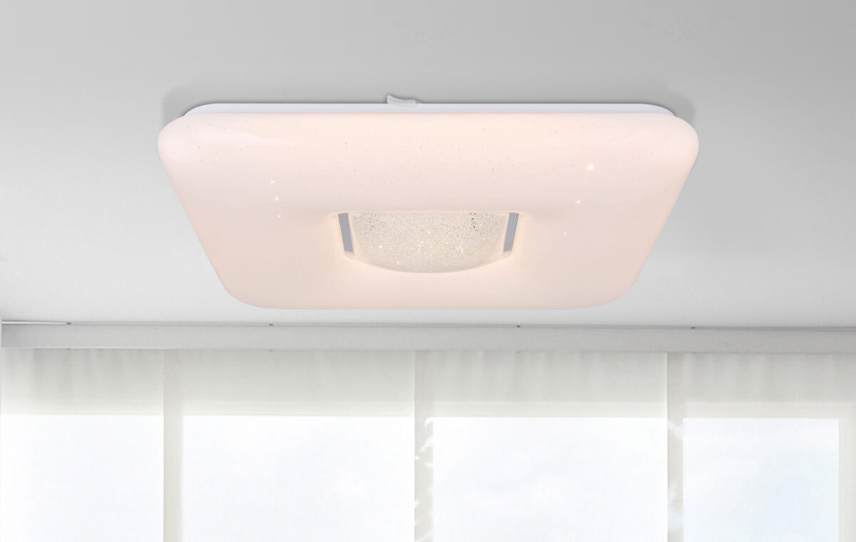 Ova elegantna, kvadratna plafonska lampa TRYSTAN (55 x 55 cm) od belog akrila sa blistavim dekorom daje performanse i funkcionalnost. Prozirni plastični kristali daju ovoj lampi izuzetan izgled. Pomoću priloženog daljinskog upravljača i funkcije CCT, boja svjetla može se regulirati i fiksirati u nekoliko koraka između ugodnog toplog bijelog 3000K i 6400K hladnog bijelog svjetla. Sa uključenom LED sijalicom od 48 vati, ova plafonska lampa obezbeđuje maksimalno 3200 lumena svetlosti, može se prigušiti po želji i prilagoditi situaciji. Zahvaljujući integrisanoj RGB LED sijalici od 6 vati, ova unutrašnja lampa omogućava da vaša soba zablista u različitim bojama koje odgovaraju raspoloženju. Željena boja se takođe može popraviti. Osim toga, ova lampa ima funkciju noćnog svjetla i funkciju memorije. Ovom Smartlight lampom lako se upravlja pomoću aplikacije Tuya Smart (Android TM/IOS). Upravljanje glasom je jednostavno uz Amazon Echo Tm i Google Home.